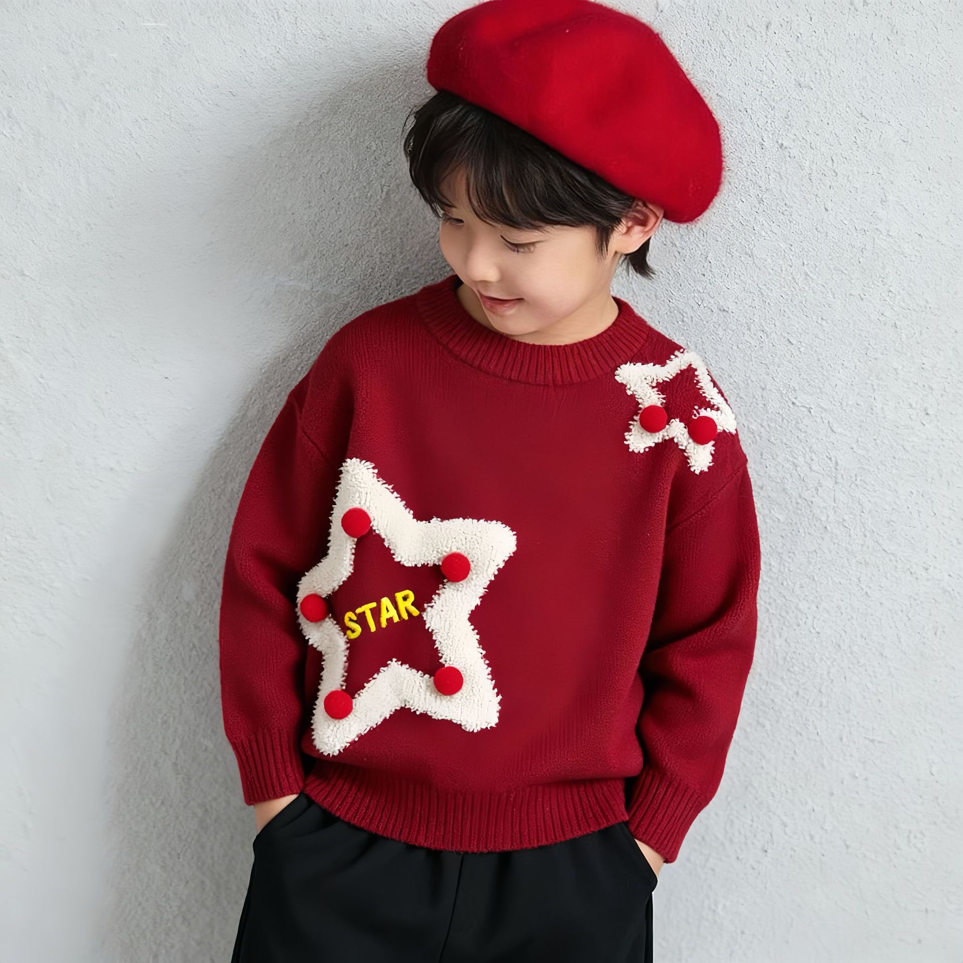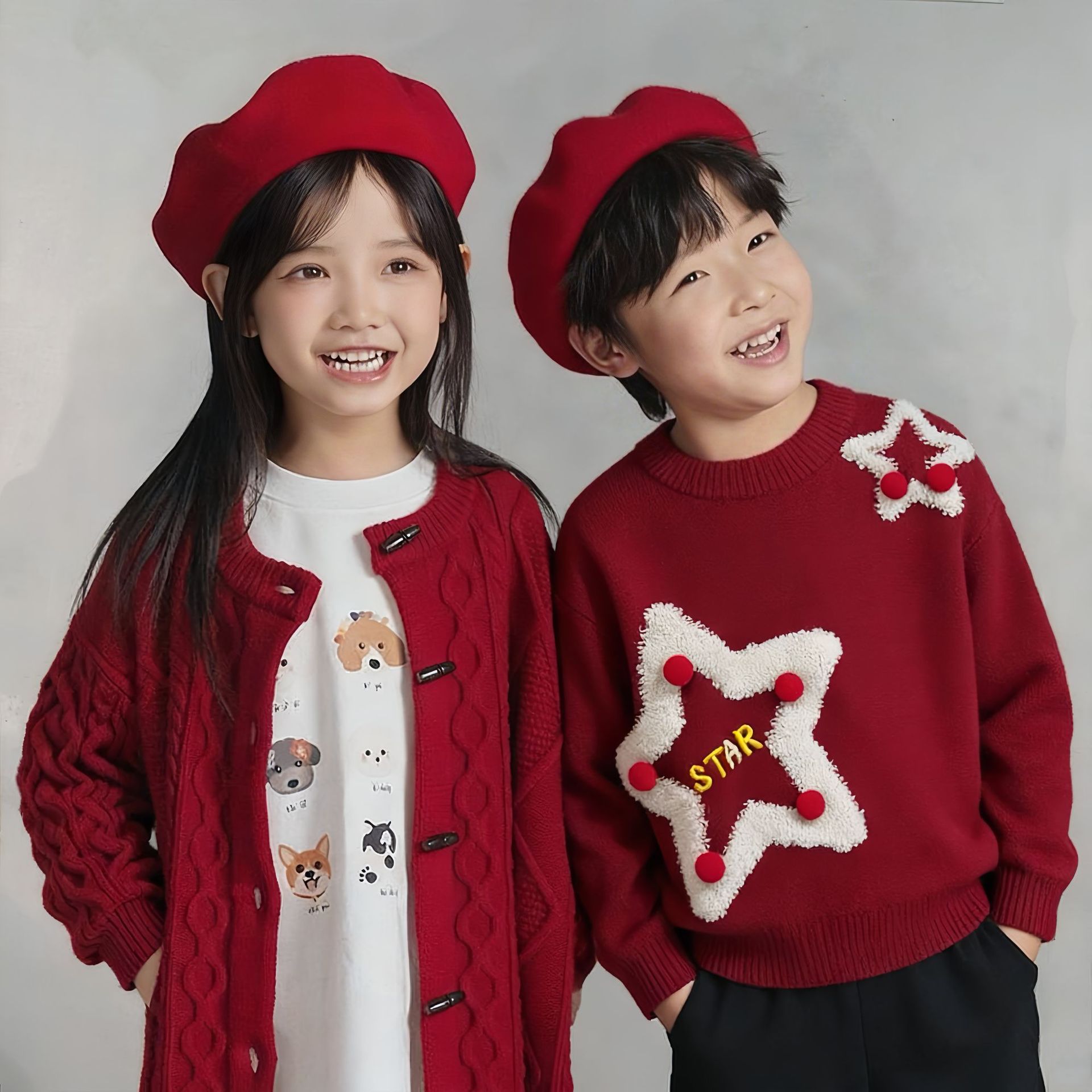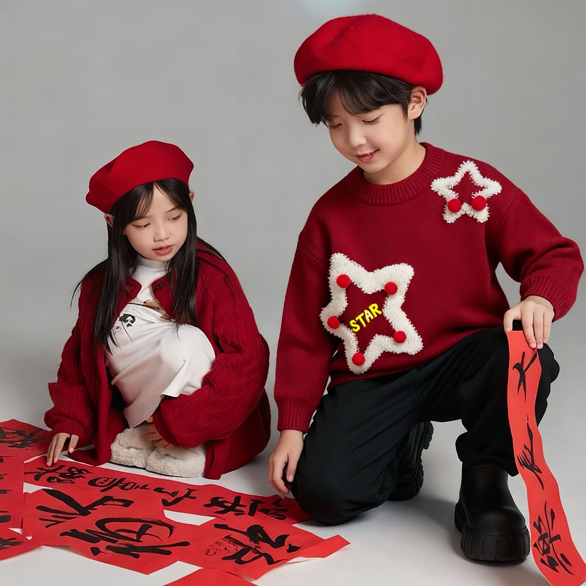 【柔软保暖舒适❗️新年仪式感满满】2026新年春节姐弟毛衣秋冬新款男女童过年红色五角星百搭圣诞针织新年红色上衣。jc