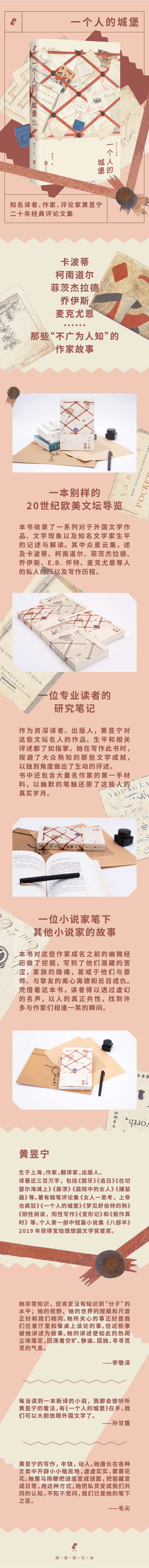 黄昱宁,生于上海,作家,翻译家,出版人。译著近三百万字,包括《甜牙》《追日》《在切瑟尔海滩上》《崩溃》《庭院中的女人》《捕鼠器》等。著有随笔评论集《女人一思考,上帝也疯狂》《一个人的城堡》《梦见舒伯特的狗》《阴性阅读,阳性写作》《变形记》和《假作真时》等。个人第一部中短篇小说集《八部半》2019年获得宝珀理想国文学奖首奖。