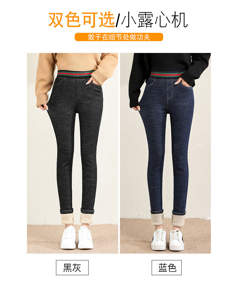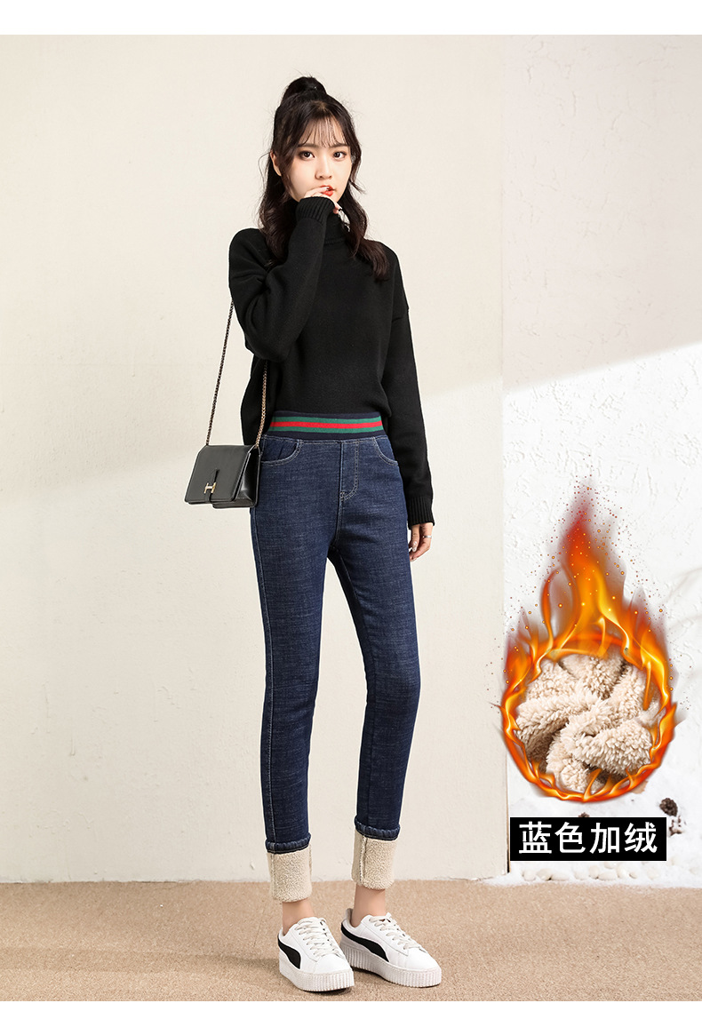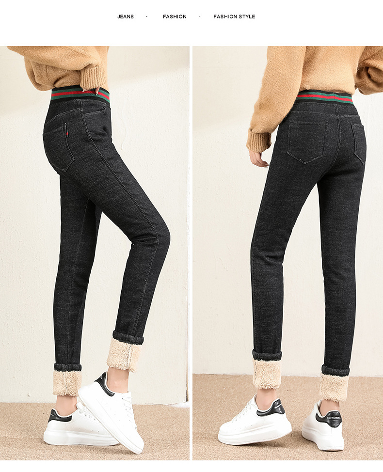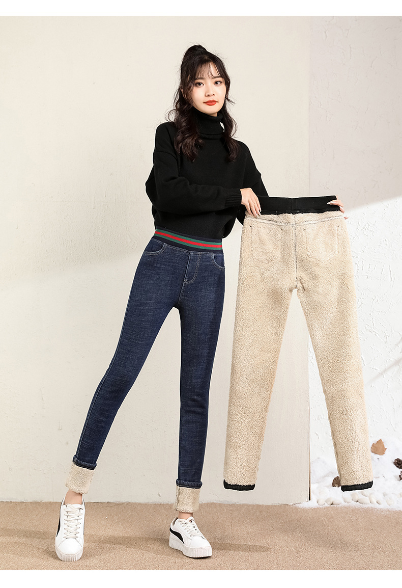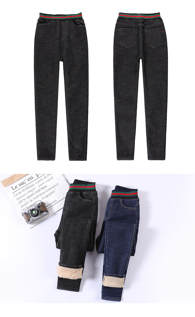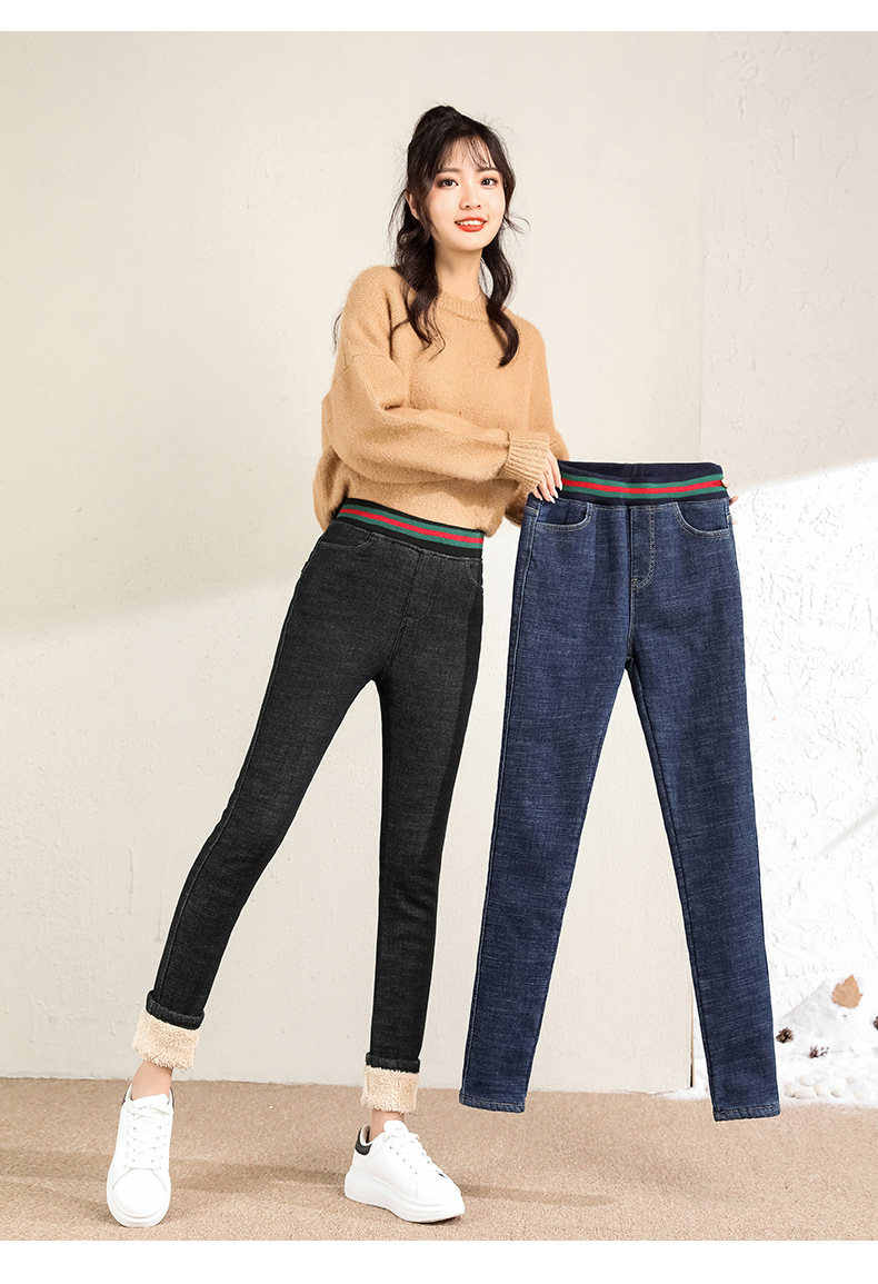 百媚生 松紧腰加厚羊羔绒牛仔裤高腰铅笔裤9090