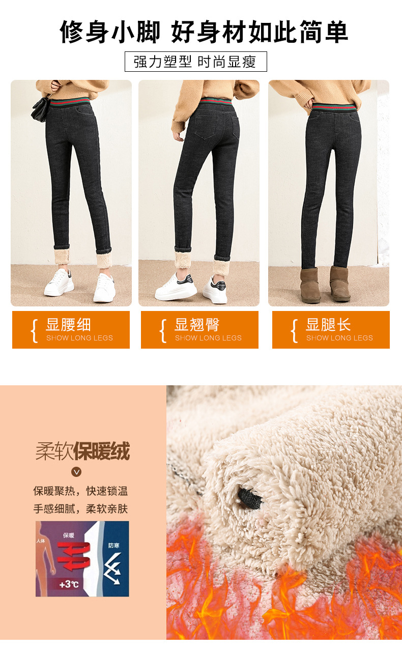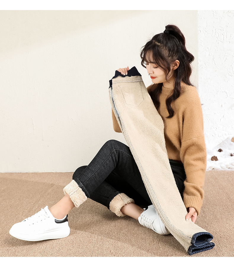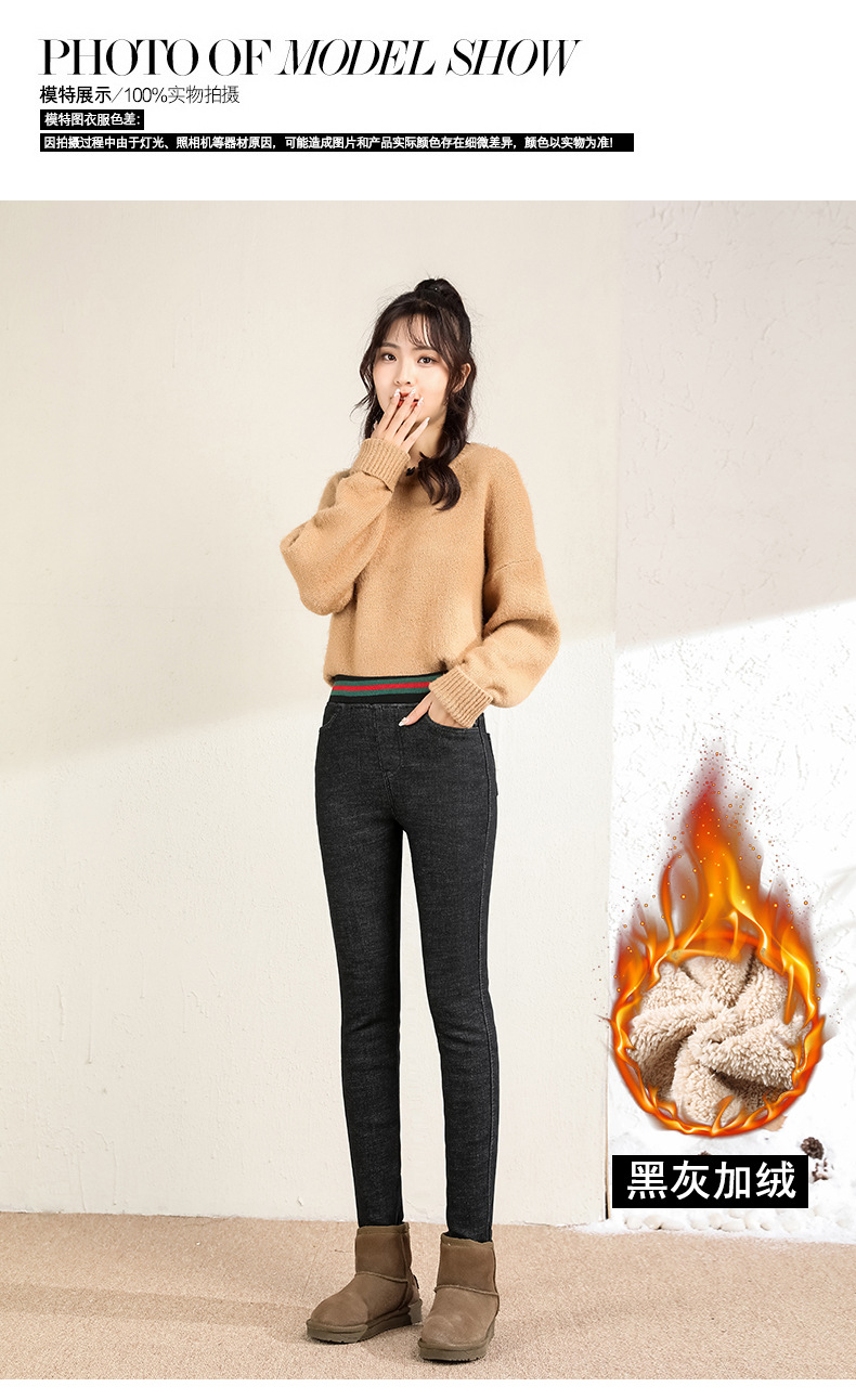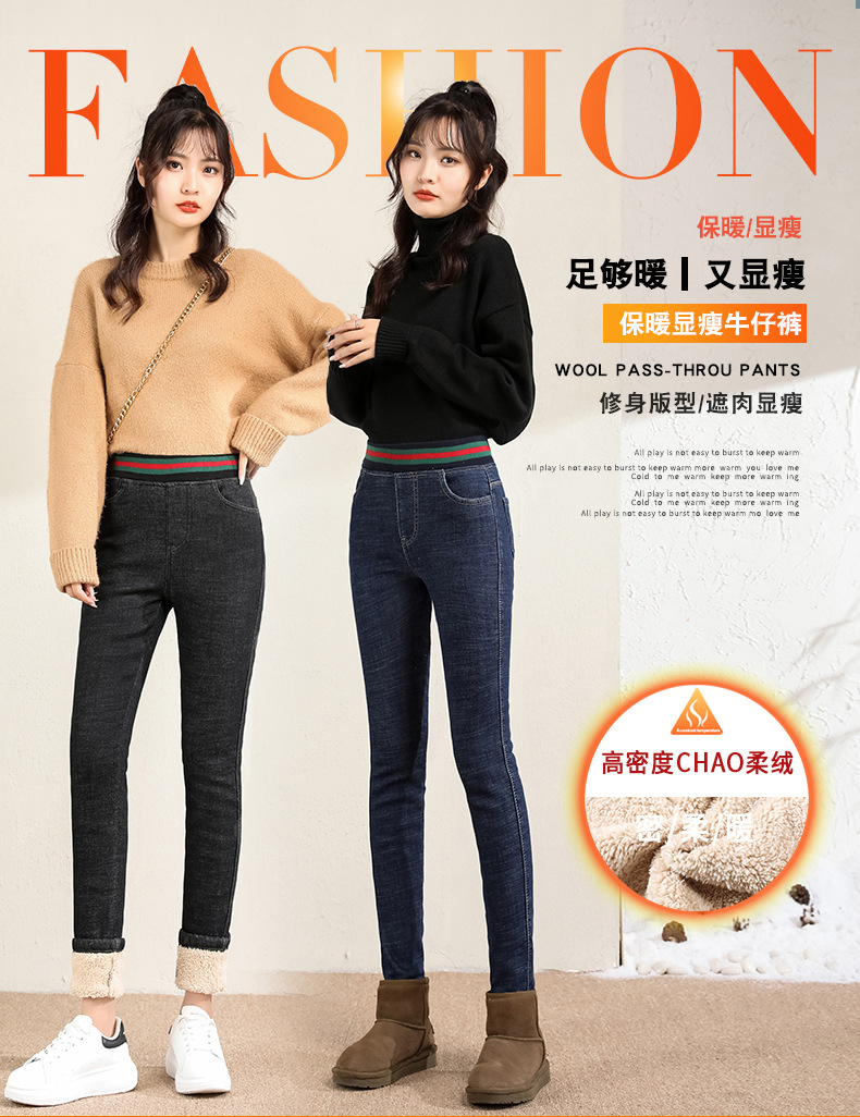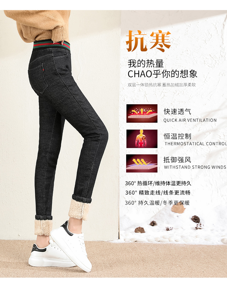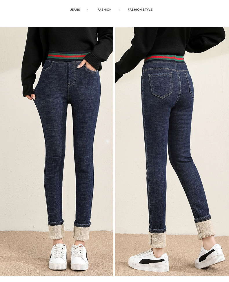 百媚生 松紧腰加厚羊羔绒牛仔裤高腰铅笔裤9090
