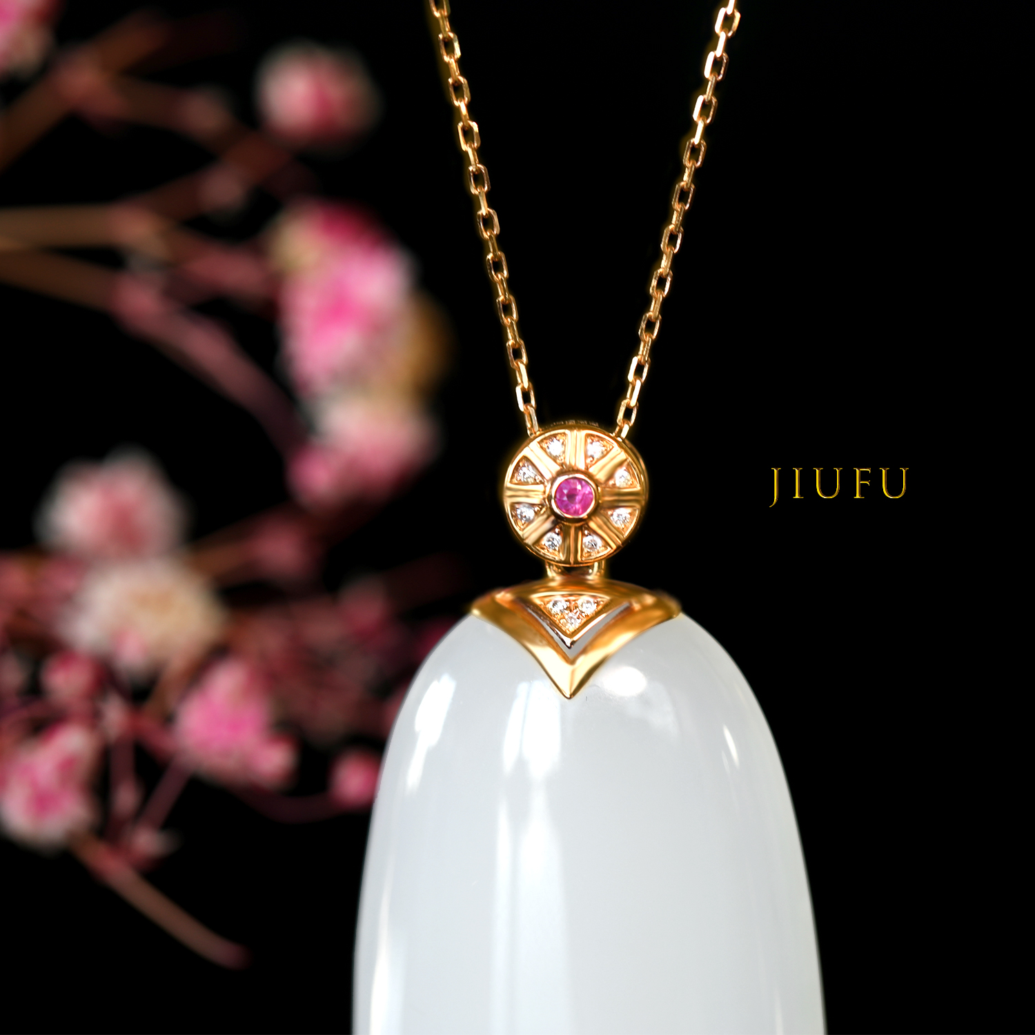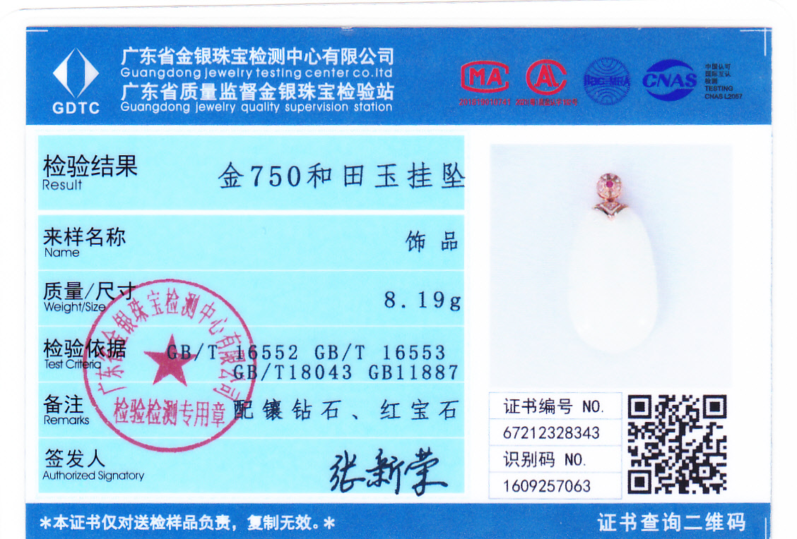 18k玫瑰金和田玉(白玉)吊坠