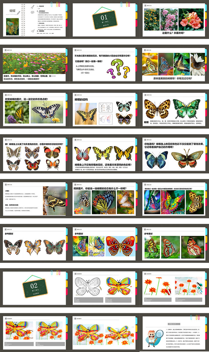 在春暖花开的时候,蝴蝶在花丛中飞来飞去,你又见过蝴蝶吗?不同的种类,它们的花纹都不一样,有长方形的,有三角形的,有圆形的····如果你仔细观察会发现发现蝴蝶还有着许多美丽的花纹,在今天的创作中,描绘出自己喜欢的蝴蝶造型,尝试用对称的方法装饰蝴蝶的翅膀,丰富画面装饰效果。