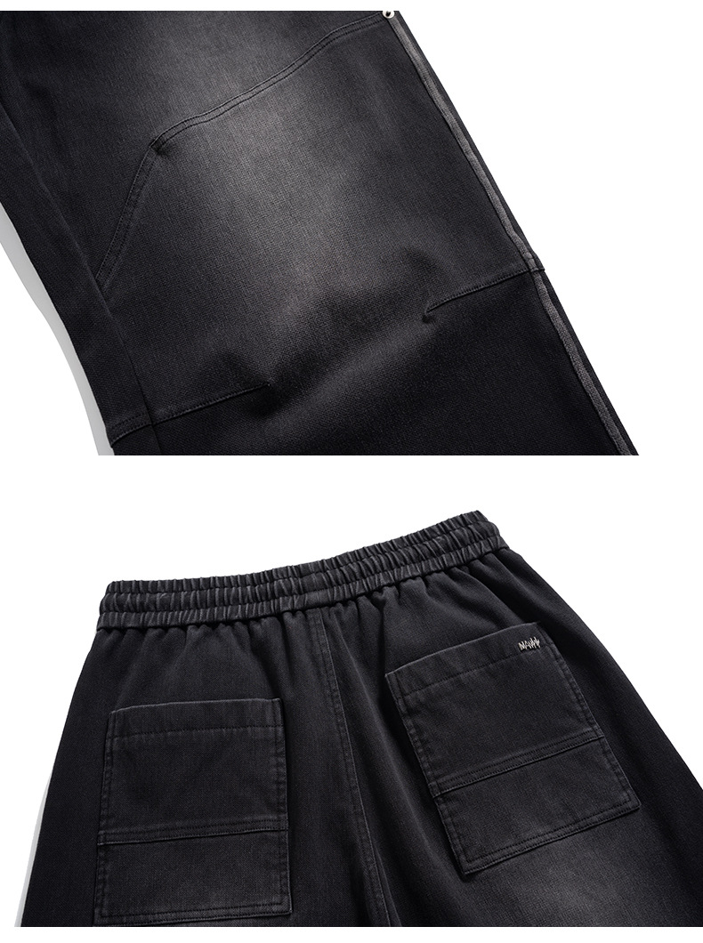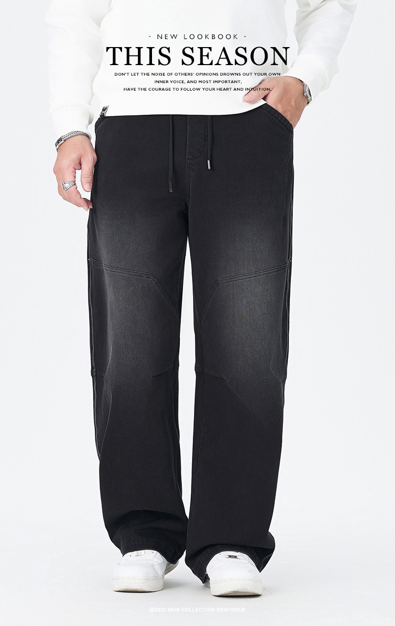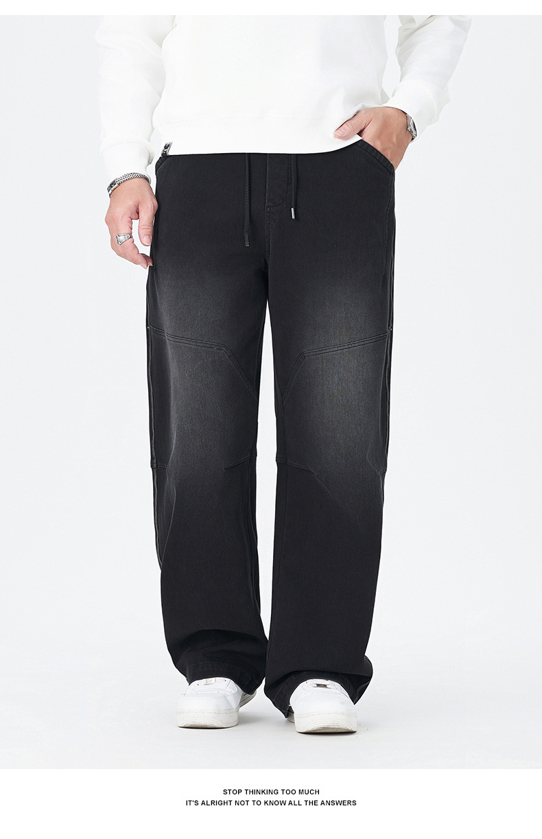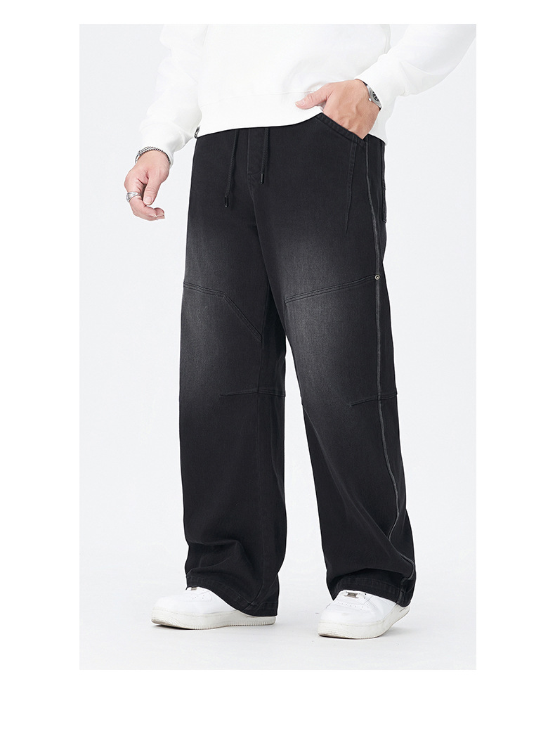【100%棉】【DMH】大依优型大码男阔腿裤牛仔裤休闲下装美式高街牛仔裤潮流松紧腰纯棉复古拼接做旧加肥宽松阔腿裤子男300斤