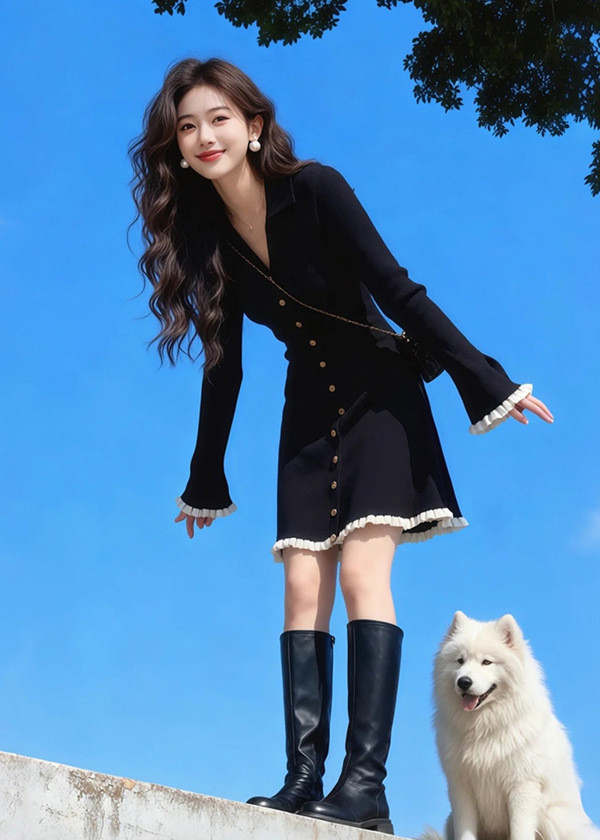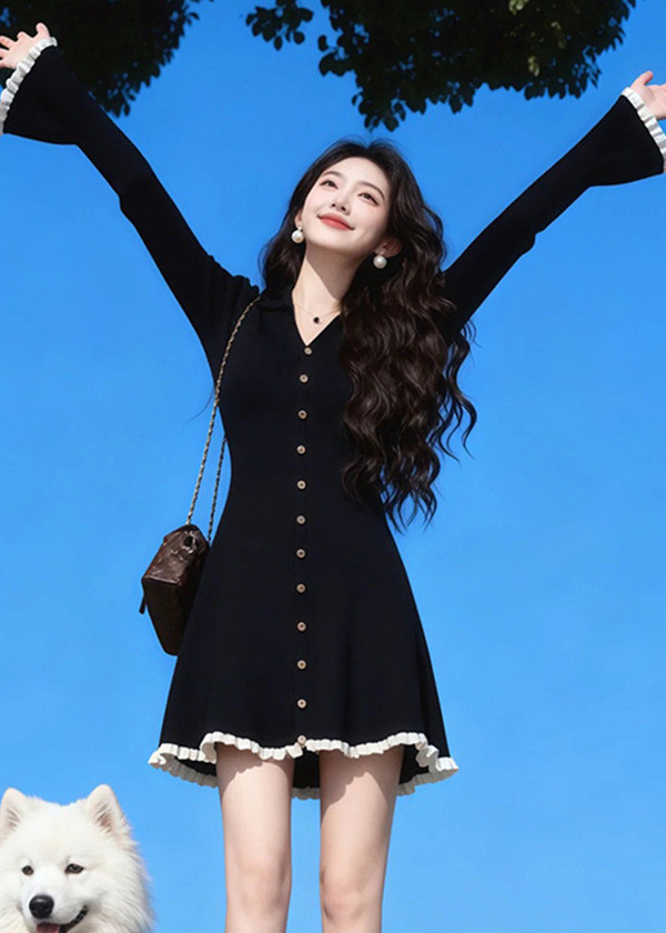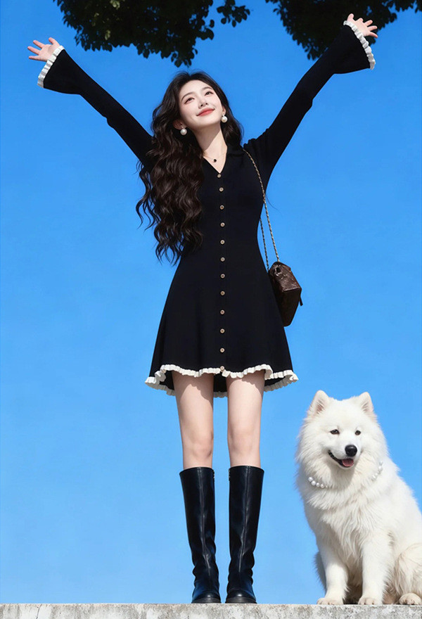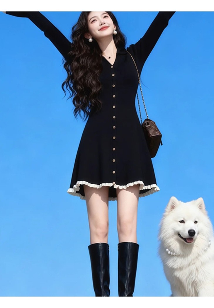 韩系黑色连衣裙秋冬季千金穿搭微胖掐腰裙子