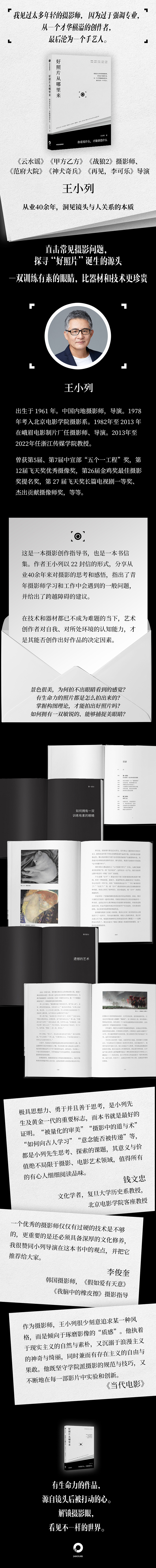 这是一本摄影创作指导书,也是一本书信集。作者以 22 封信的形式,分享从业 40 余年来对摄影的思考和感悟,指出了青年摄影师学习和工作中会遇到的一般问题,并给出了跨越障碍的建议。在技术和器材都已不成为难题的当下,艺术创作者对自我、对所处环境的认知能力,才是其能否创作出好作品的决定因素。对青年摄影师而言,书中提及的创作理念、构思过程,以及作者对拍摄经验的分享,能够给个人在专业领域的探索带来启发 ;对摄影爱好者和一般读者而言,了解专业摄影师对摄影的思考,能够让感官充分延展,提升审美能力,进而体悟各行各业共通的创作之道。