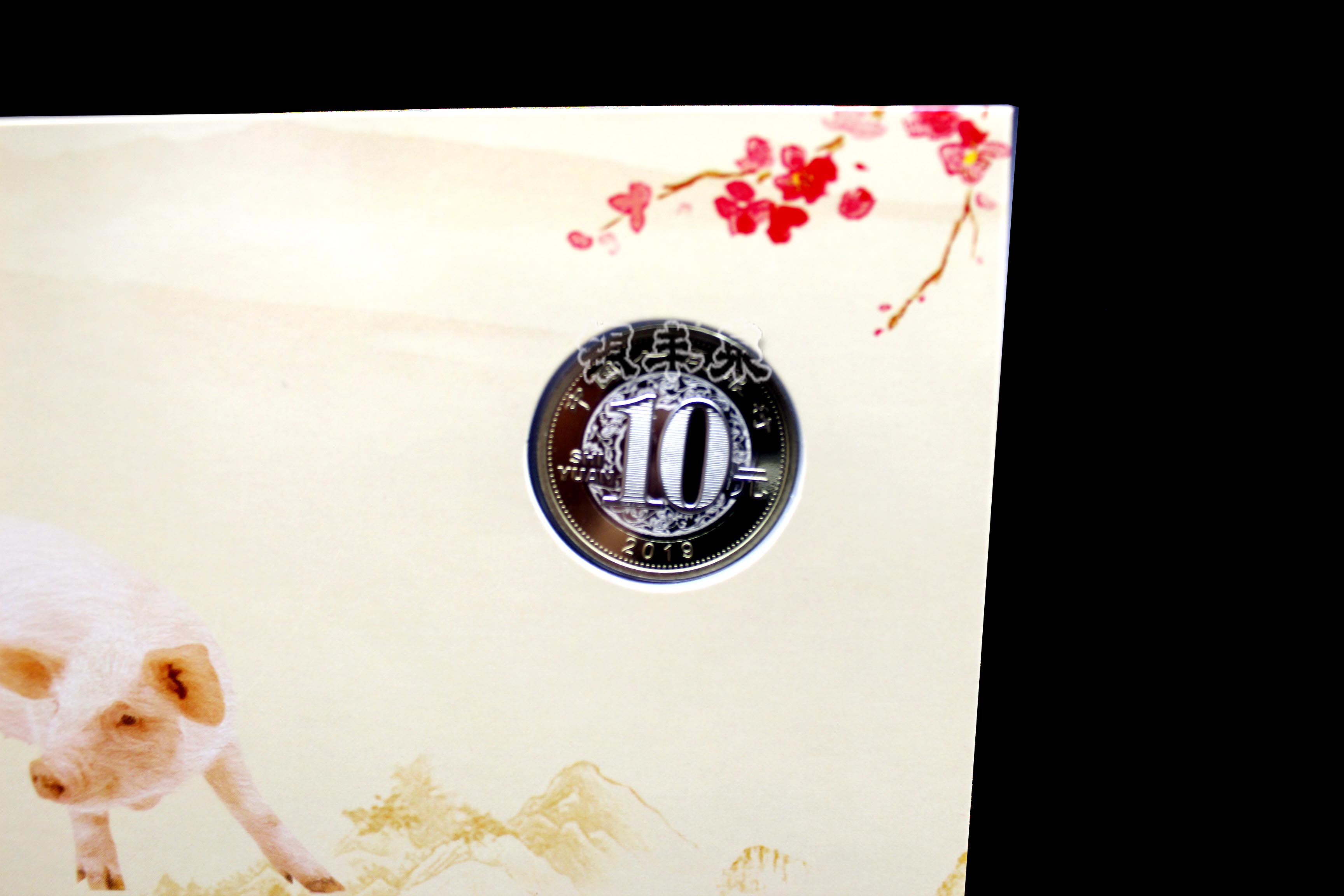 | 图 案 | 背面主景图案为一只中国传统剪纸艺术与装饰年画元素相结合造型的小猪,其上方为宫灯和石榴花图案,币面左侧刊“己亥”字样 |