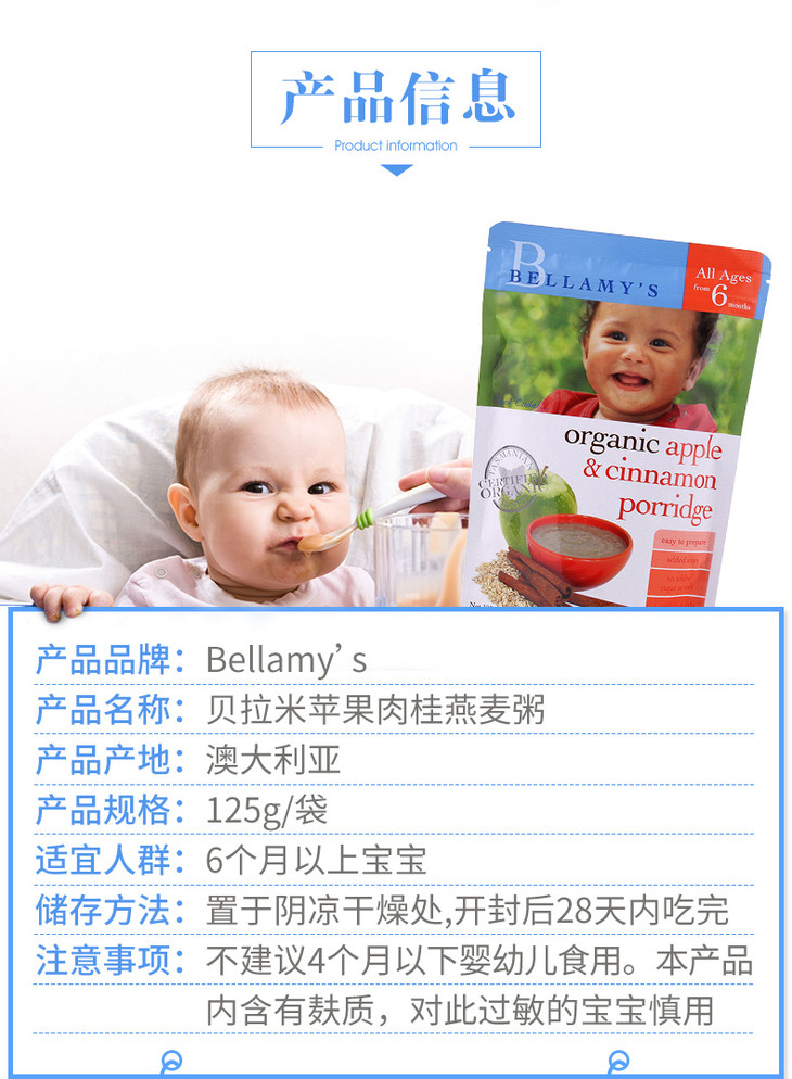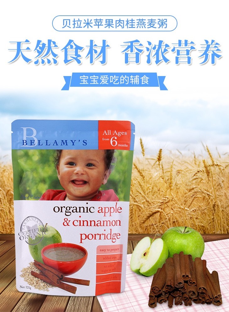 澳大利亚贝拉米Bellamy's苹果肉桂燕麦米粉6+段125g