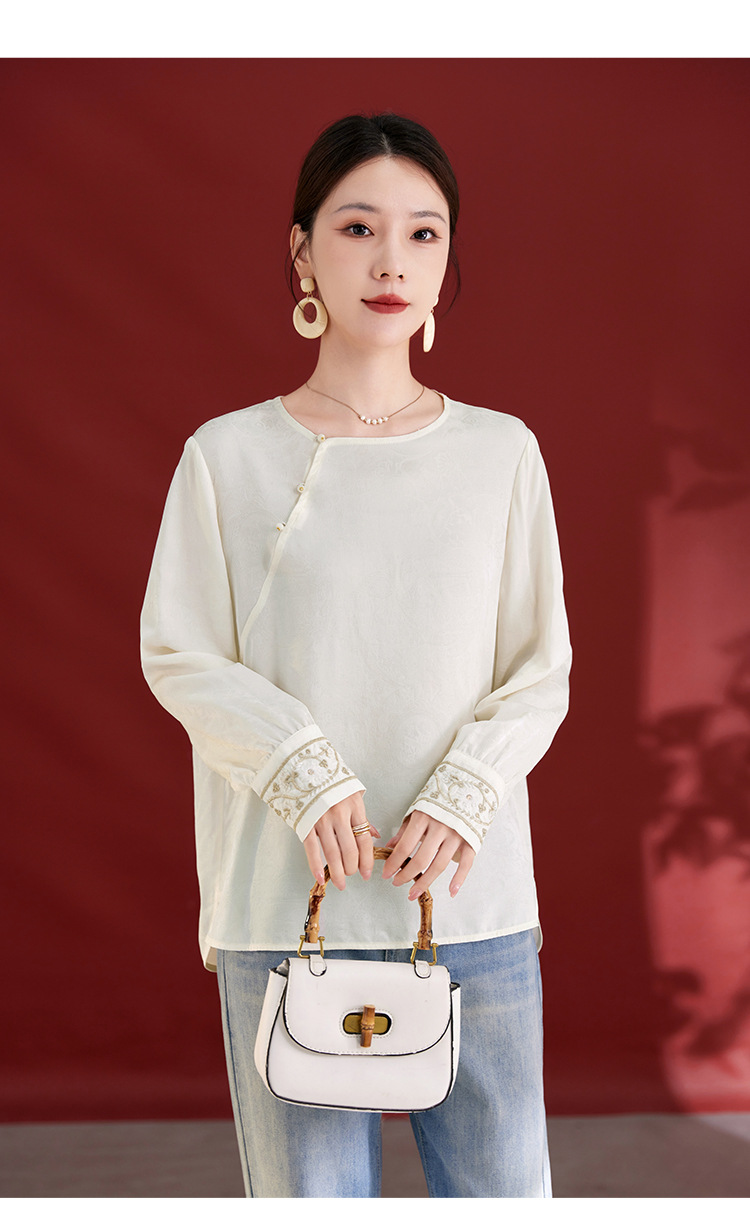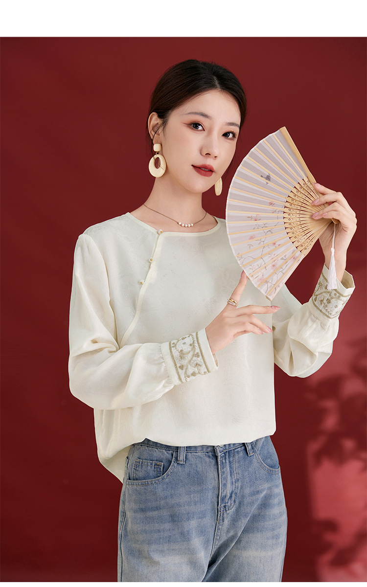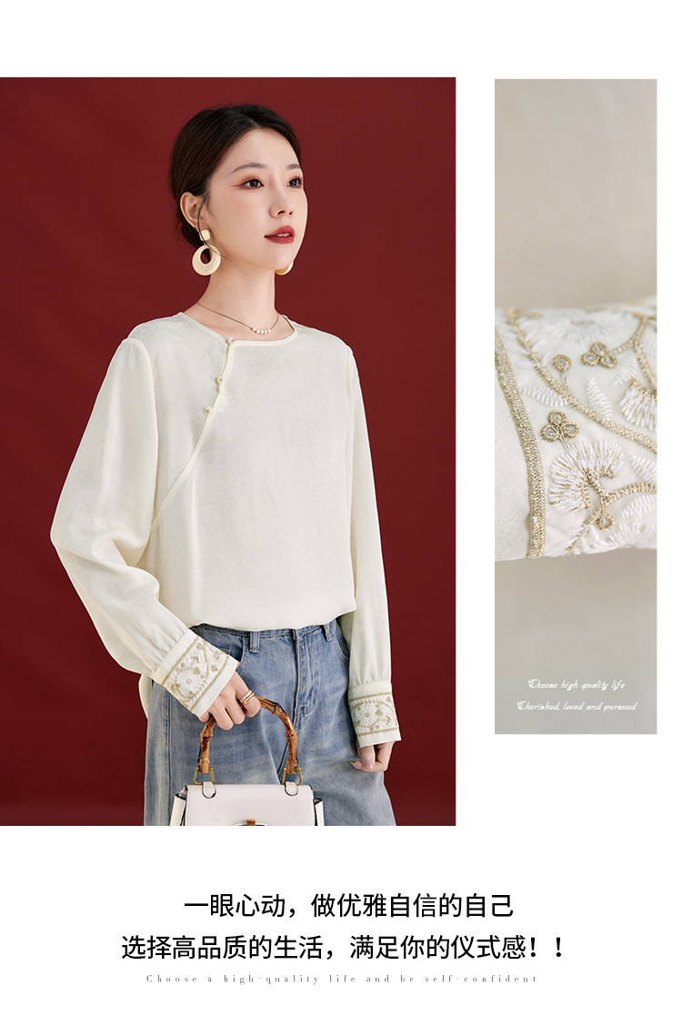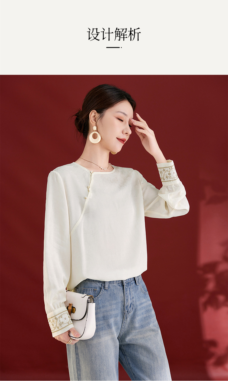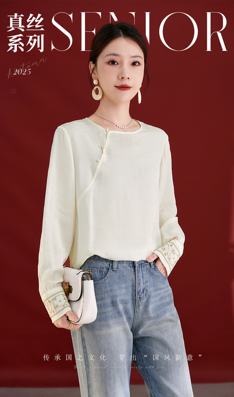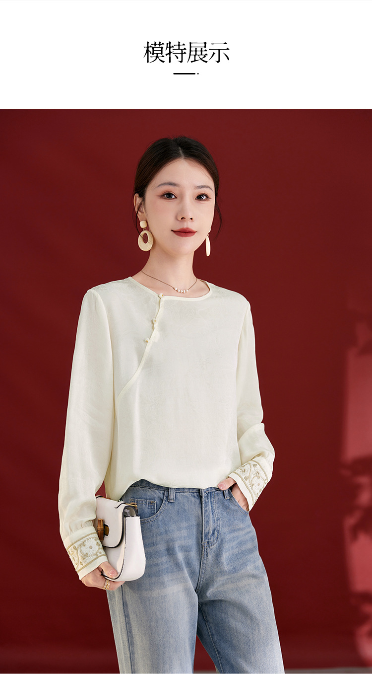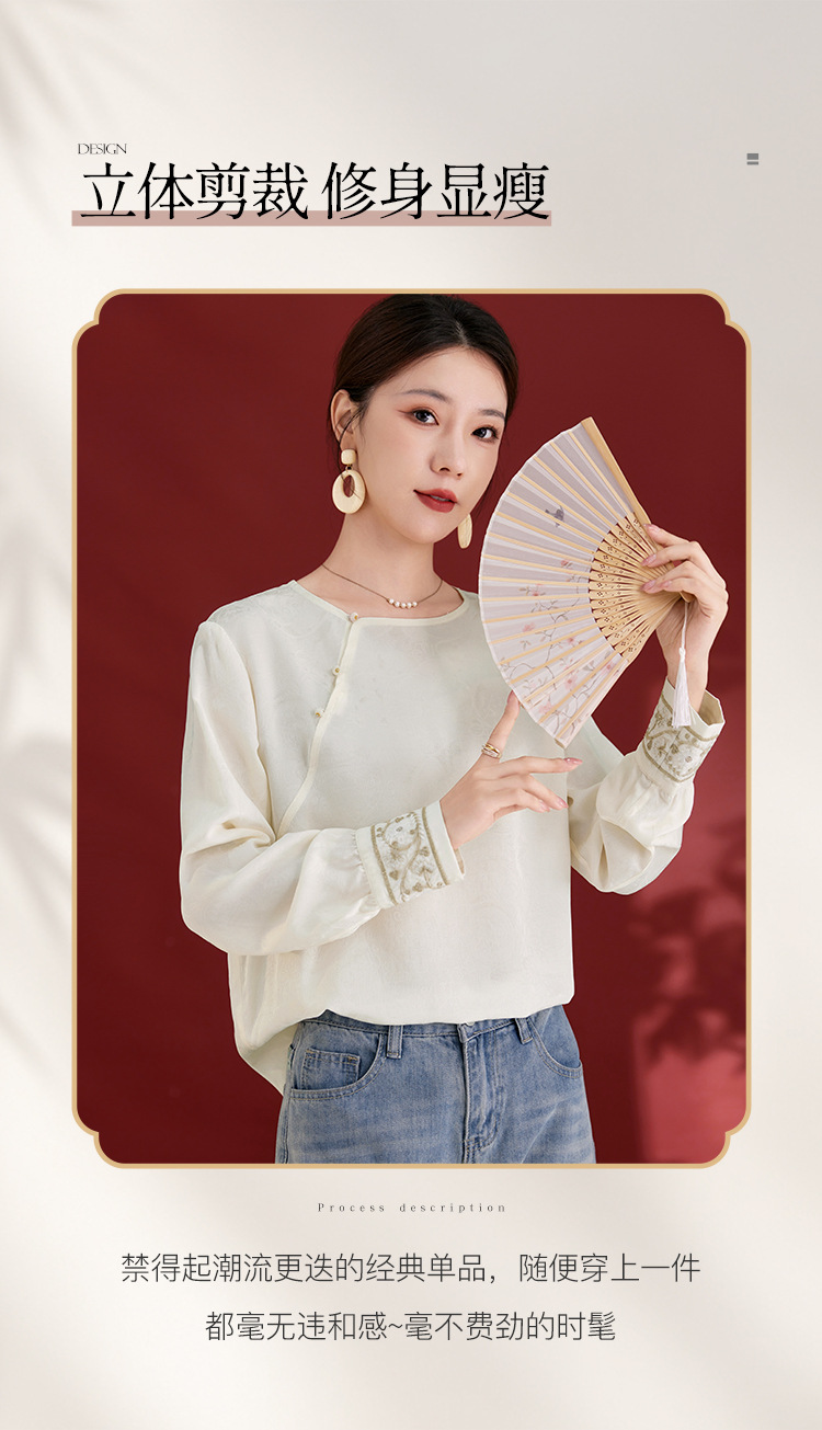QS25秋季新款真丝丝绒国风袖口拼织带时尚衬衣对襟圆领长袖上衣2325