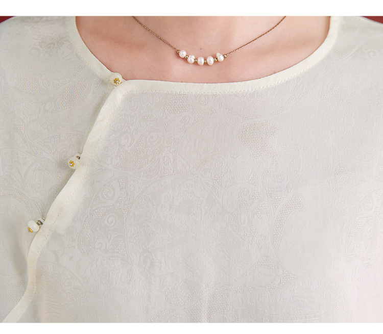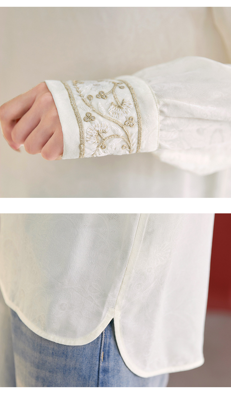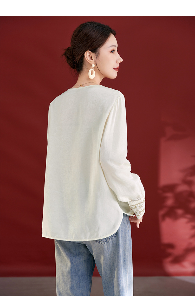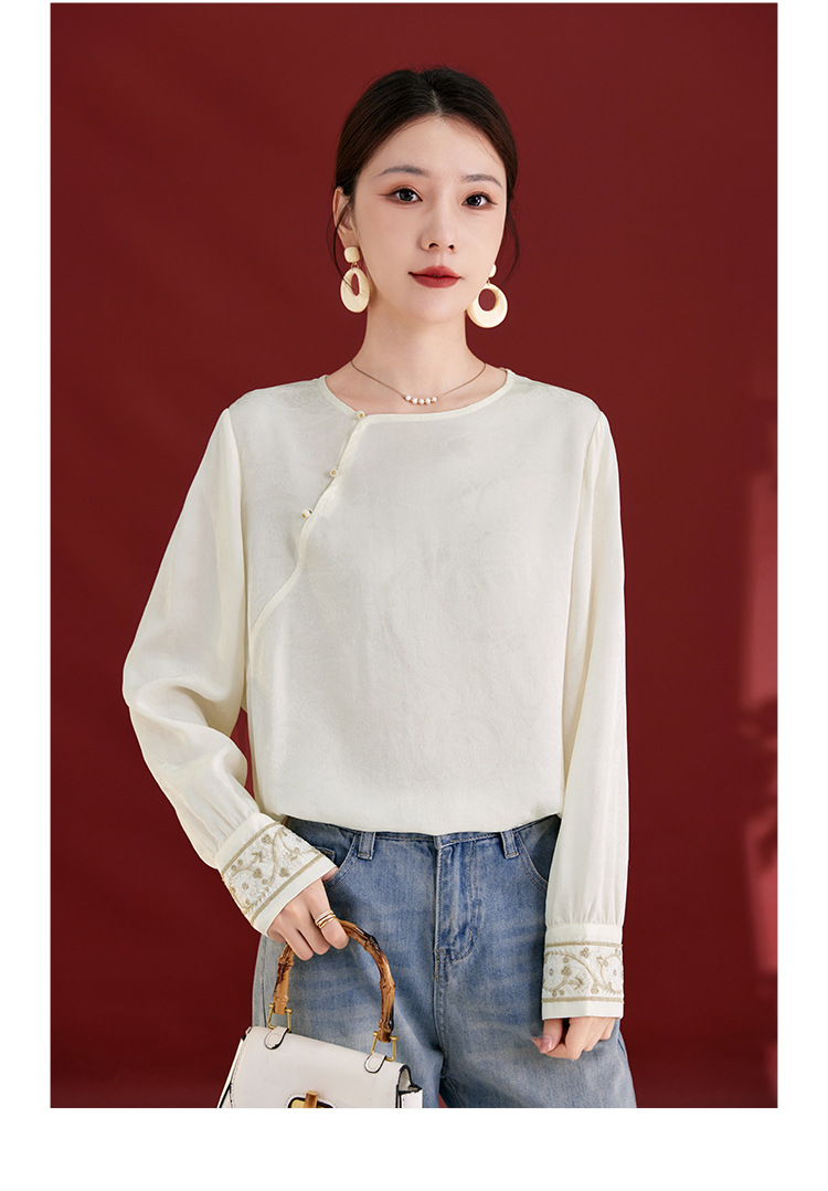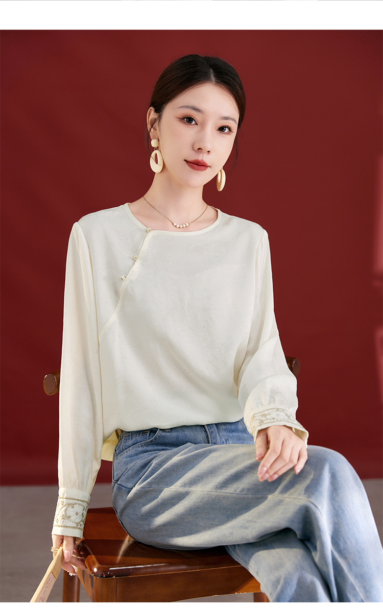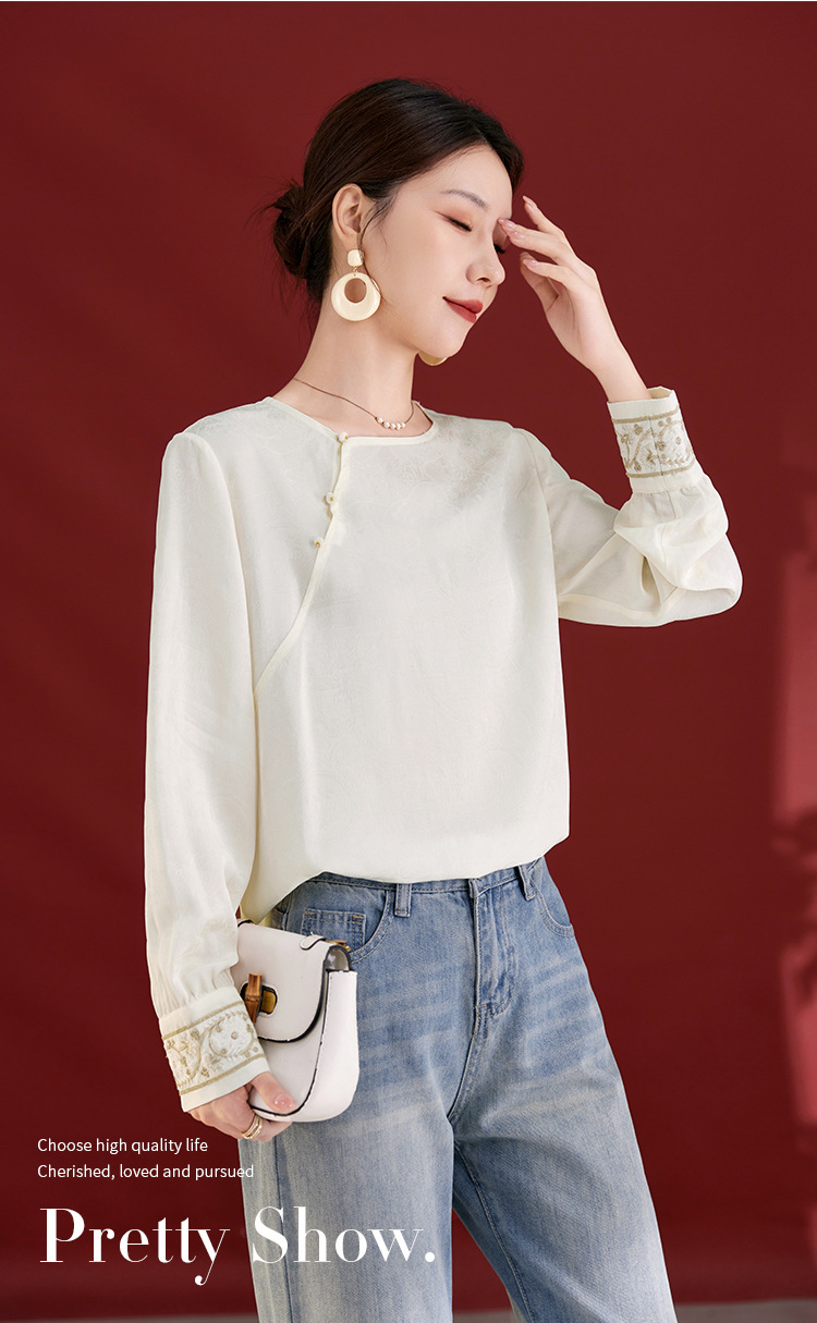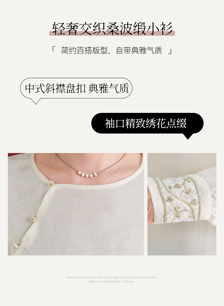 QS25秋季新款真丝丝绒国风袖口拼织带时尚衬衣对襟圆领长袖上衣2325