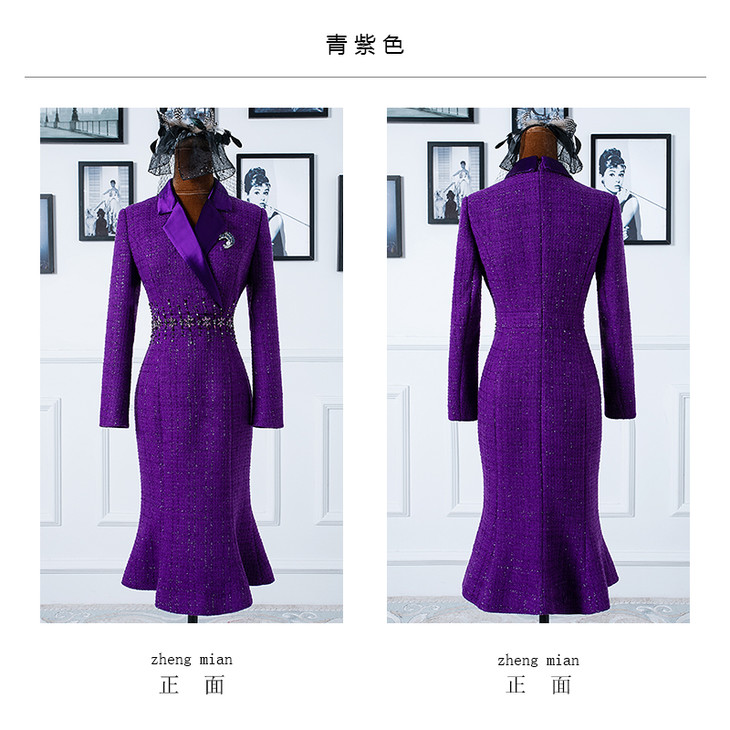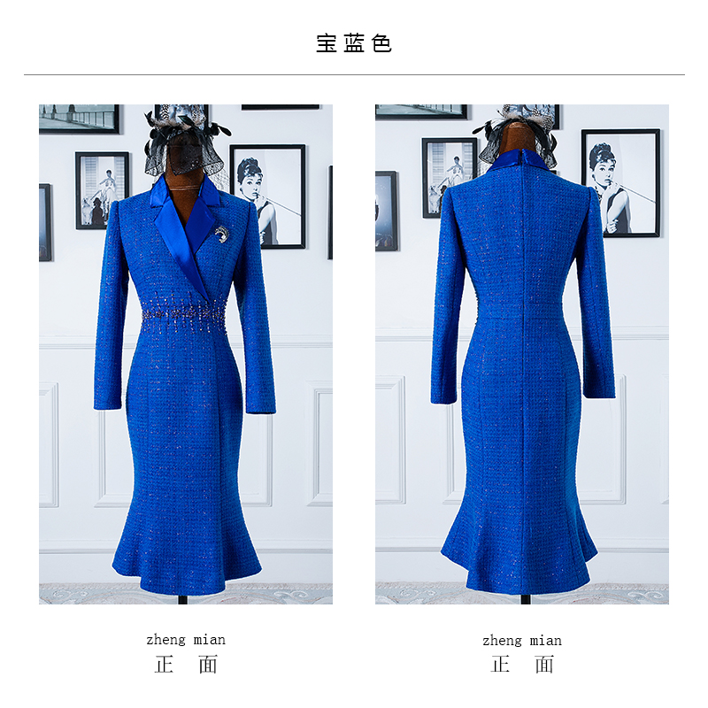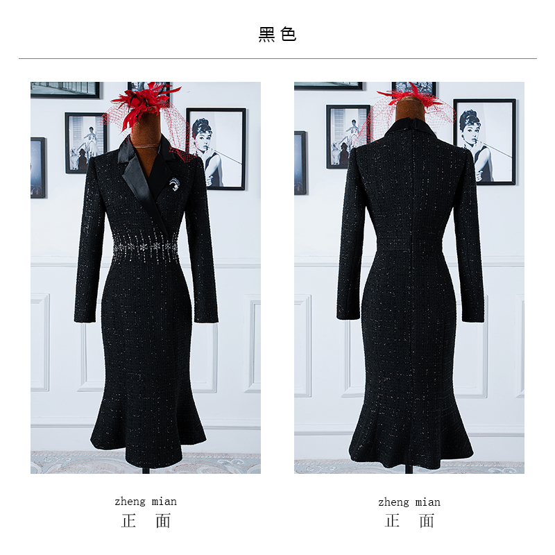 FMY43290新款气质收腰西装领长袖中长款钉珠鱼尾包臀连衣裙