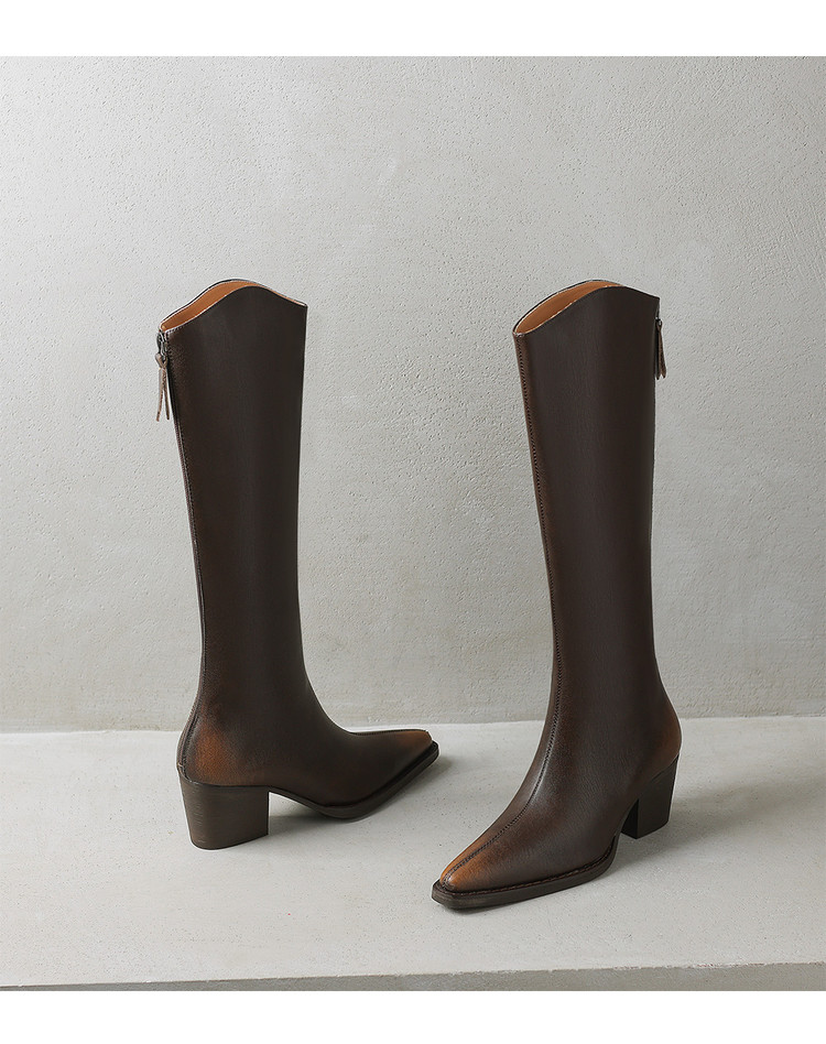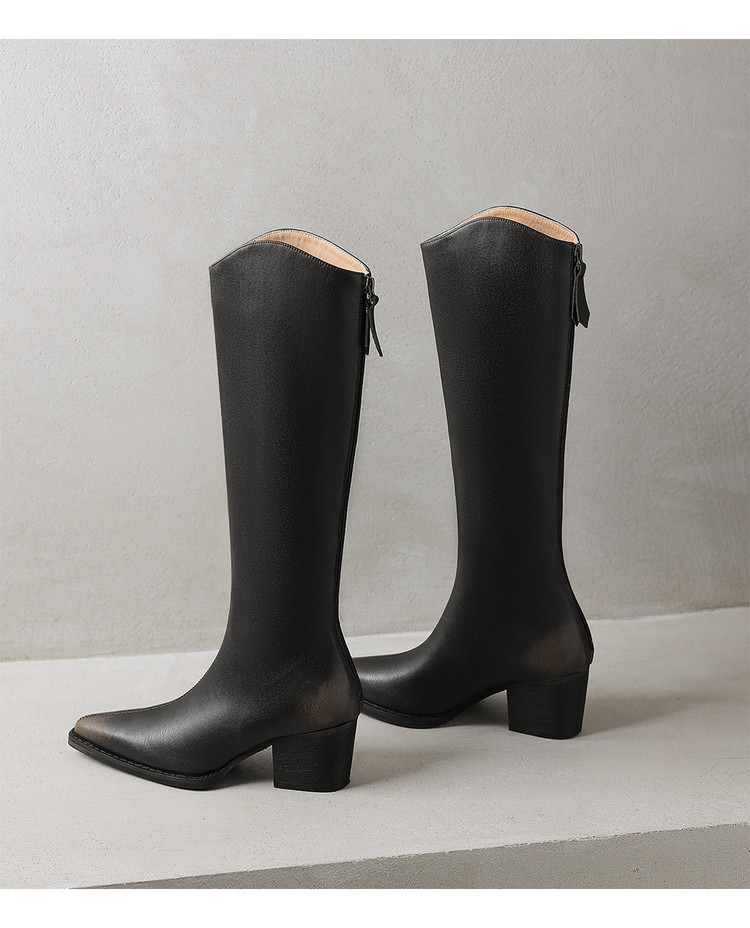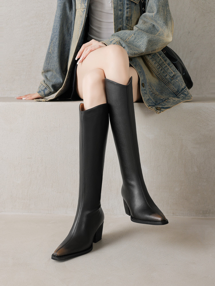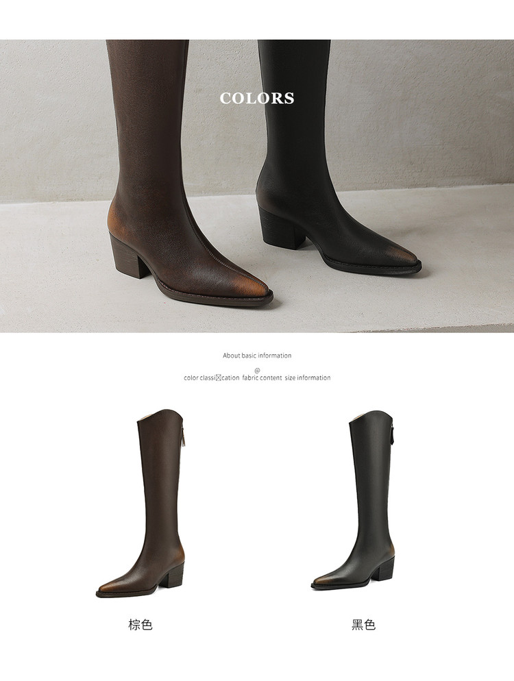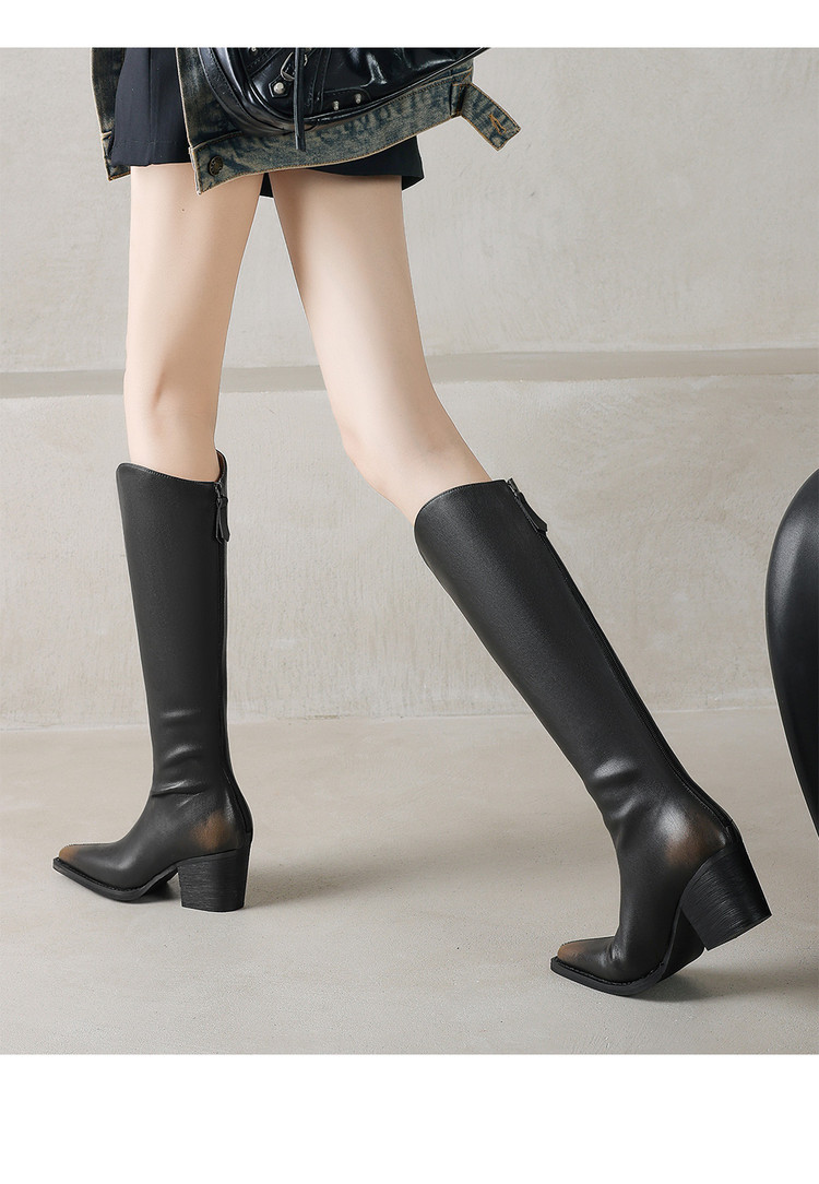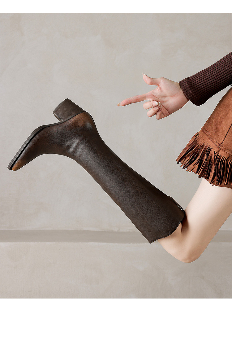 【预售7天】秋冬新款擦色尖头复古V口骑士靴高跟鞋加绒不过膝高筒长靴女KYD&10196