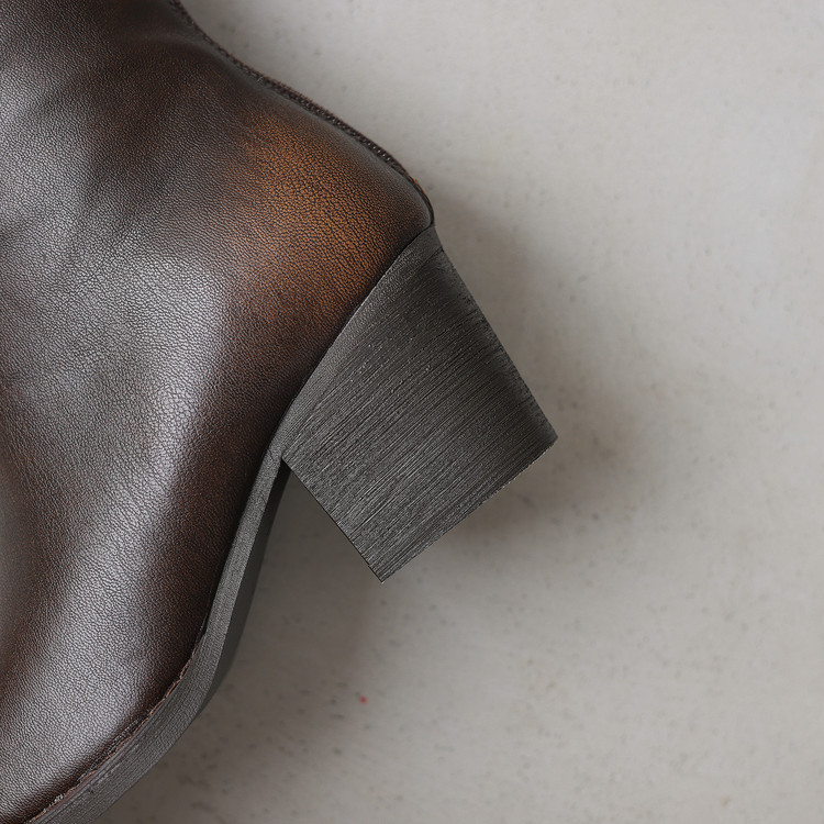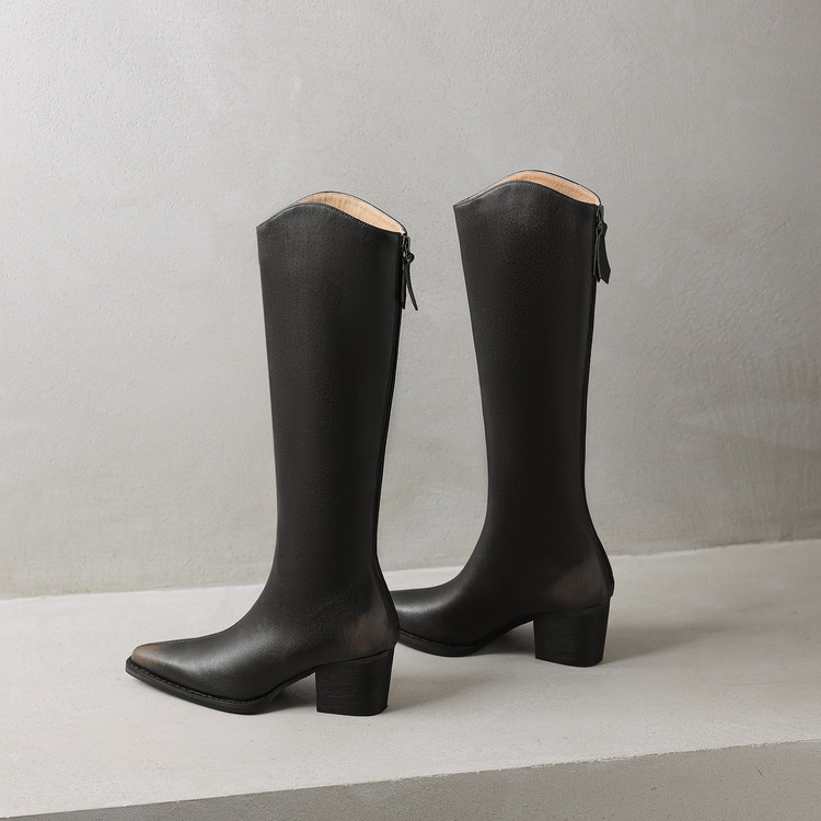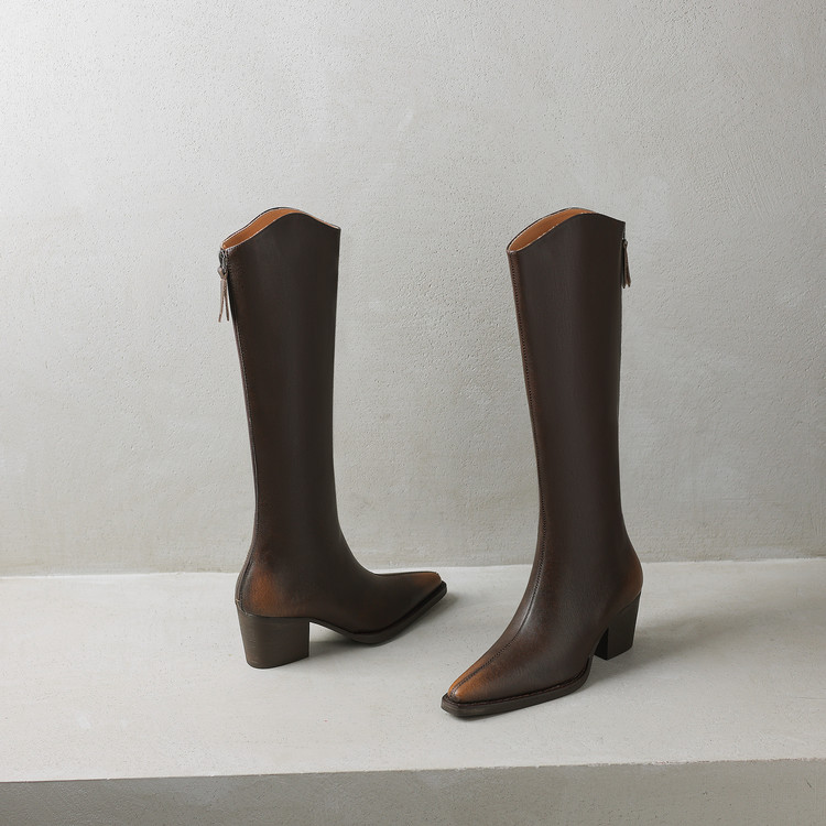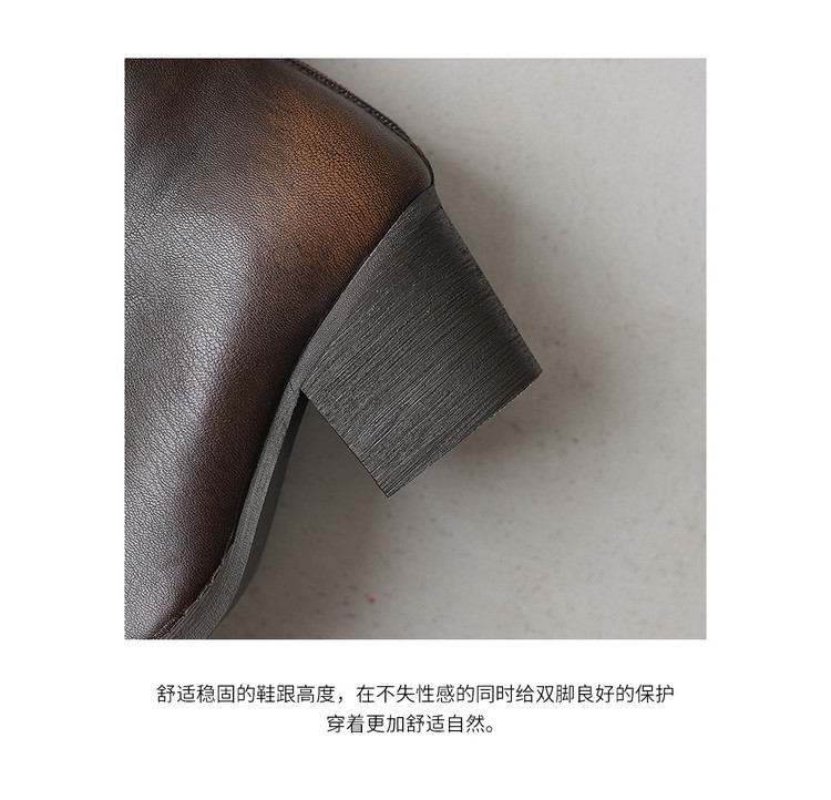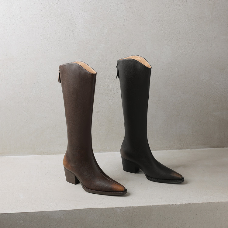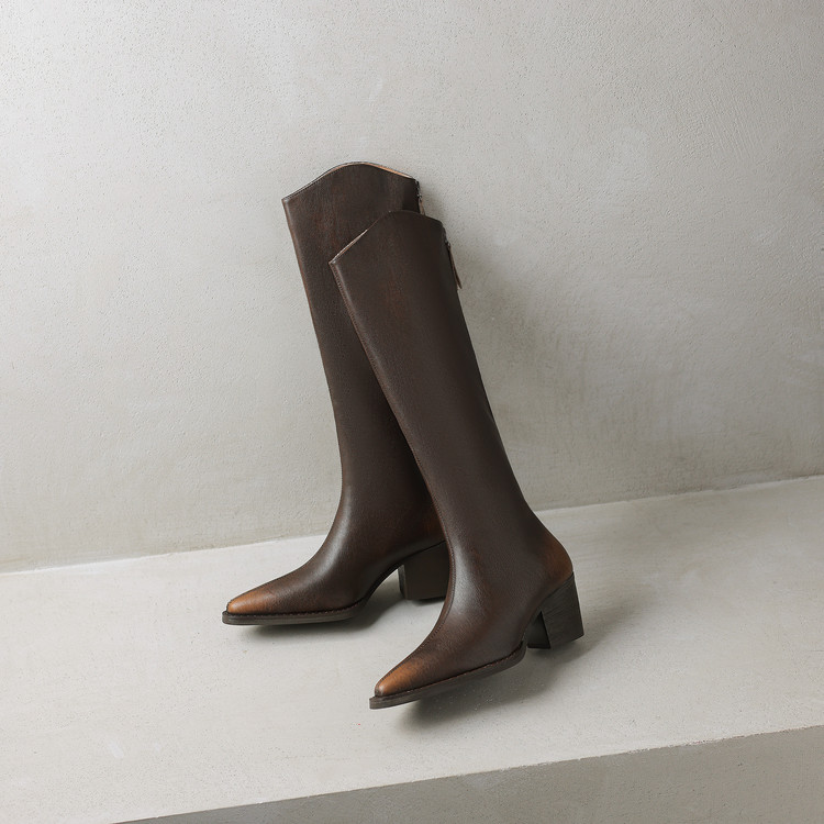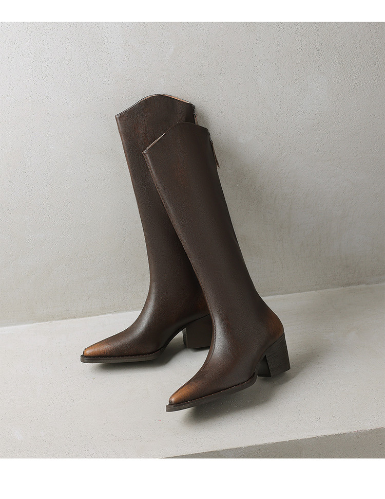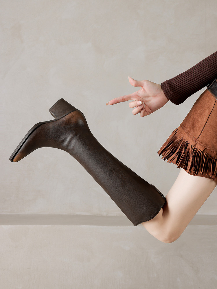 【预售7天】秋冬新款擦色尖头复古V口骑士靴高跟鞋加绒不过膝高筒长靴女KYD&10196