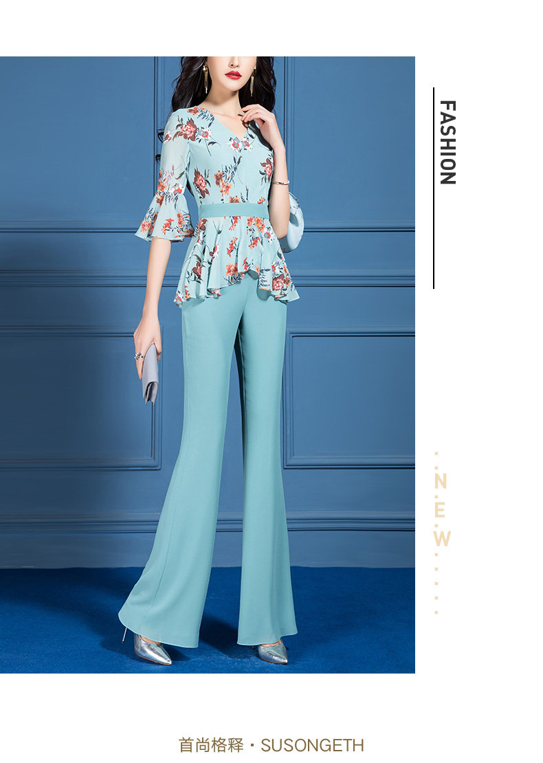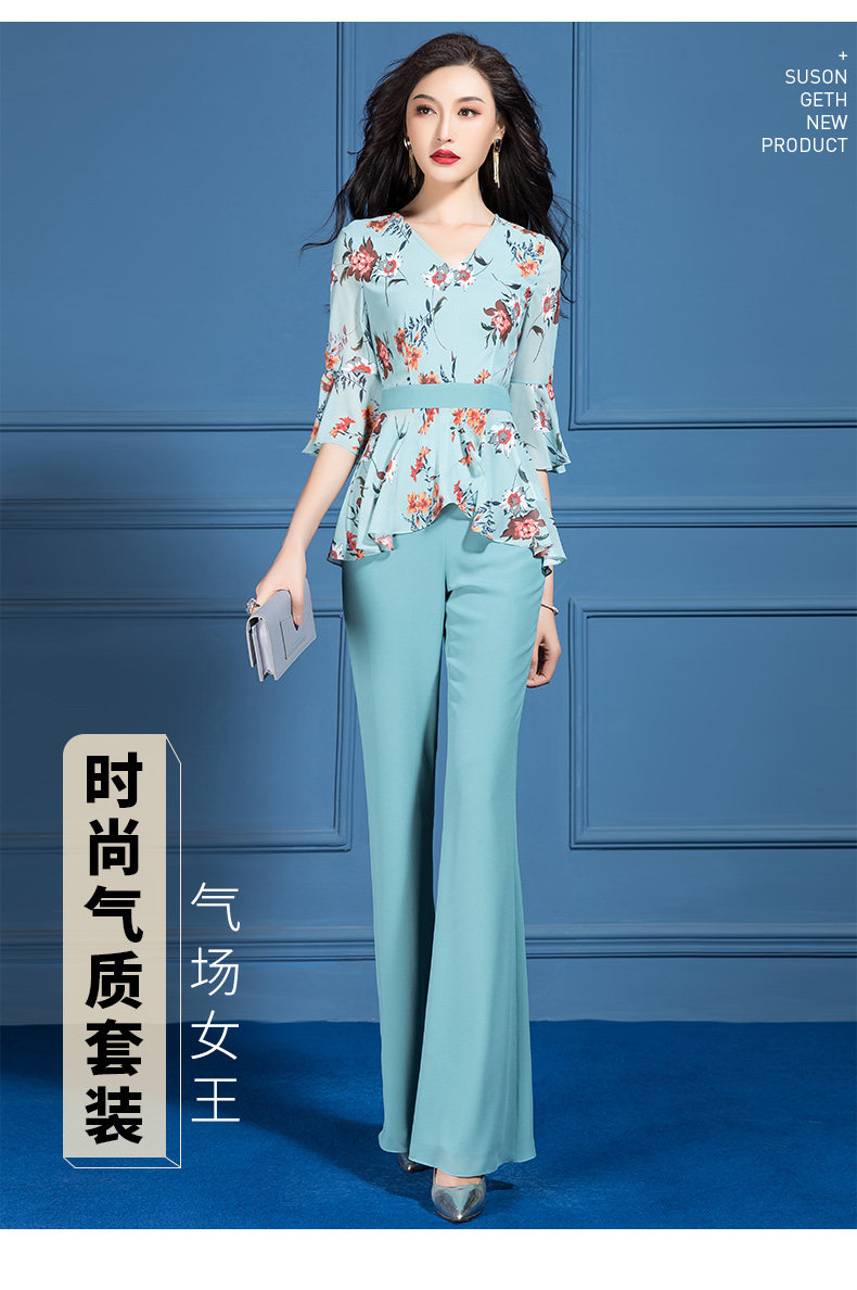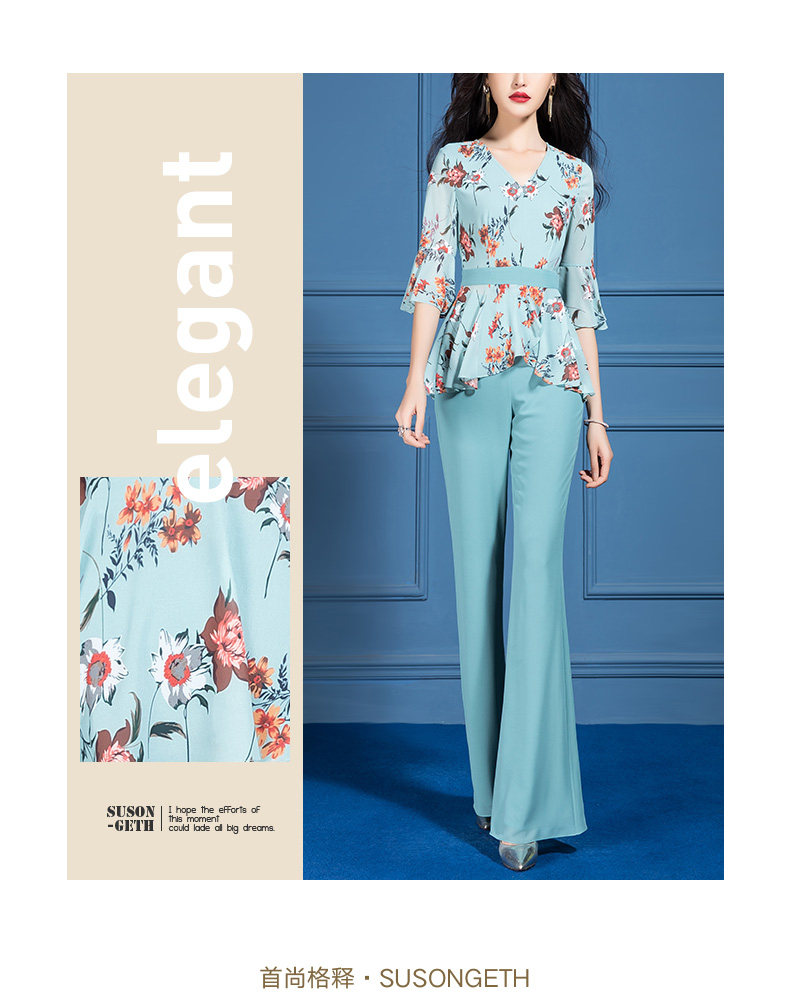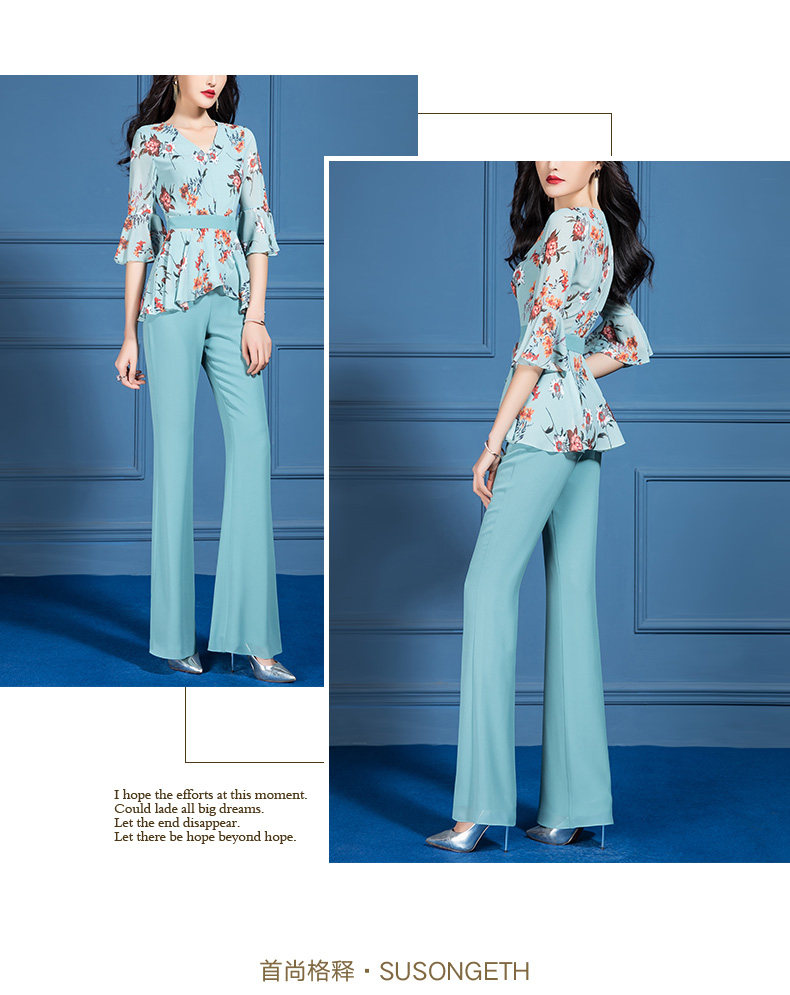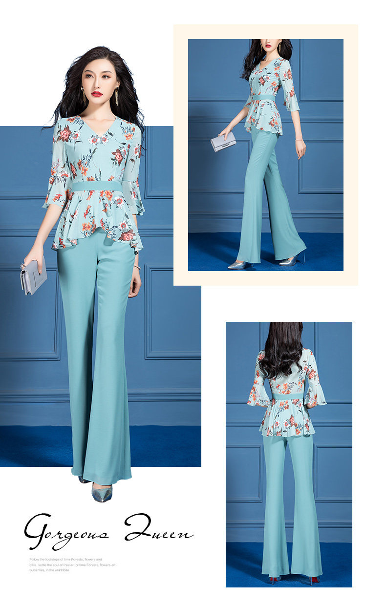 SSGS-L455时尚气质女神范印花雪纺衫喇叭裤两件套