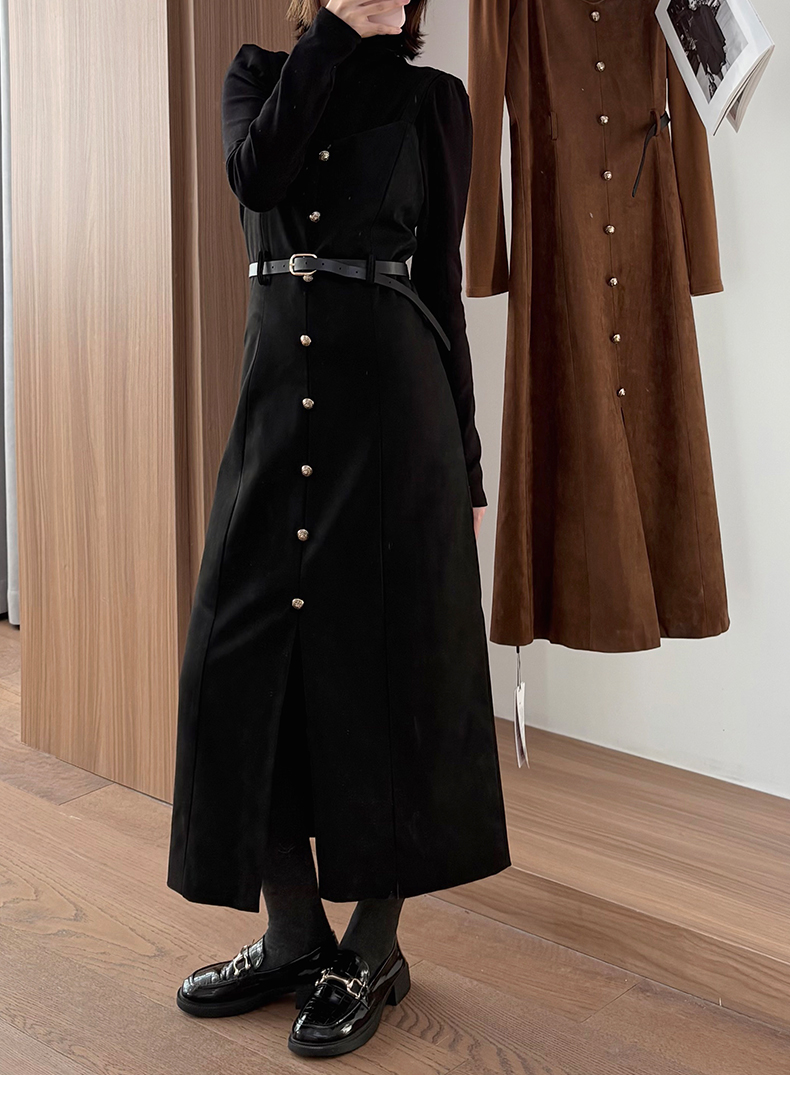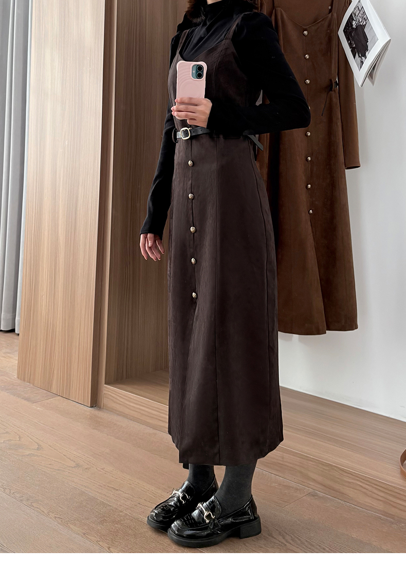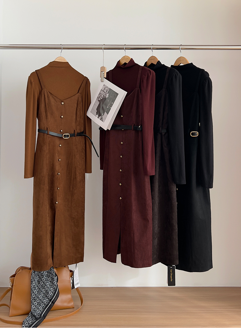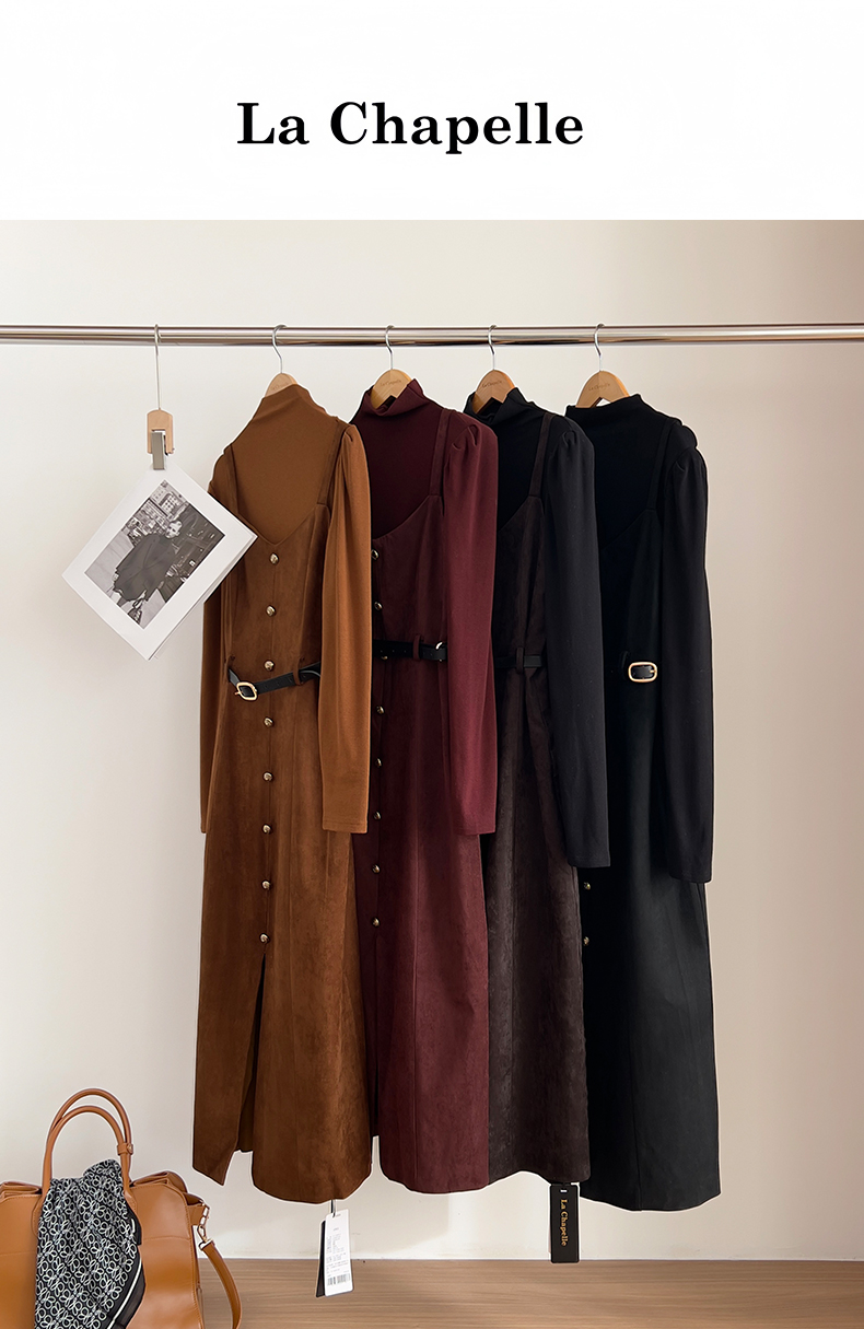 会员福利【复古时髦两件套】拉夏贝尔/La Chapelle半高领打底+复古吊带裙!高级感通勤时髦套装(含腰带)