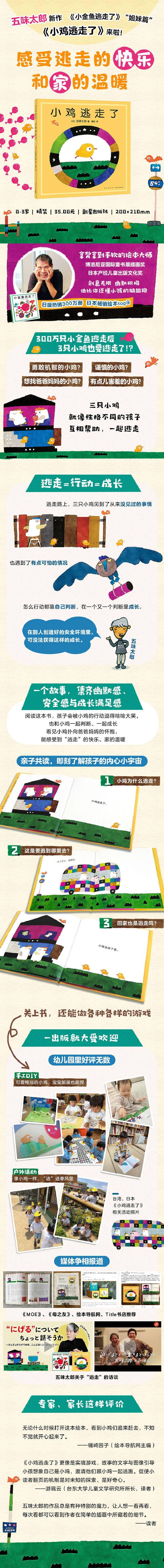 爸爸妈妈在楼上休息的时候,三只小鸡一块儿逃走了!三只小鸡兴冲冲地往前逃,他们见到了各种没见过的东西,也遇到过可怕的情况。一路上,三只小鸡互相帮助,共同成长,依靠自己的判断,解决问题,继续逃啊逃,他们要逃到哪里去呢?五味太郎新作《小鸡逃走了》来啦!《小金鱼逃走了》姐妹篇,时隔40年,再度大玩逃走游戏,给小朋友带来新的欢声笑语和成长勇气,翻转思维定式,看见“逃走”积极面,指引宝宝的成长路,“逃”出新境界!