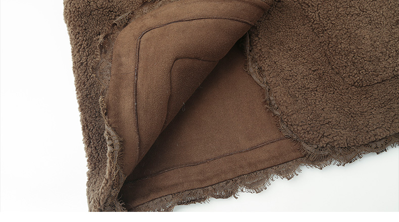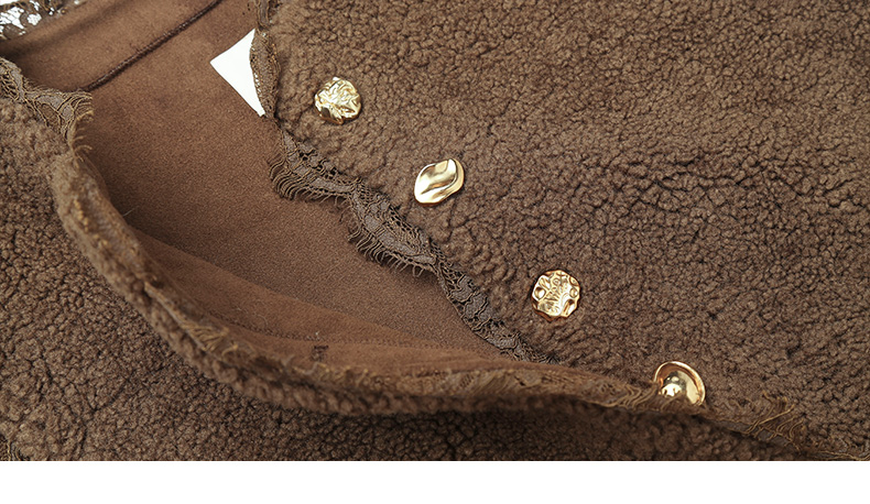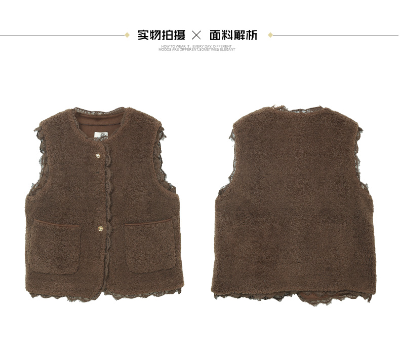 焦糖棕羊羔毛无袖马甲 蕾丝花边单排扣毛绒背心 秋冬甜系温柔风保暖马夹