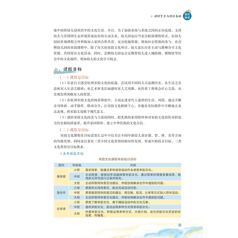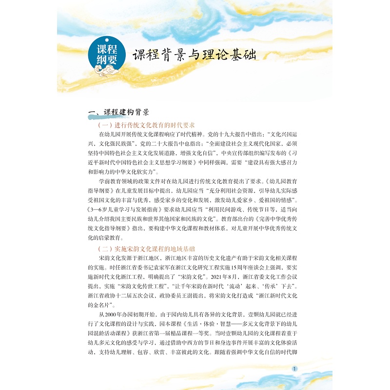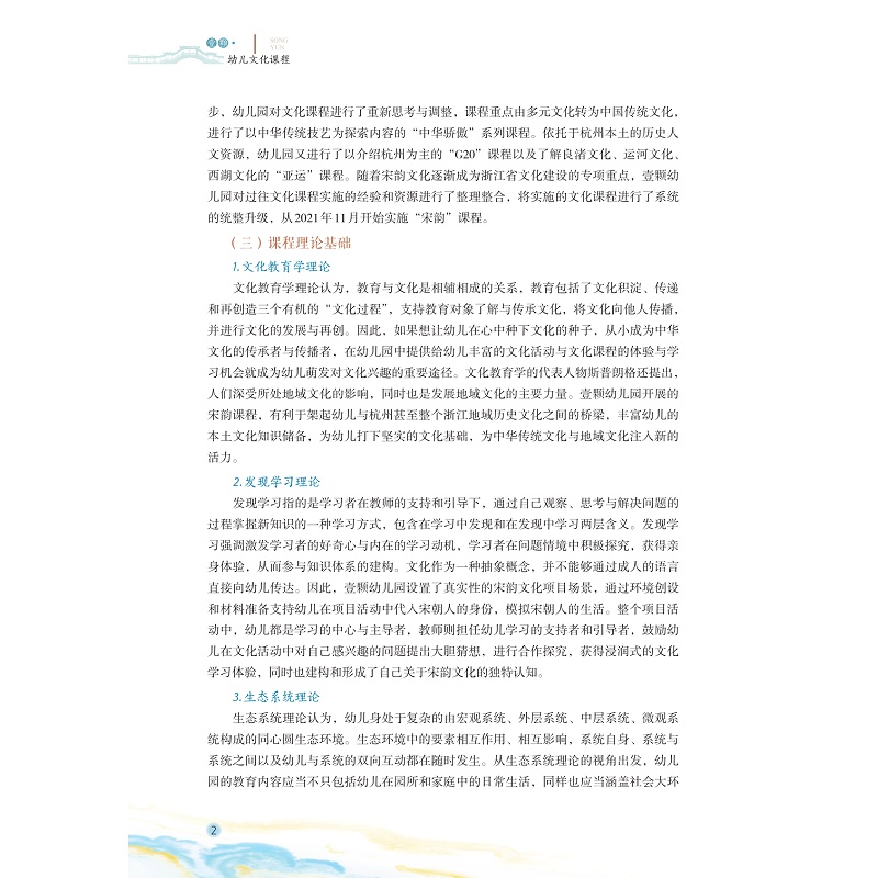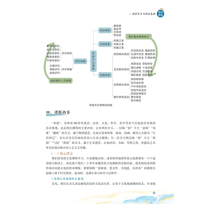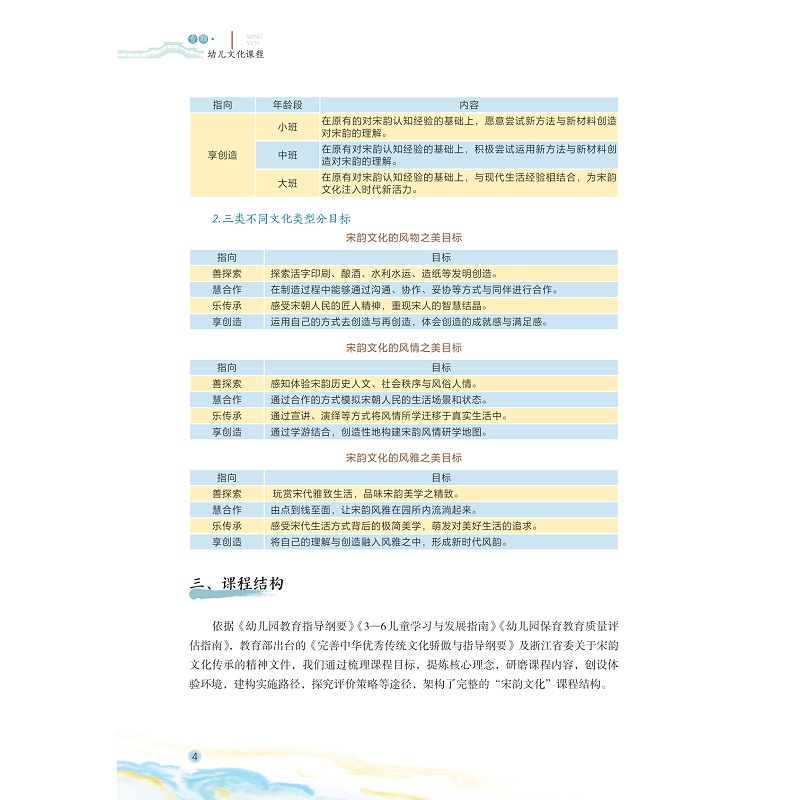 宋韵文化和浙江地区有深厚的关系,浙江地区有丰富的宋代历史文化遗产。为响应“宋韵文化传世工程”,传承“宋韵文化”,幼儿园设计了相关的文化课程。课程依据文化教育理论、发现学习理论、生态系统理论,构建了风物之美、风情之美、风雅之美三大系列课程场景,紧紧围绕“善探索、慧合作、享创造、乐传承”的课程目标展开课程教学,幼儿园通过特色的场景教学方式让孩子在活动中感悟宋韵文化。本书具体介绍了宋韵文化课程的构建理念、教学设计、实施过程,展现了丰富多彩的幼儿园教学活动。