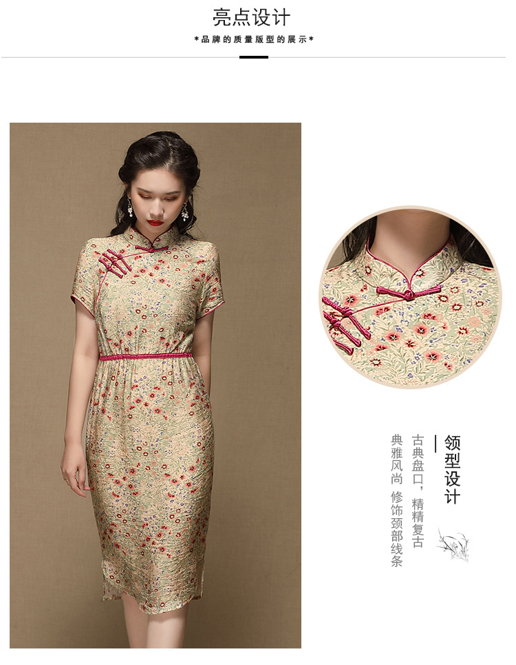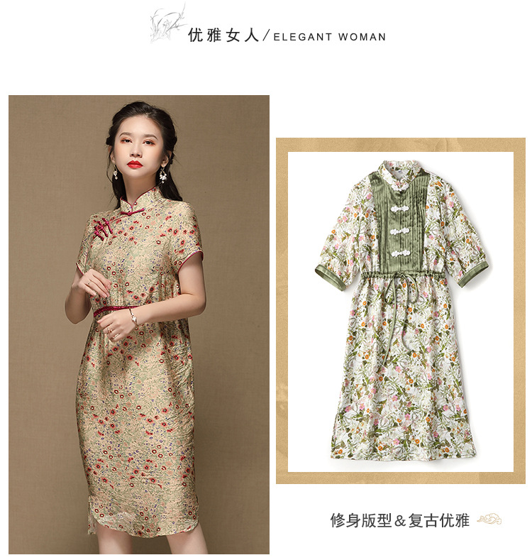 上海旗袍厂AYK-QF-210107锦棉绿叶红碎花改良长款旗袍2021春夏复古女装立拼接国风连衣裙