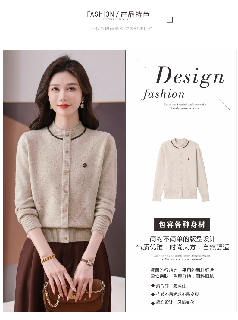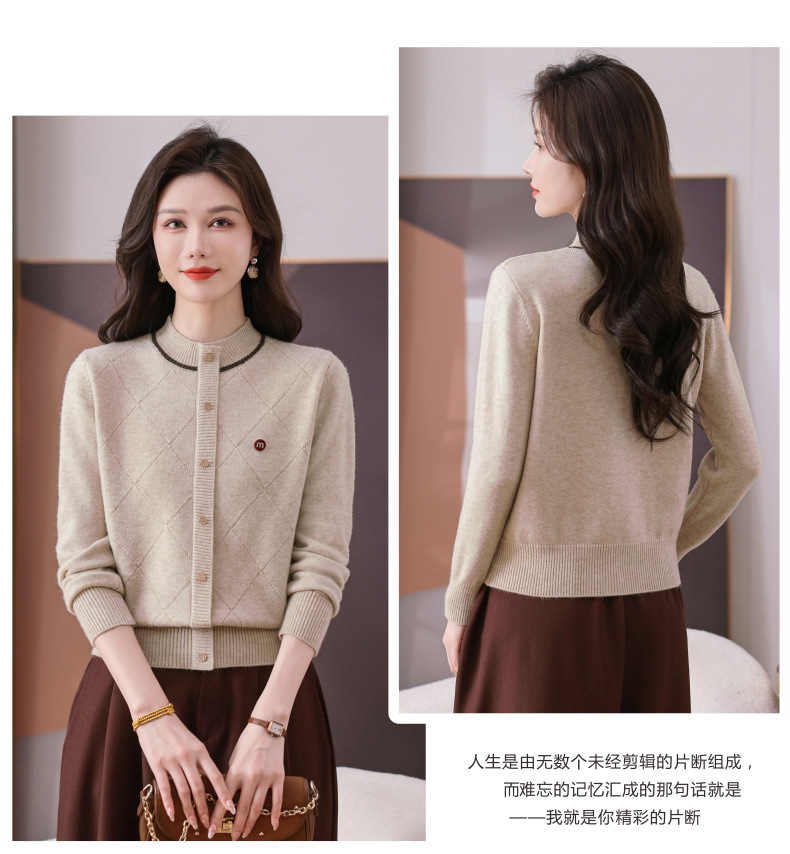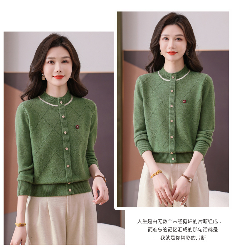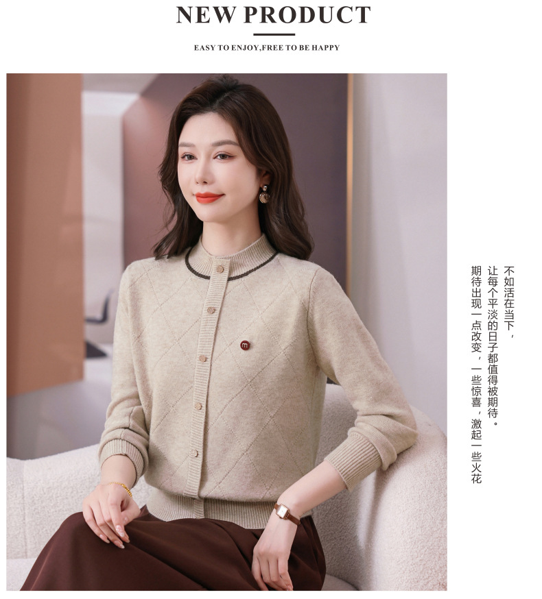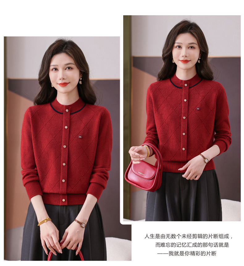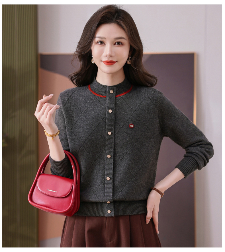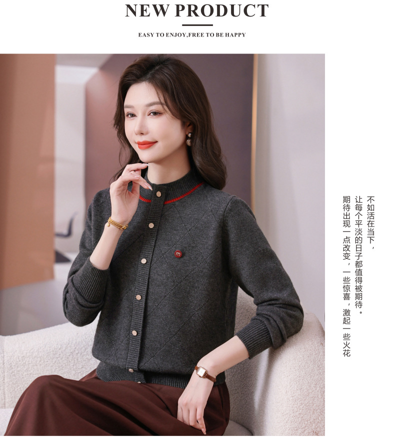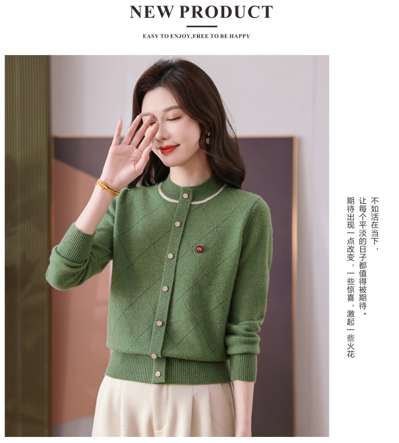 CC秋冬气质半高领衫 菱形纹撞色边单排扣修身针织衫短款上衣