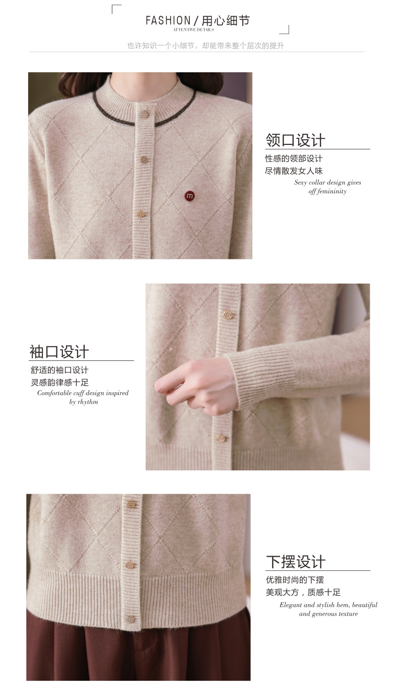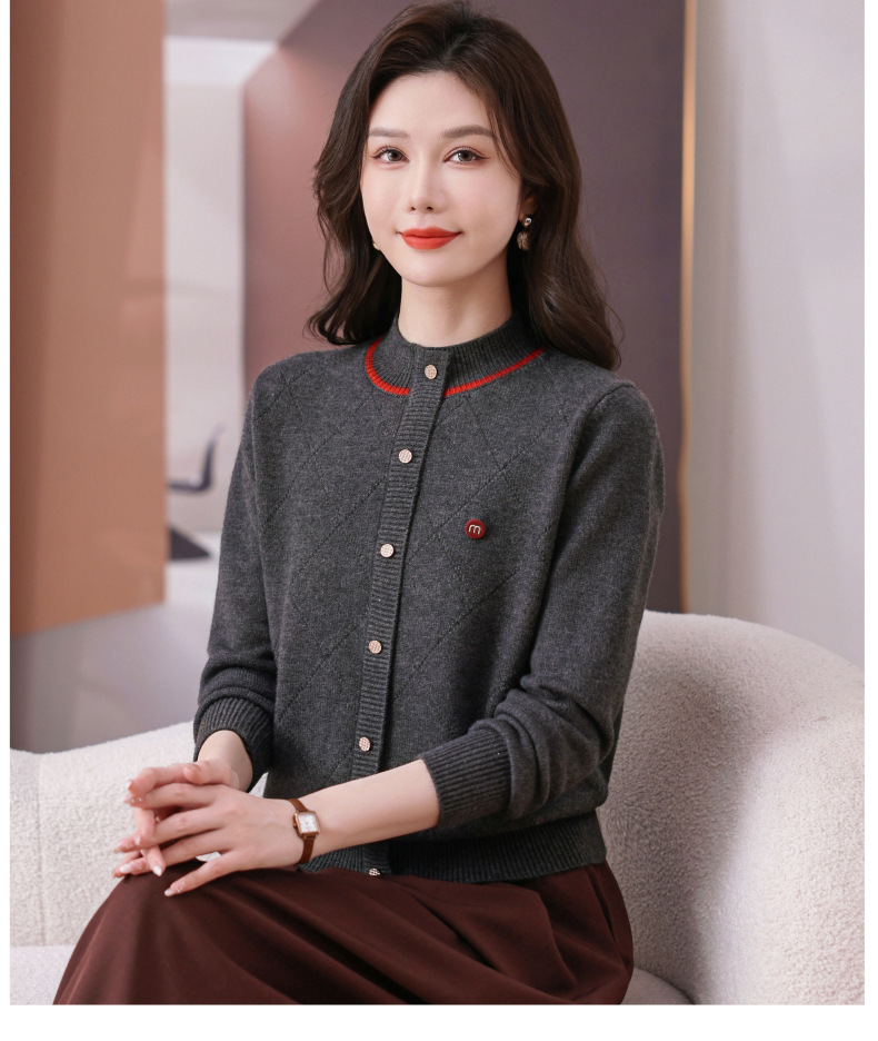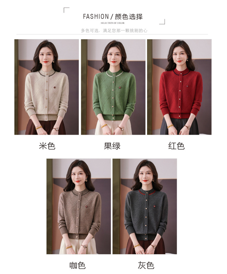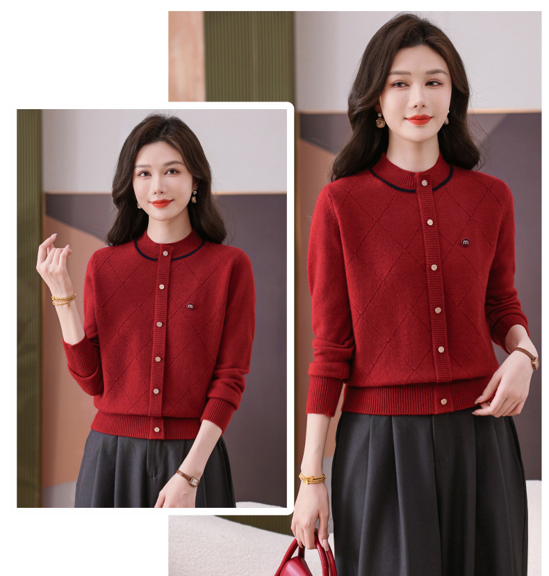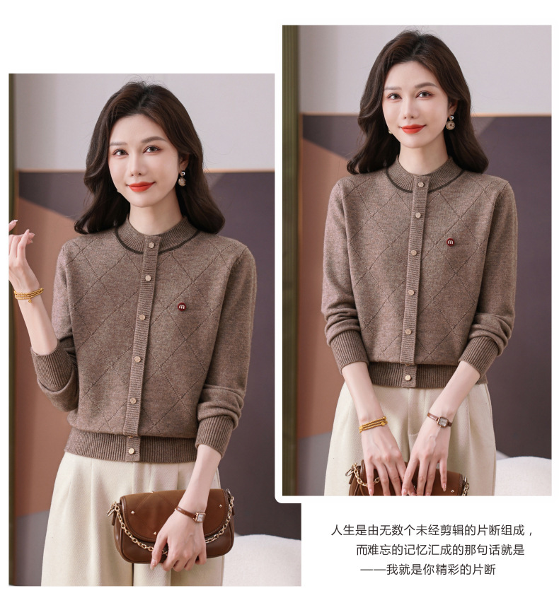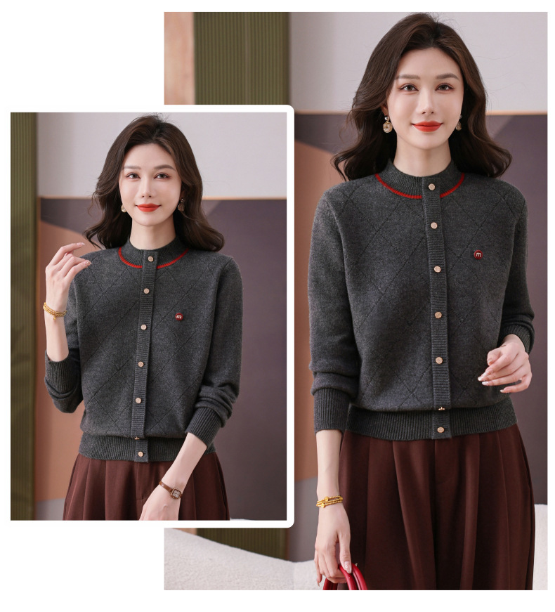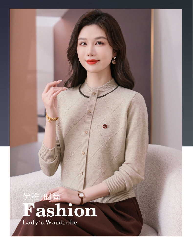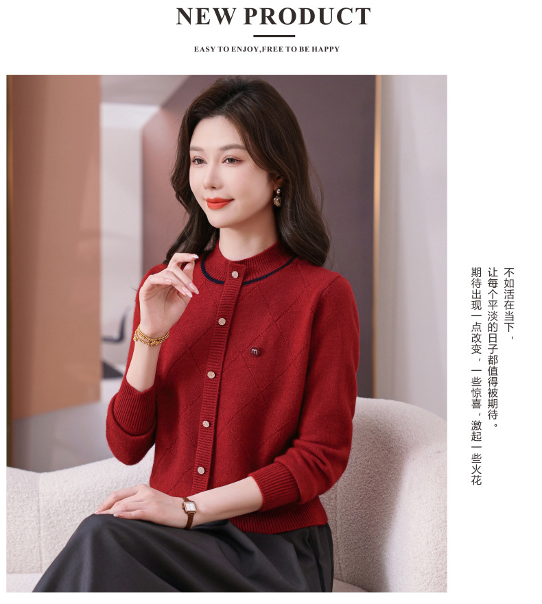 CC秋冬气质半高领衫 菱形纹撞色边单排扣修身针织衫短款上衣