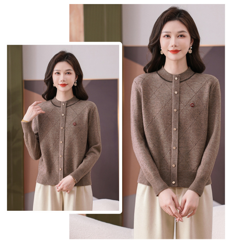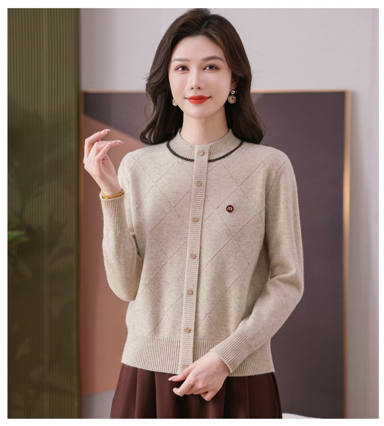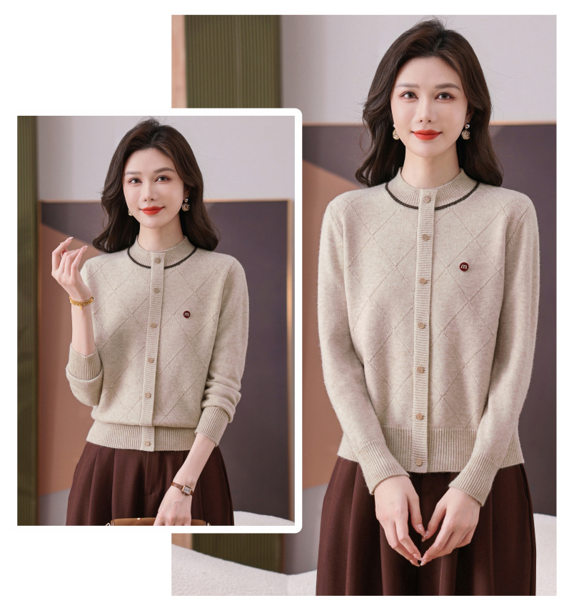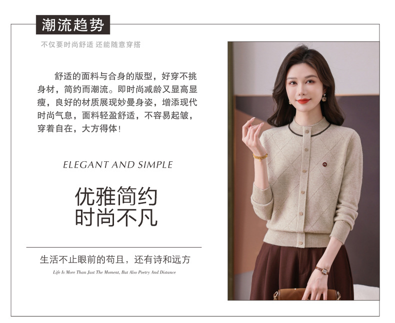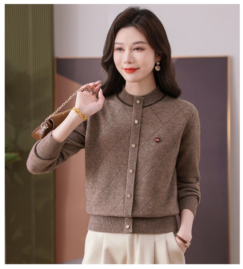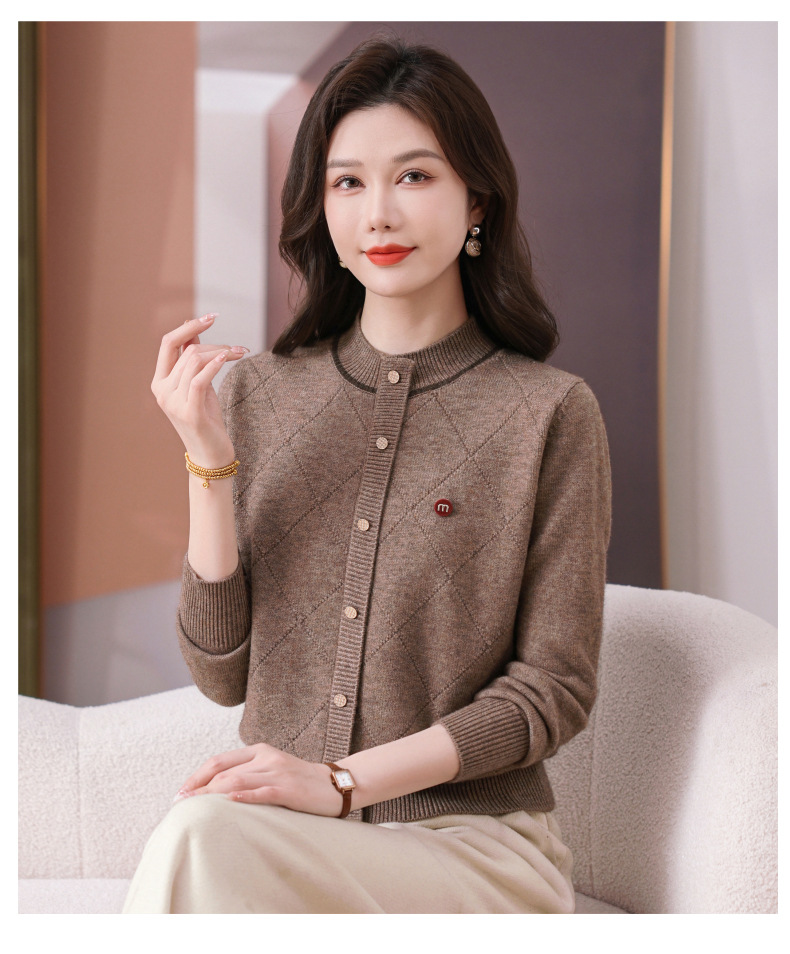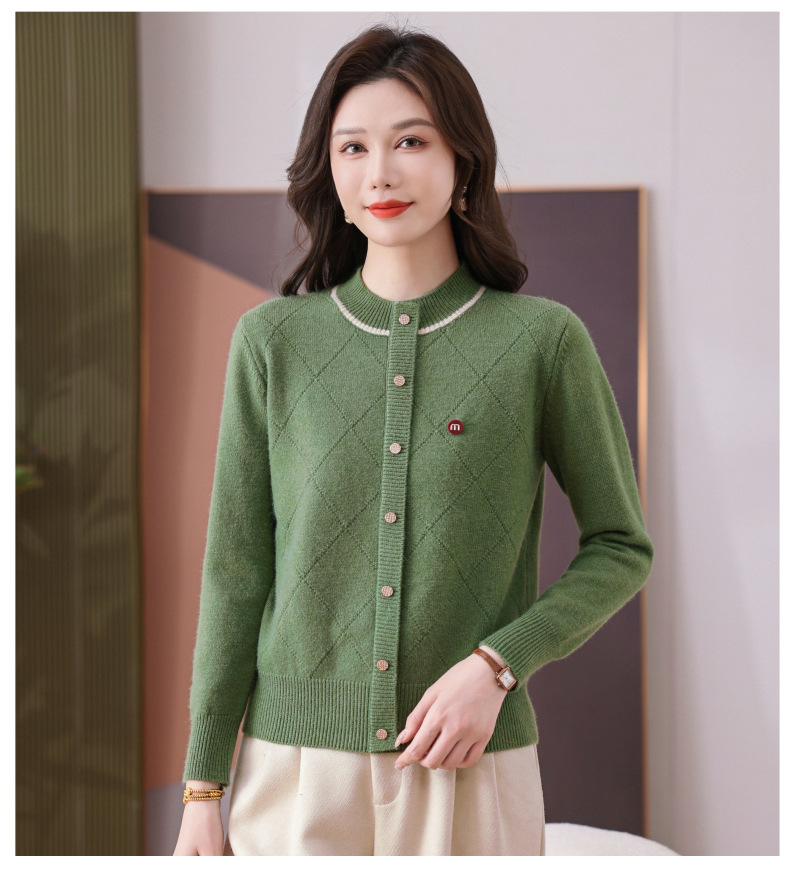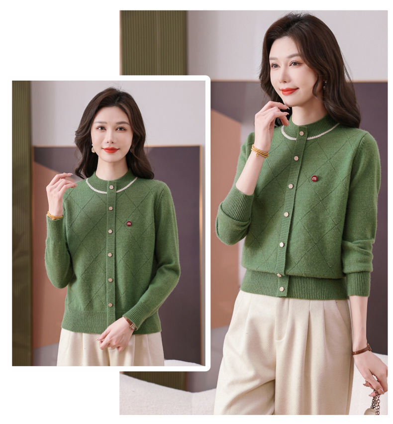 CC秋冬气质半高领衫 菱形纹撞色边单排扣修身针织衫短款上衣