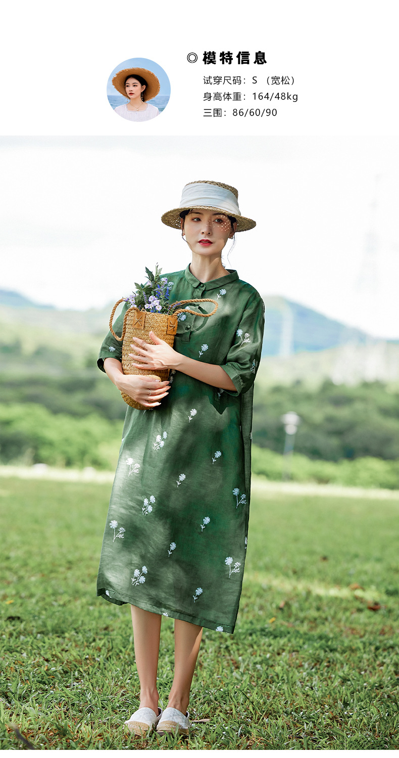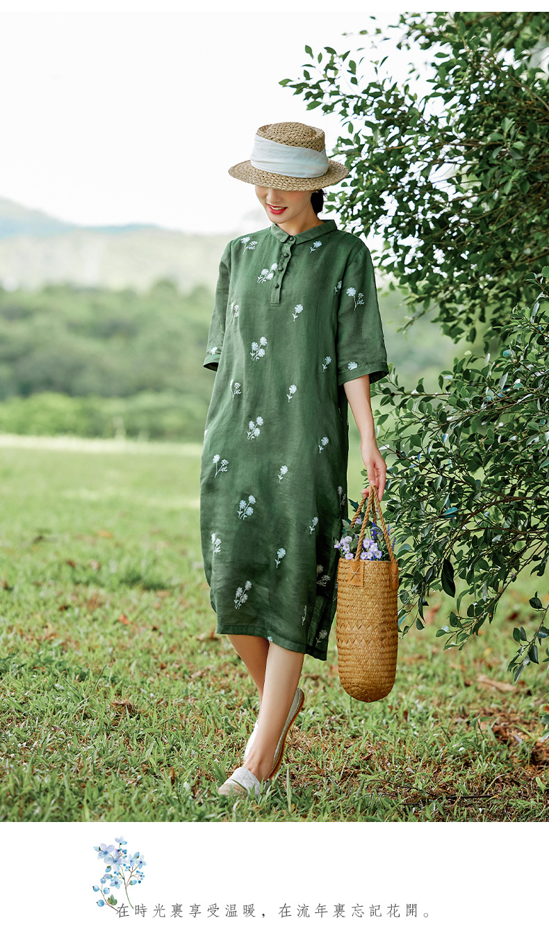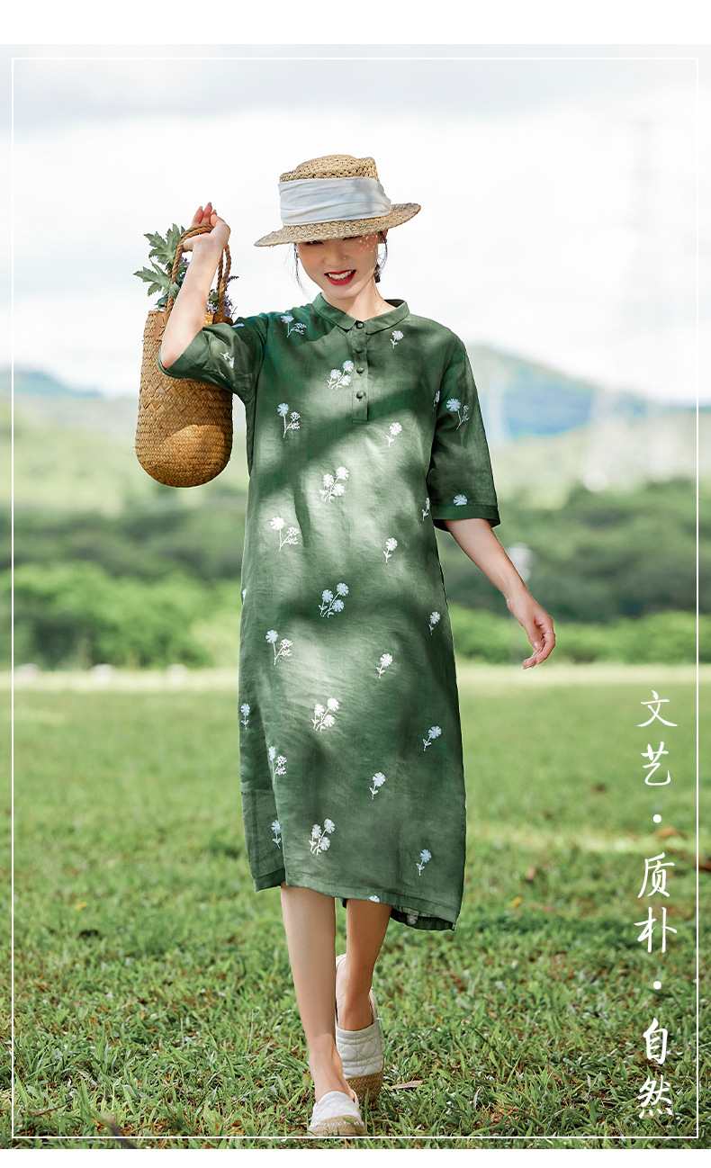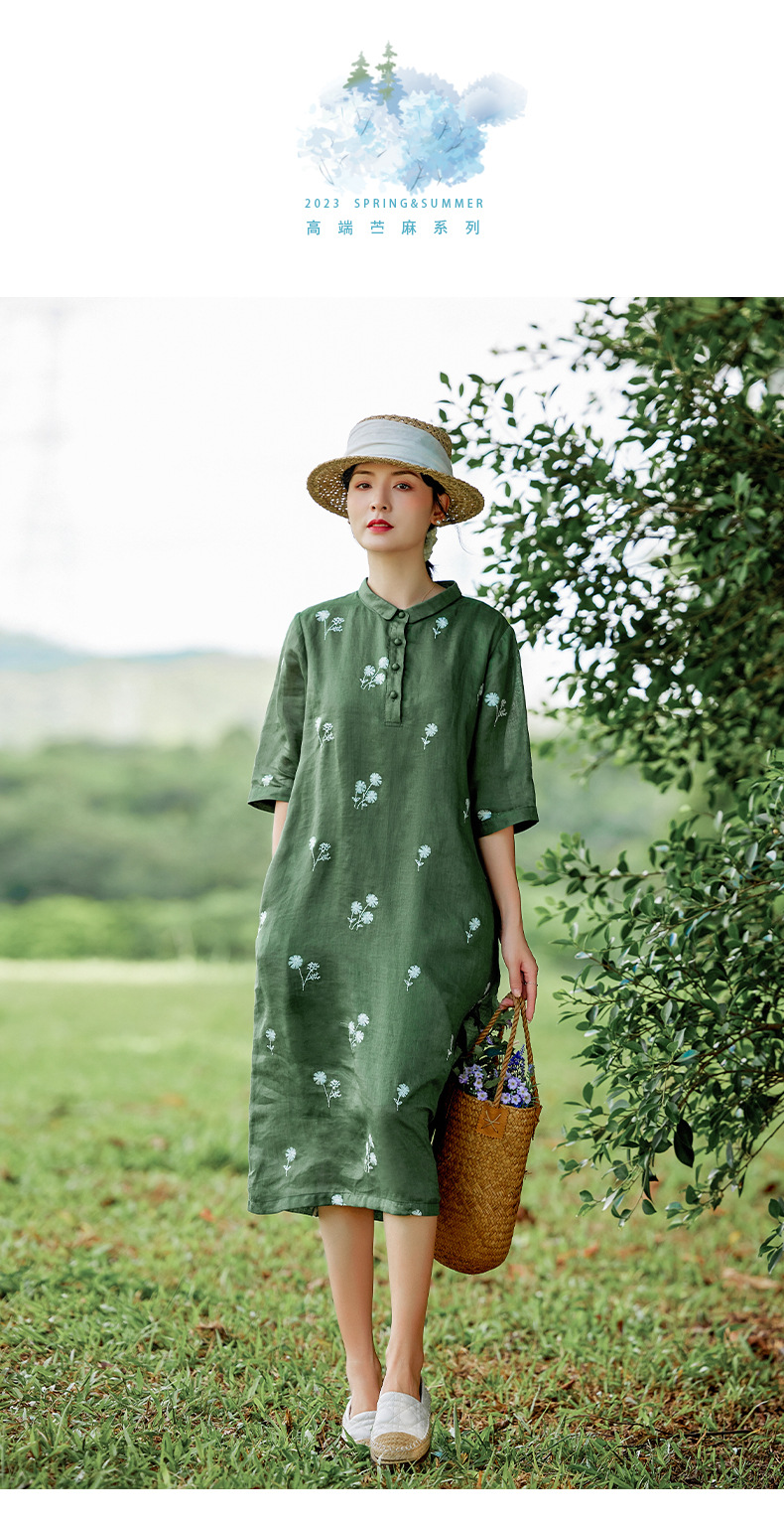 HM-S409花朵刺绣纯苎麻连衣裙文艺风复古翻领中长款改良式旗袍裙夏季新款