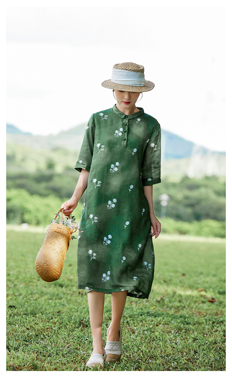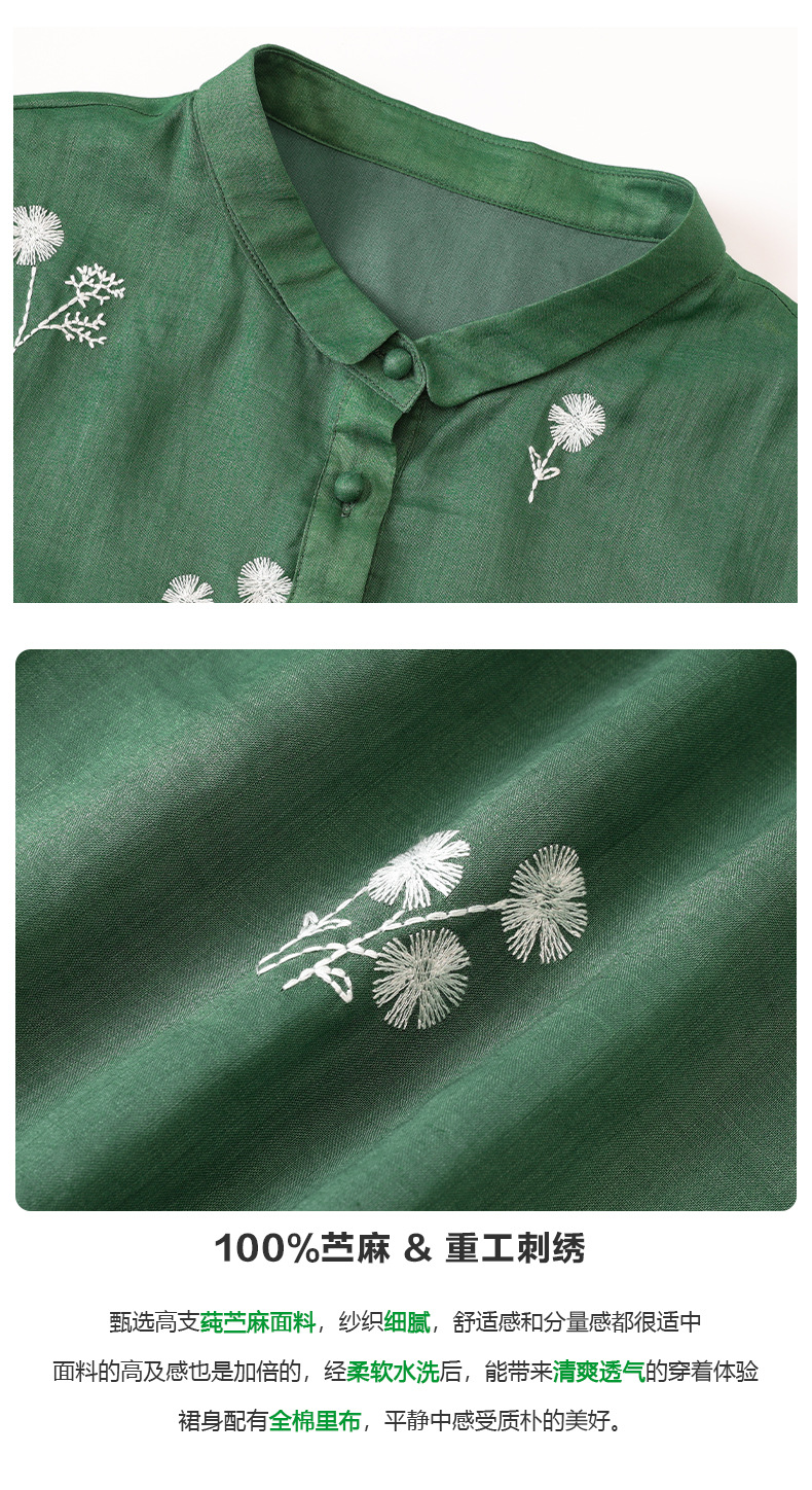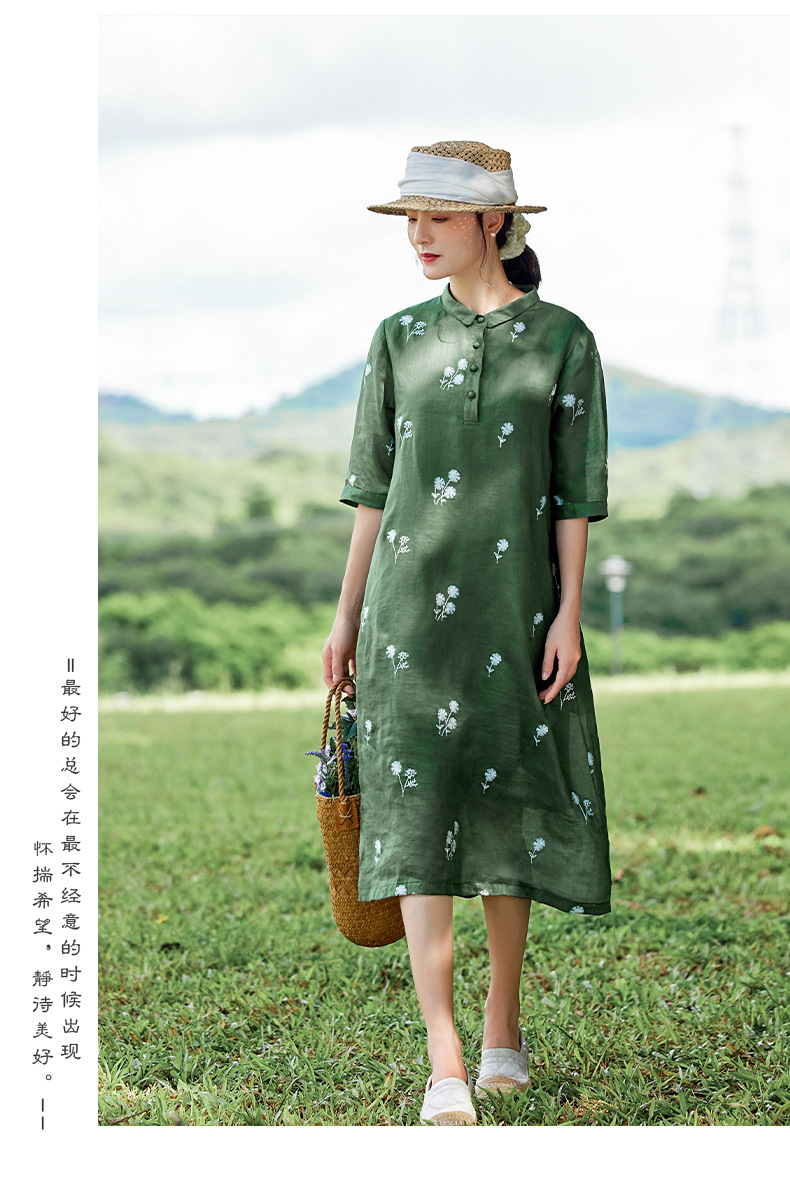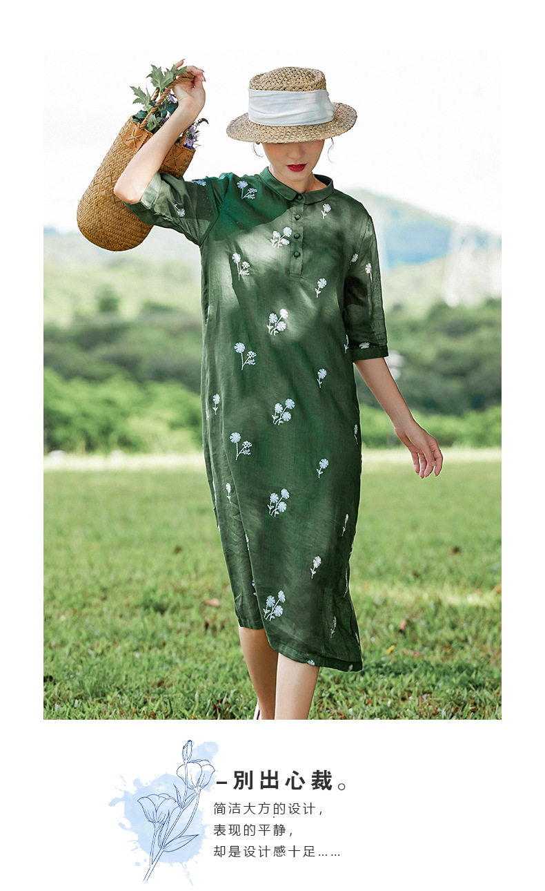 HM-S409花朵刺绣纯苎麻连衣裙文艺风复古翻领中长款改良式旗袍裙夏季新款