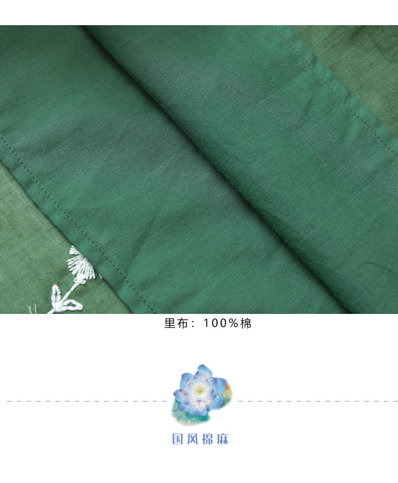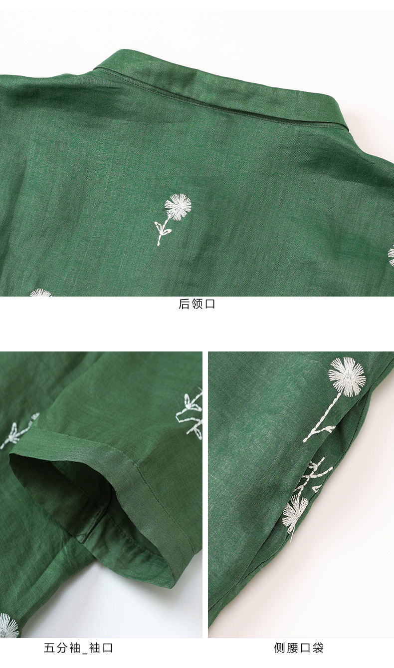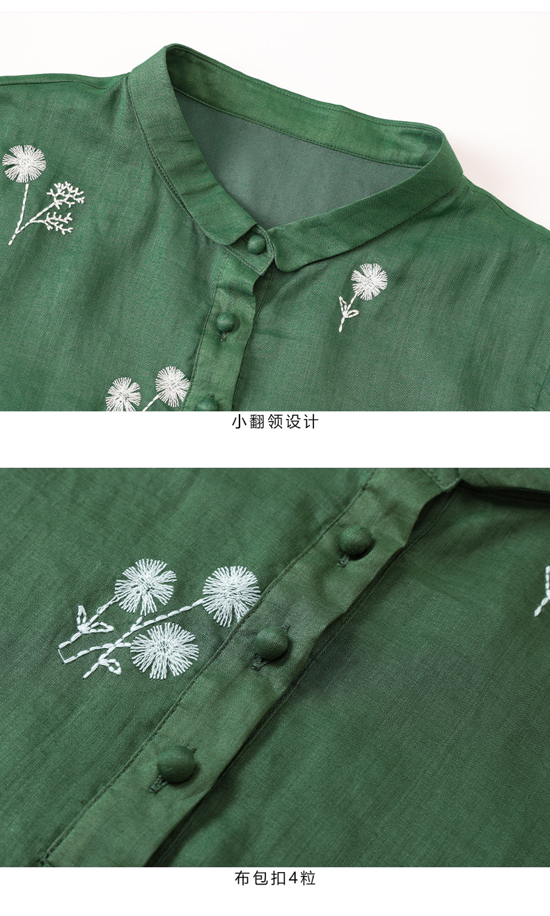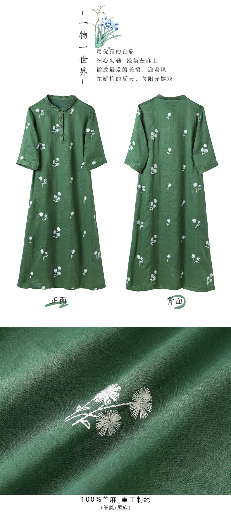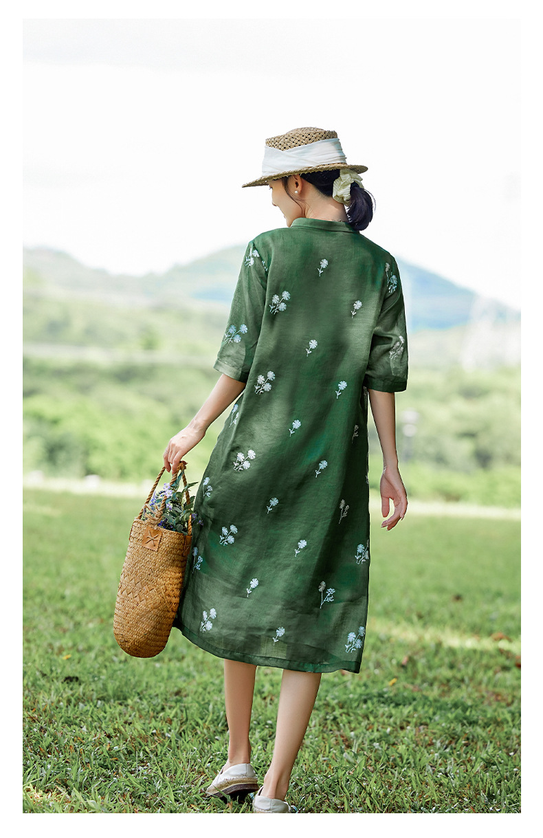 HM-S409花朵刺绣纯苎麻连衣裙文艺风复古翻领中长款改良式旗袍裙夏季新款