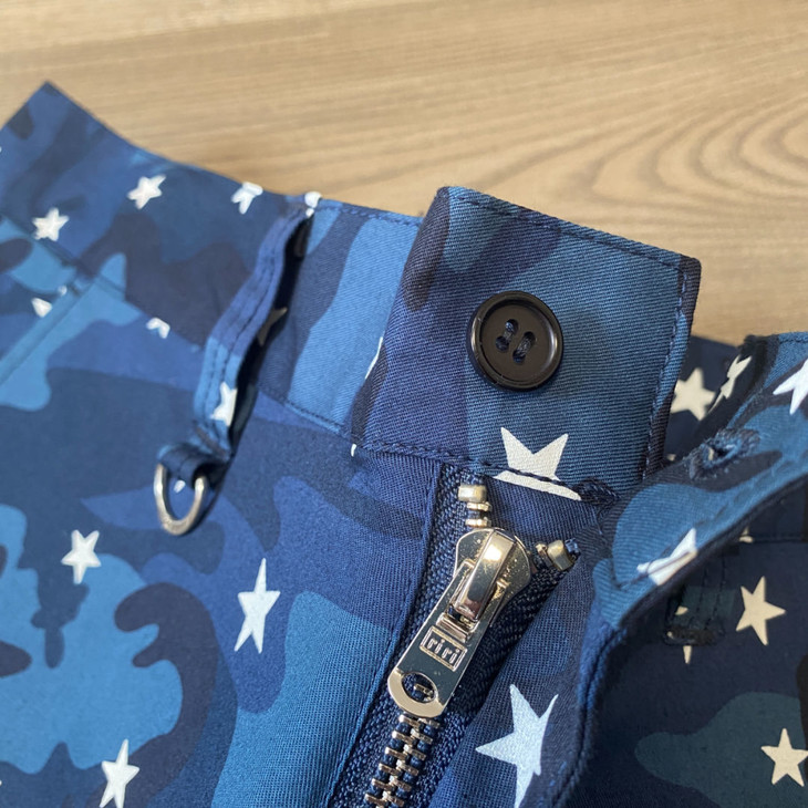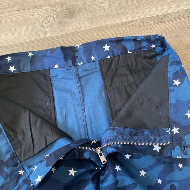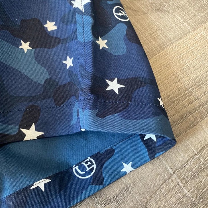 95棉 5氨纶弹性纤维,定染迷彩藏青配色,和面料融为一体 非印花,NAVY(藏青)几乎成了uniform experiment的代表色,无论是自身的产品还是合作产品中都贯彻了这一点。融入UE标识性的星星,以及藤原浩的FRAMGENT的闪电元素印花。