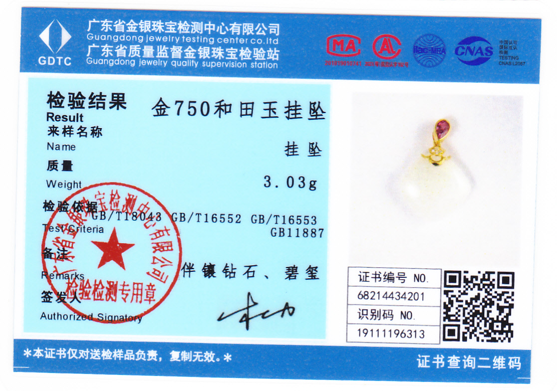 18K黄金和田玉(白玉)吊坠