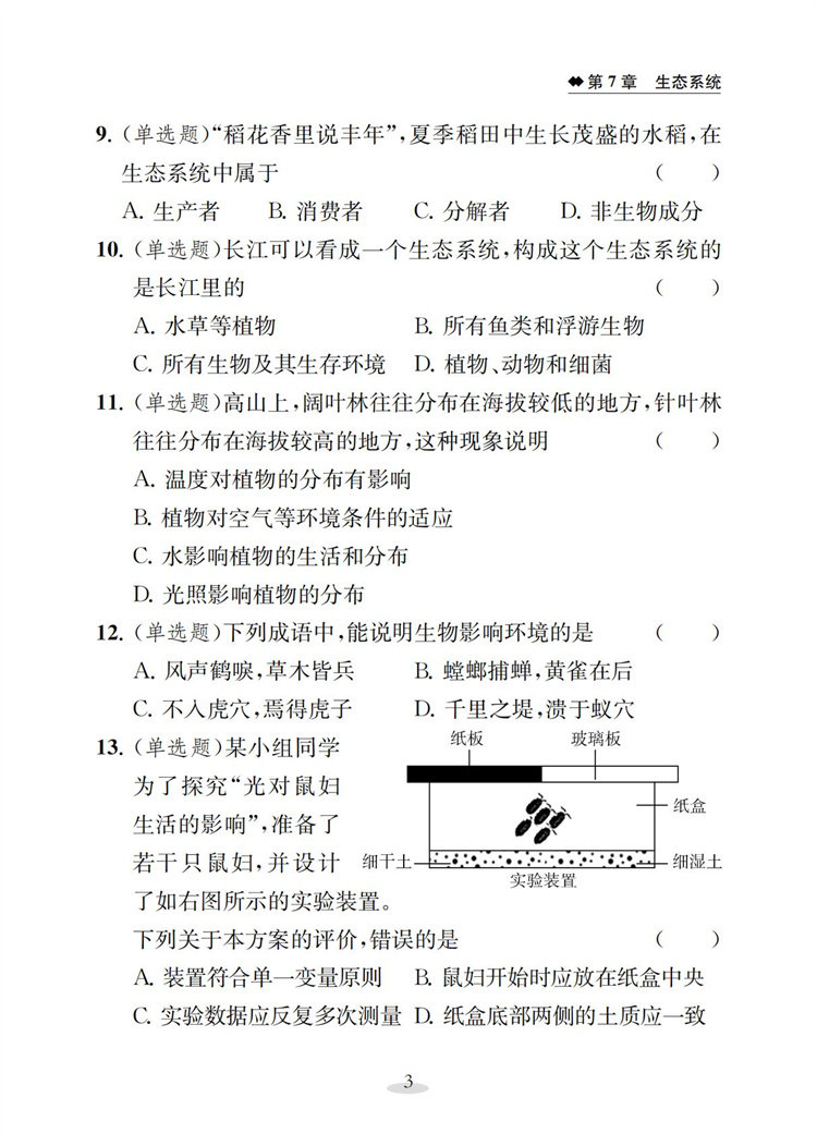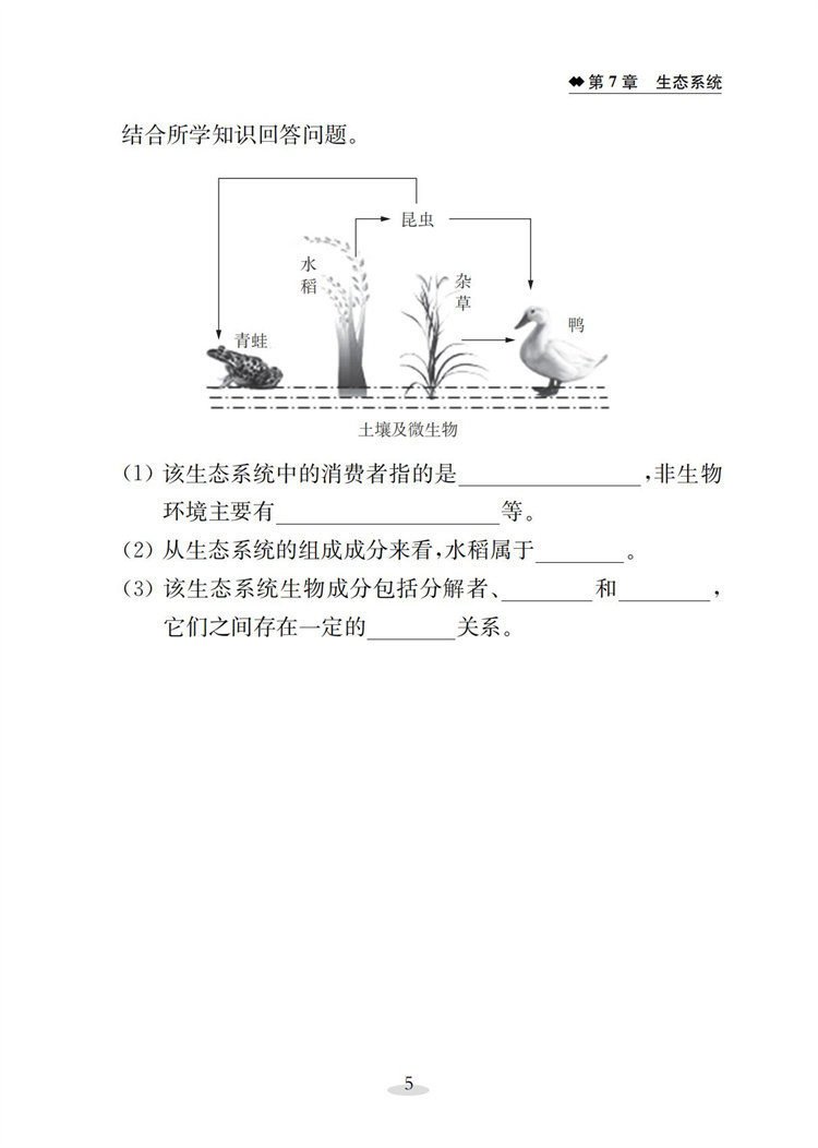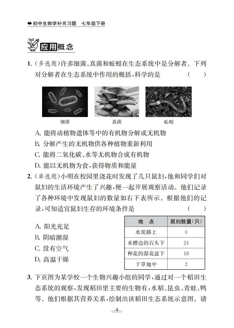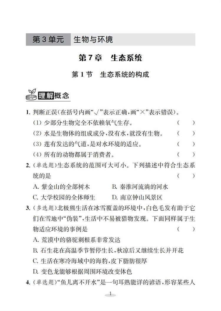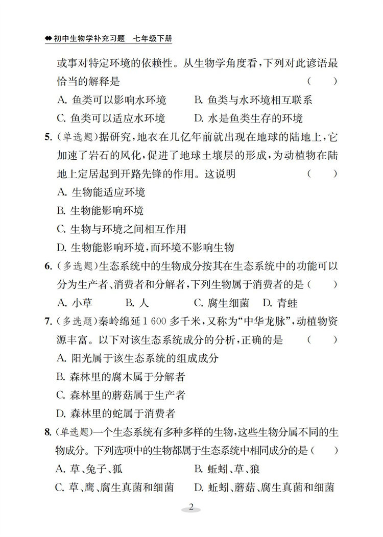 2026春 初中生物学补充习题七年级下册 苏教版7下 中学生物学教辅 同步习题集 学生用书 含答案 江苏凤凰教育出版社