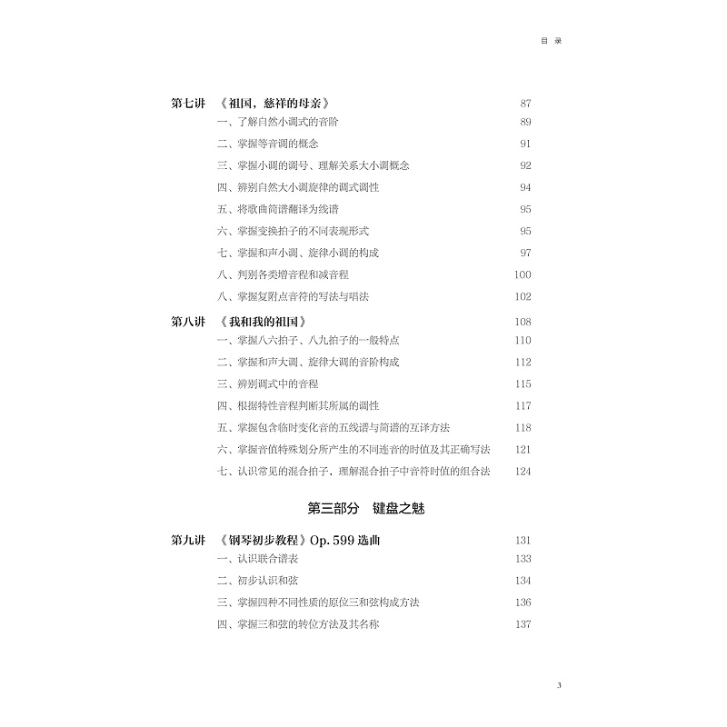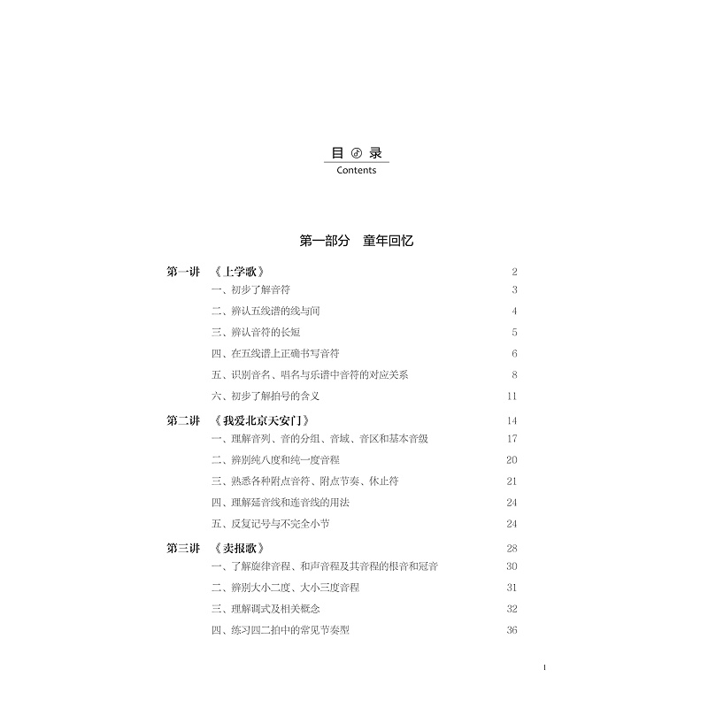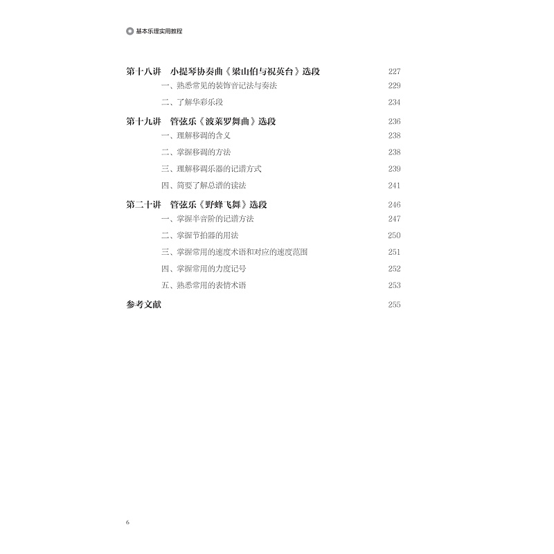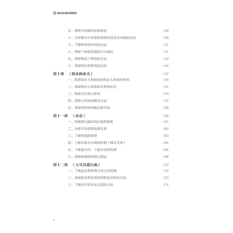 本教材内容主要内容为高职音乐类及其相关专业的基本乐科中的音乐基础理论(简称乐理)。一般来说,乐理是为演奏、演唱、创作、分析音乐作品等实践活动服务的。本教材具体教学内容包含了乐音体系的构成、属性、规律;五线谱与简谱的记谱法和读谱法;节拍的类型、节奏的类型以及节奏在不同拍子中的组合规律;常见的音乐术语,包含力度、速度属于和表情术语;常见的装饰音记号和其他音乐符号;音程的类型与音程的转位等;和弦的构成、和弦的性质判断及其转位和弦的构成和识别;调式类型、调号、调的关系;民族调式的特点及其判断;调式中的音程及其和弦;转调的类型和转调的分析;简谱与五线谱的互译;五线谱的移调等。基本上满足一般音乐作品中音乐理论上的需求。