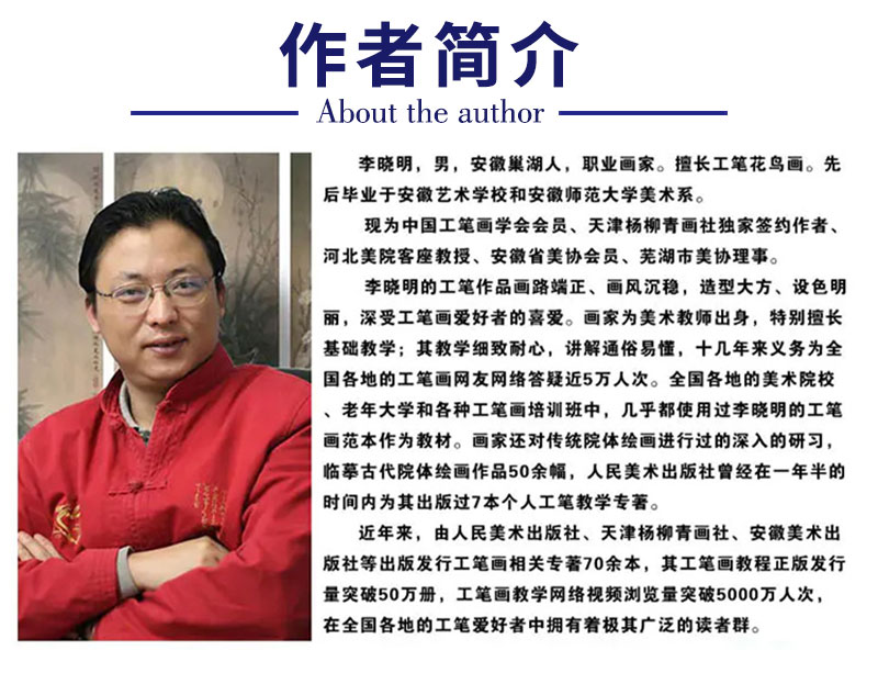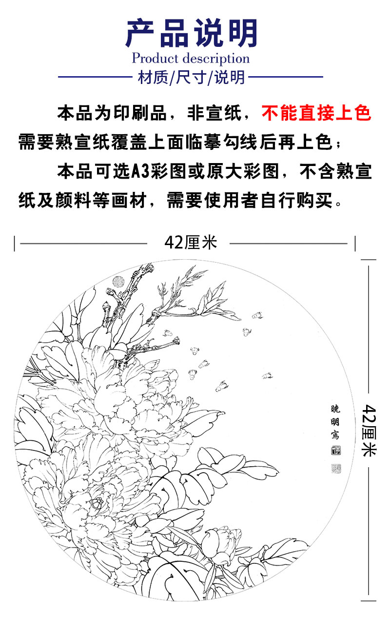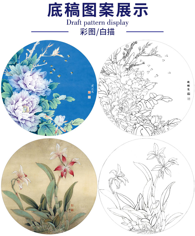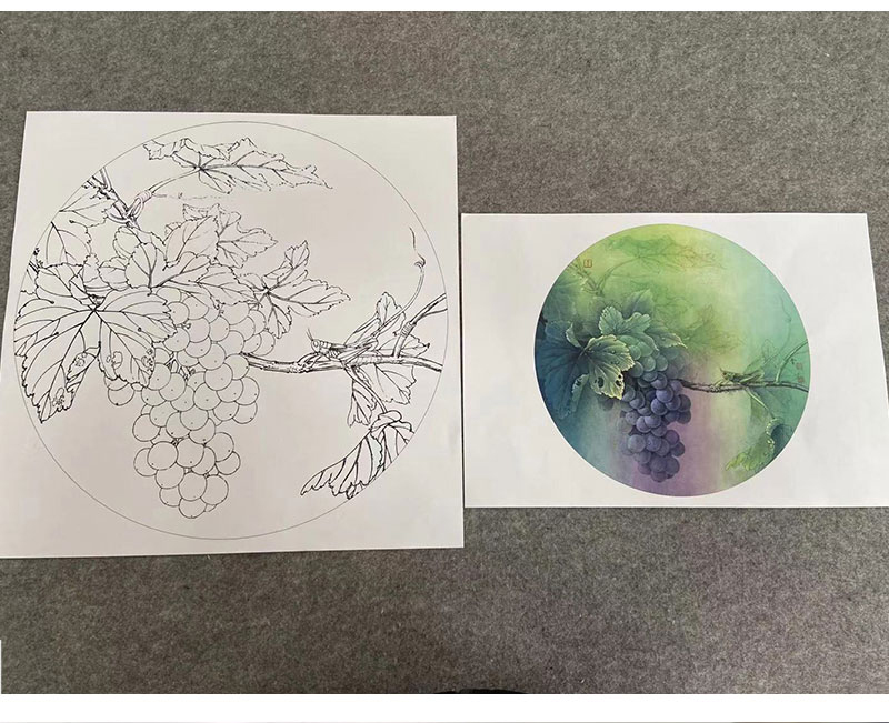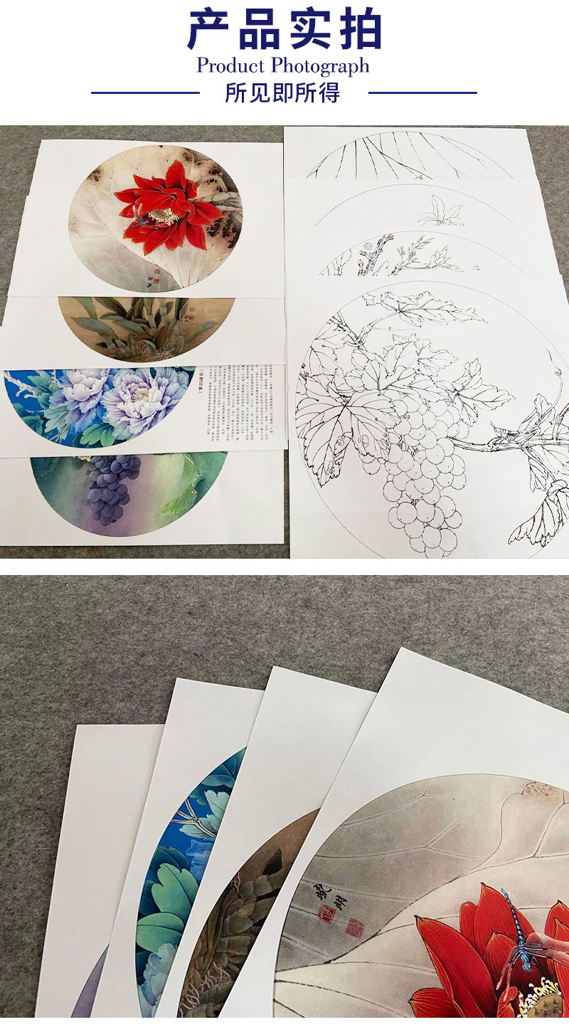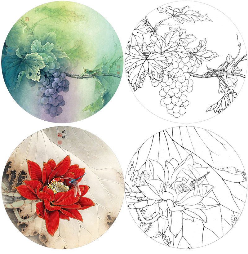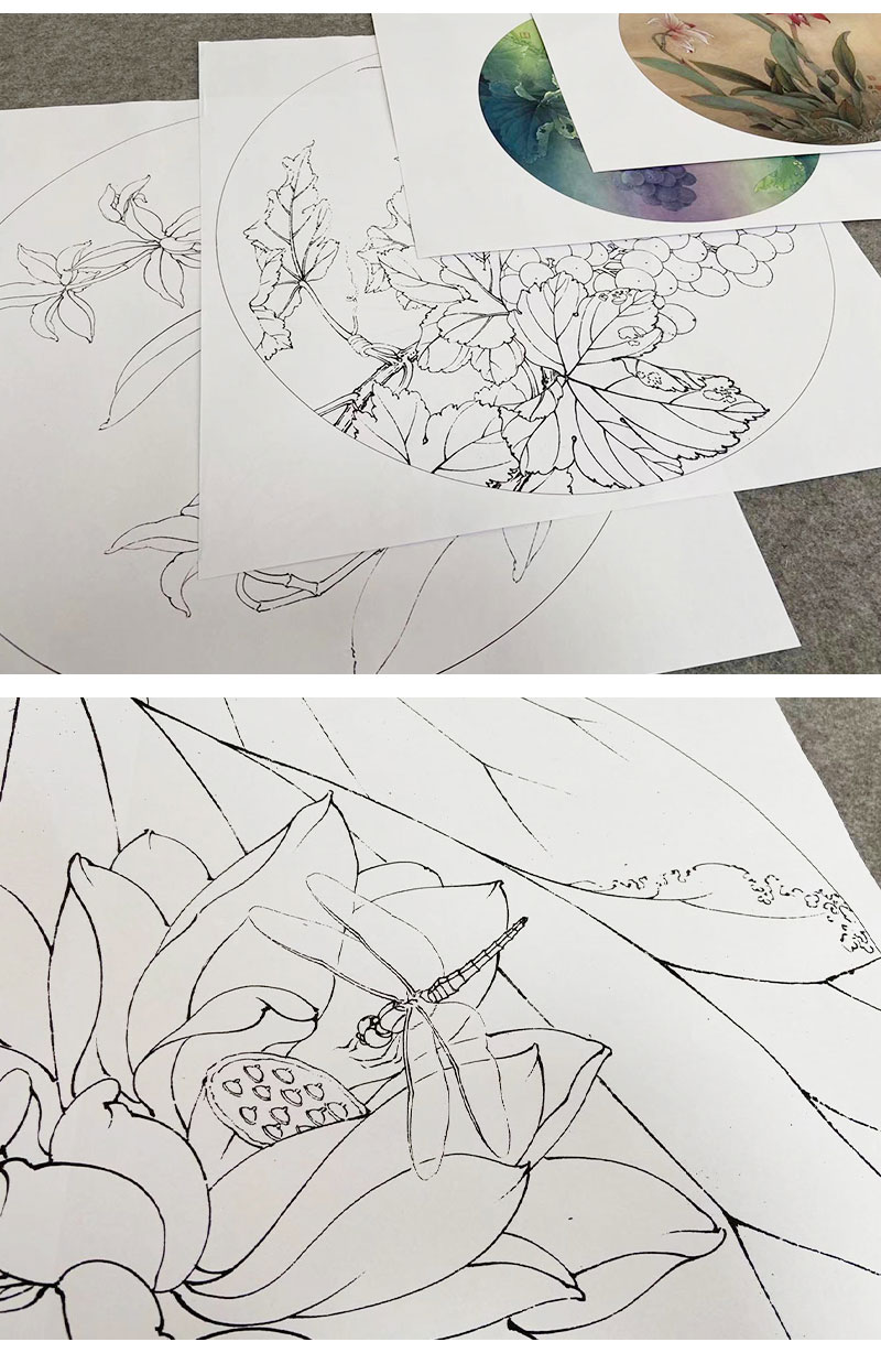 李晓明工笔花鸟画白描底稿葡萄牡丹小品一套四幅册页初学者尺寸42×42厘米TW01