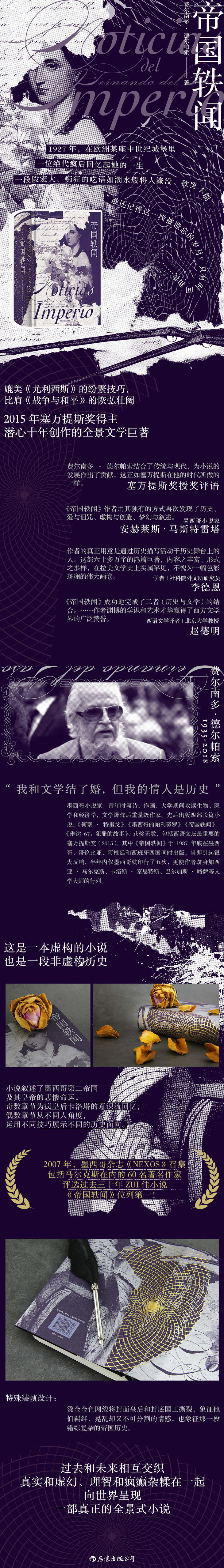 ◎ 费尔南多·德尔帕索曾在晚年的一次访谈中说“我和文学结了婚,但我的情人是历史”,这句话正可以用来形容《帝国轶闻》,小说叙述了墨西哥第二帝国的兴衰,在作者笔下历史和想象相互交织,真实和虚幻、理智和疯癫杂糅在一起,突破时空的局限,是比波拉尼奥《2666》更早的全景文学杰作。