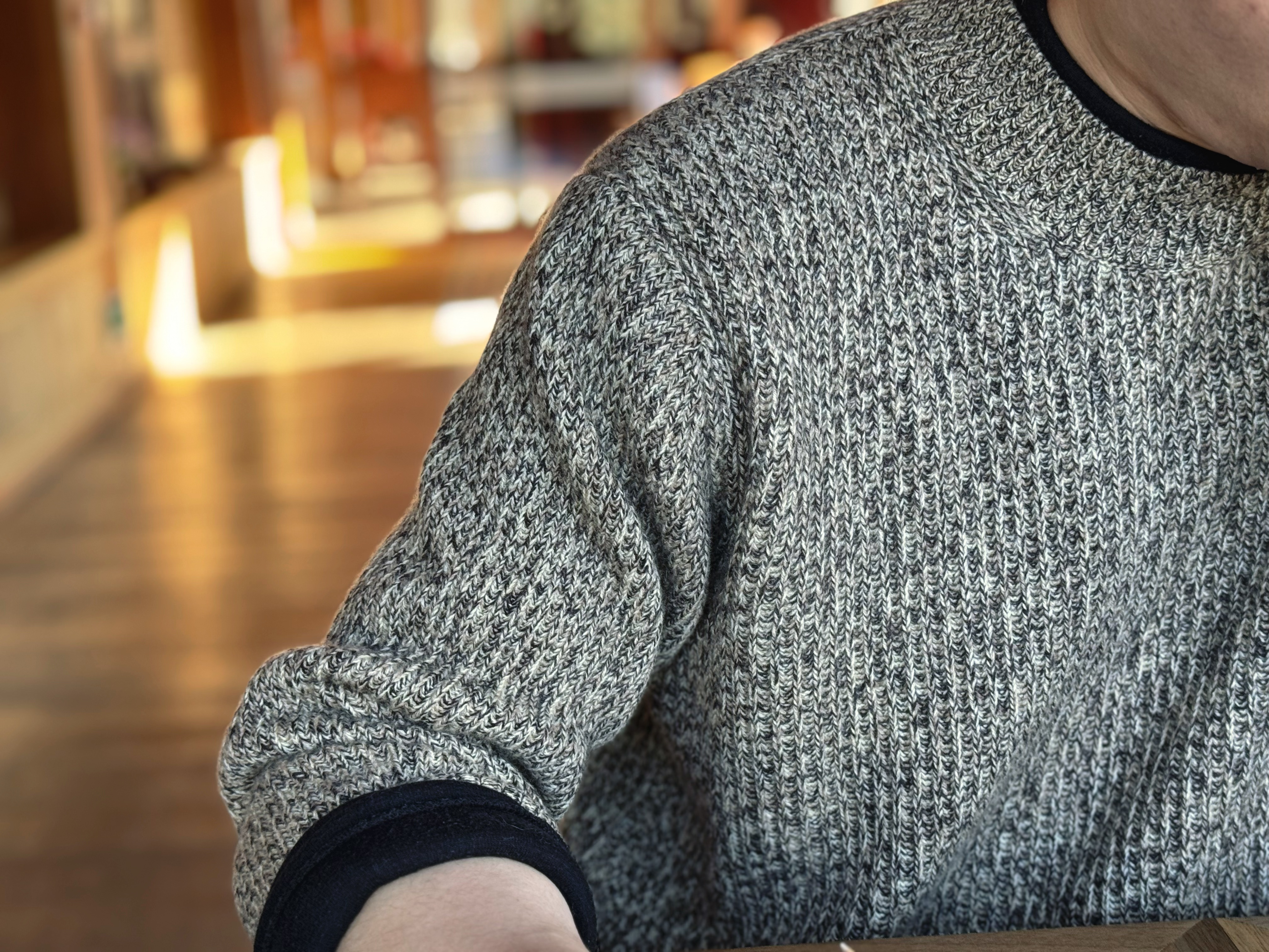 使用双面集圈组织的织法,通过不脱圈形成凸纹效果,用料更多,增加厚实感