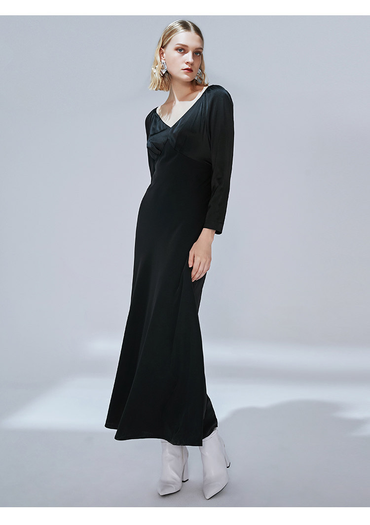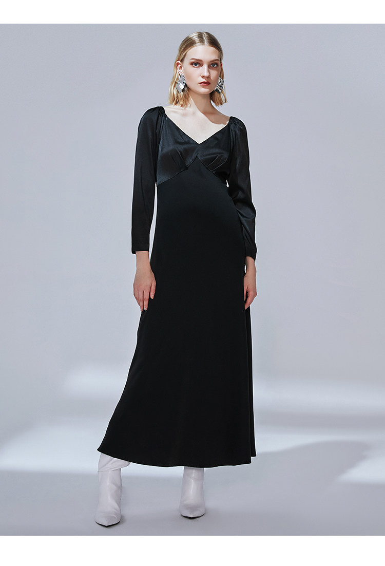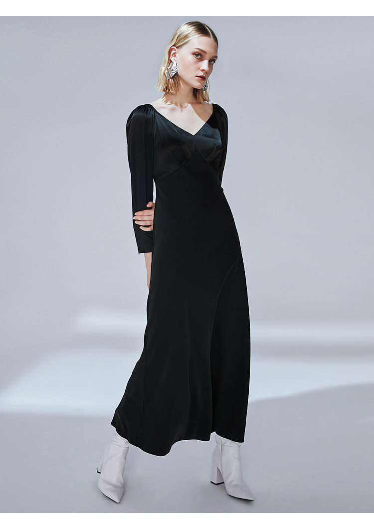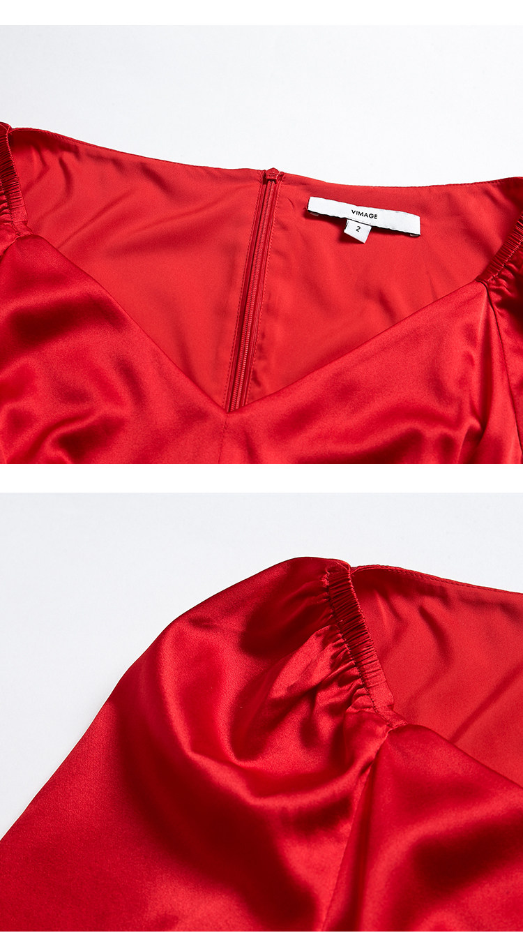 VIMAGE纬漫纪秋款时尚性大V领复古泡泡袖修身礼服连衣裙V1477005