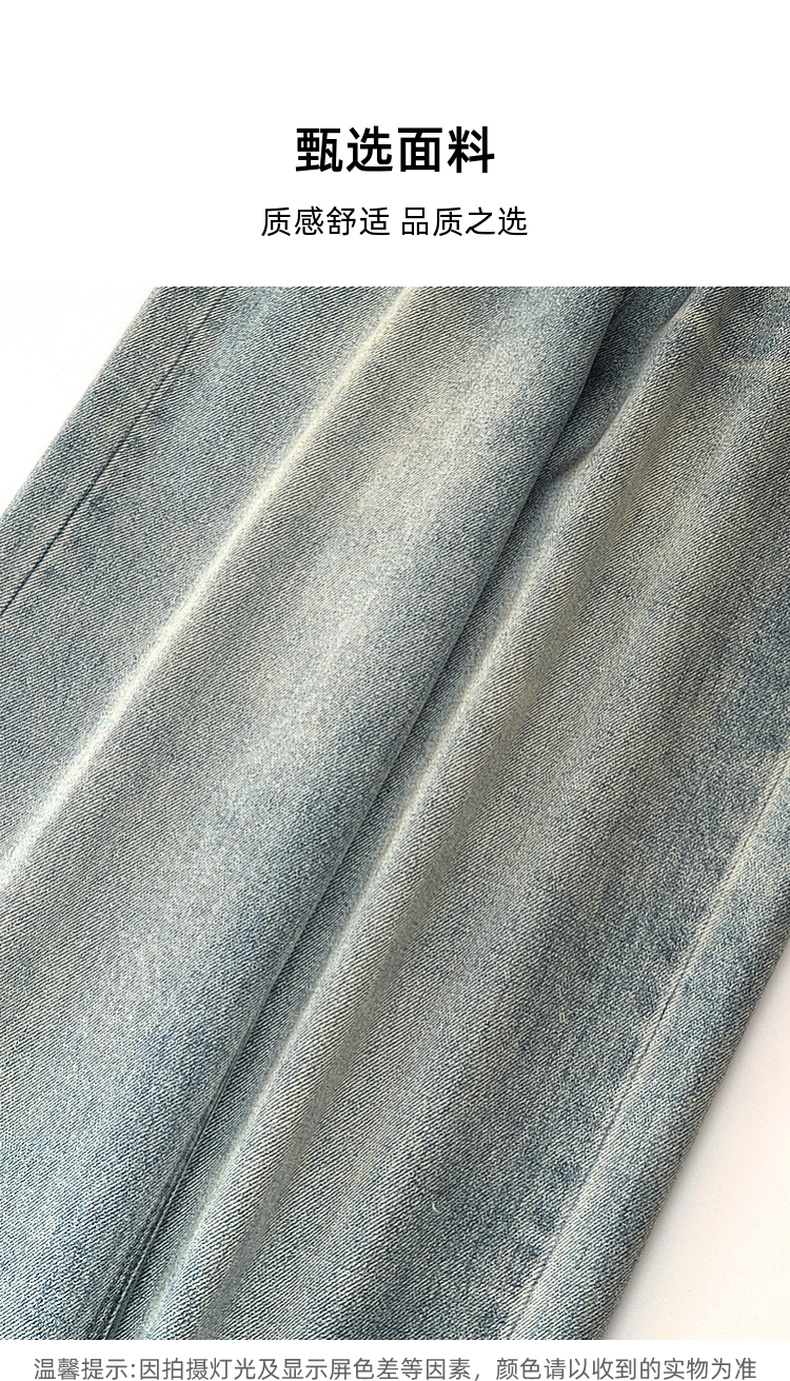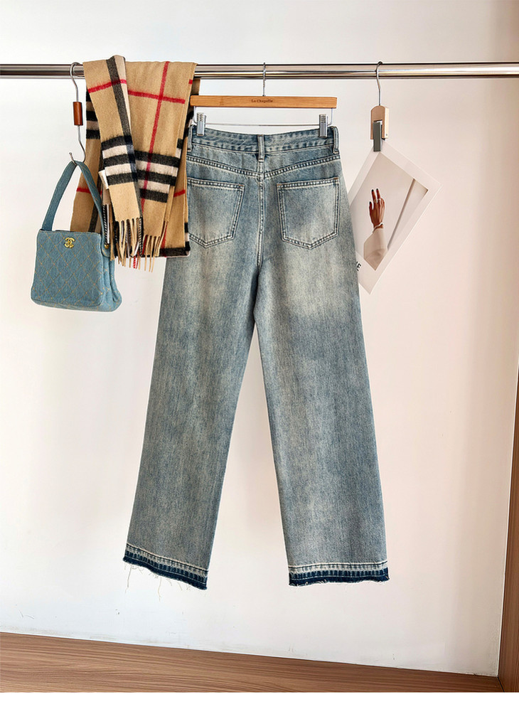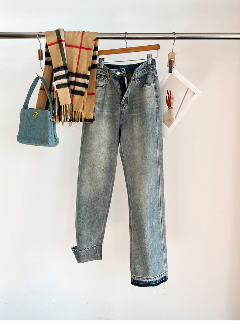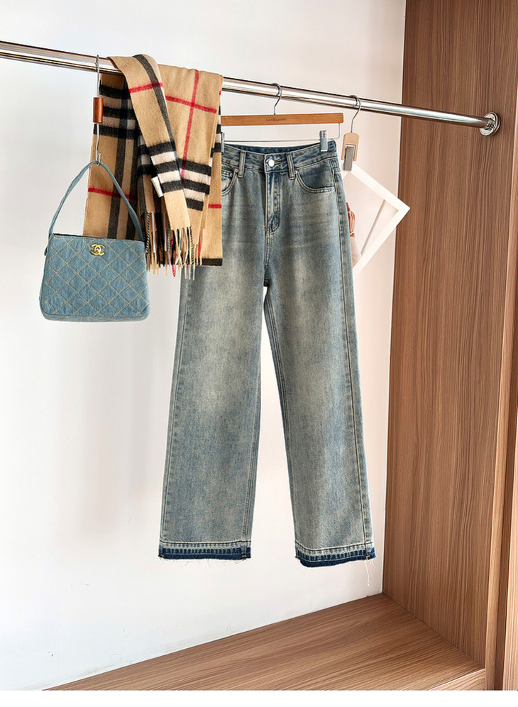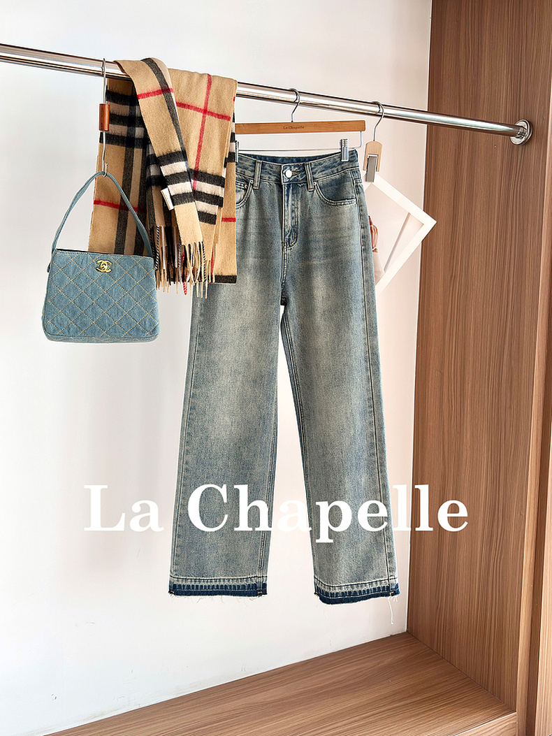 专柜实拍【细腿/复古毛边】拉夏贝尔/La Chapelle高腰遮胯显瘦直筒裤复古水洗浅蓝牛仔裤