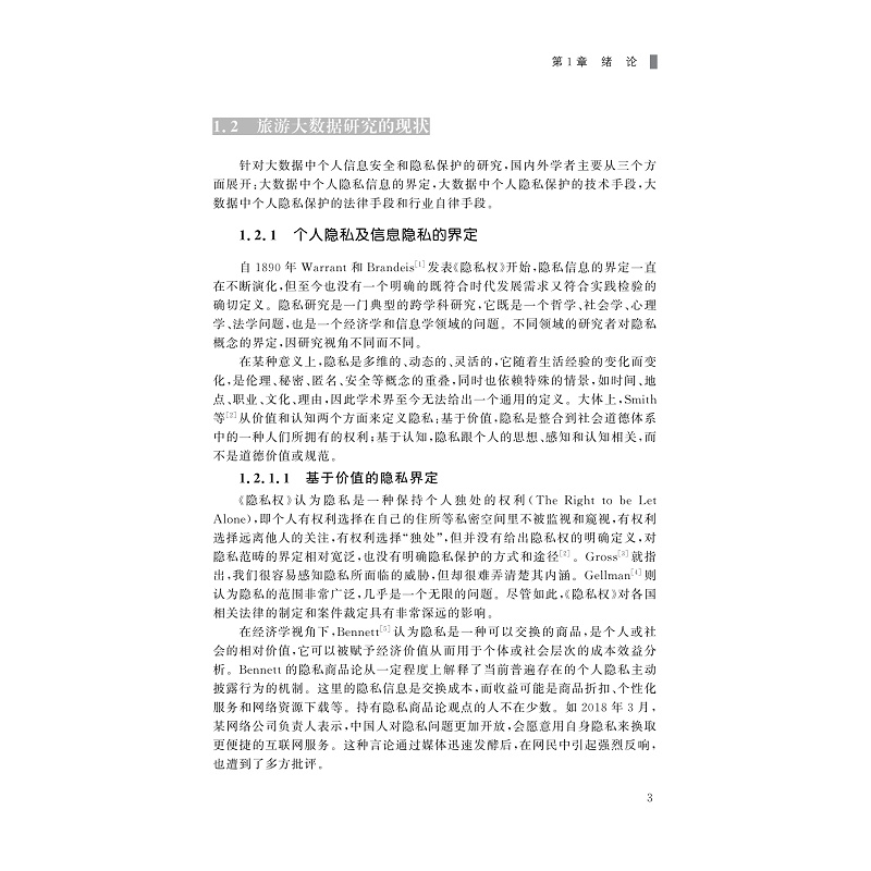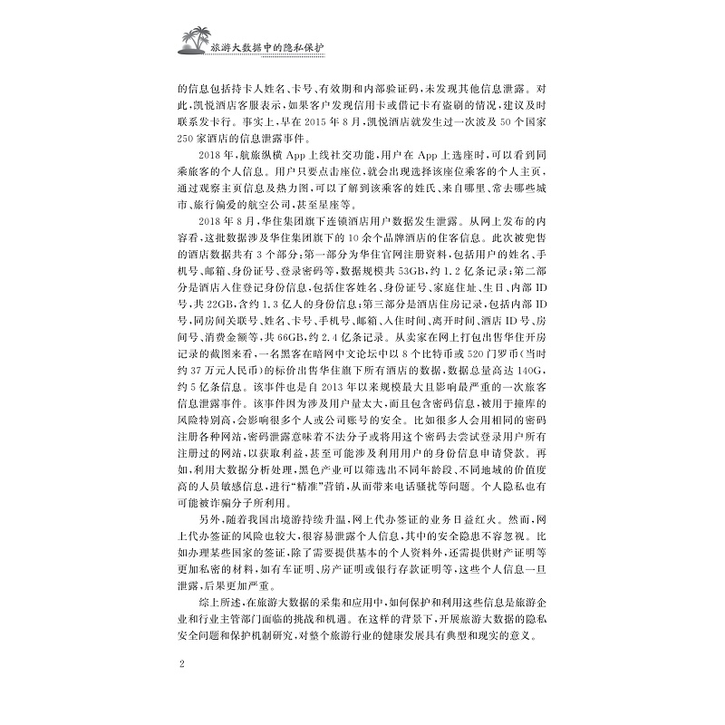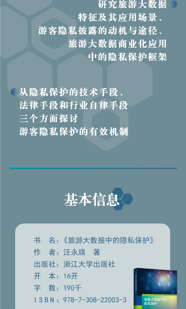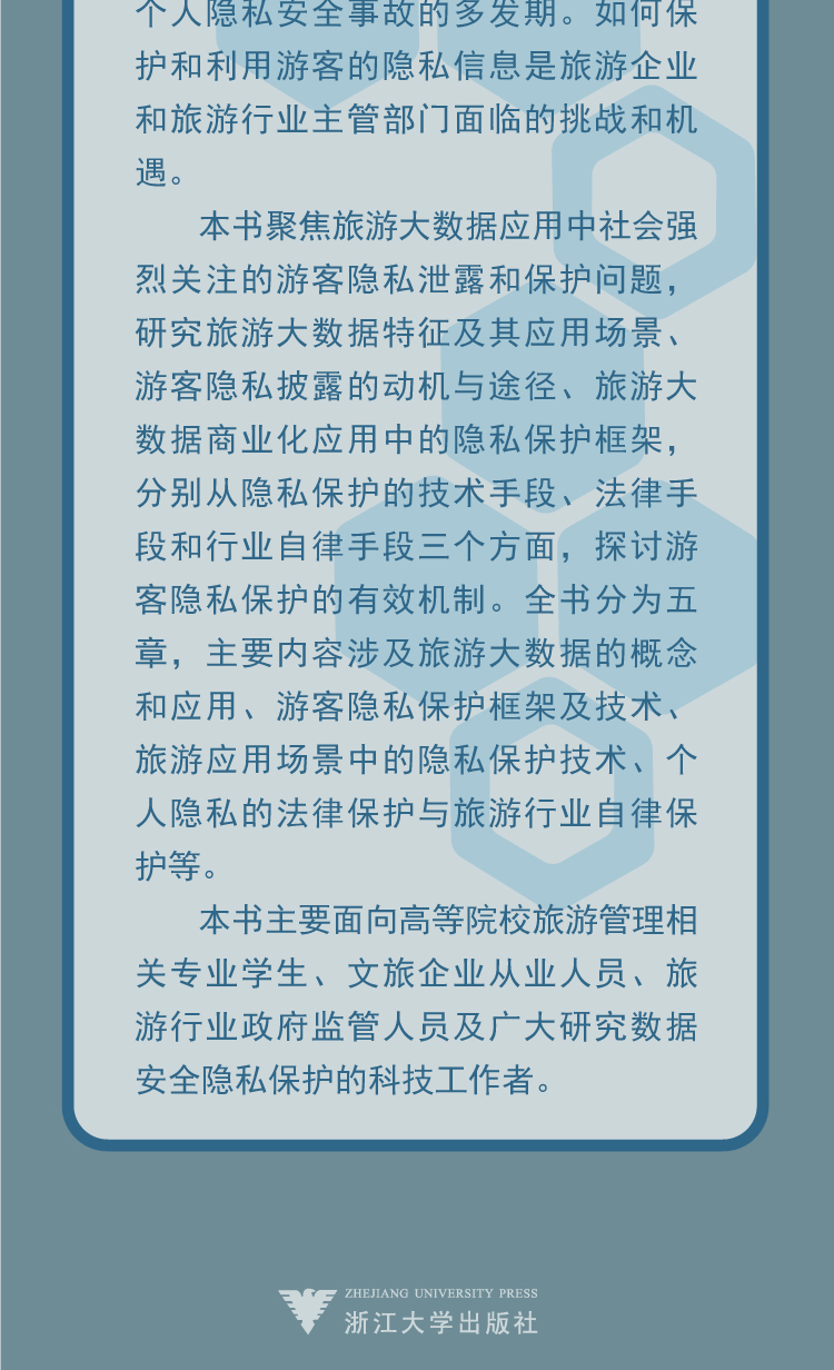 近年来,频频爆出的游客隐私泄漏事件,为我国的旅游隐私安全敲响了警钟,也标志着旅游行业进入到了个人隐私安全事故的多发期。如何保护和利用个人隐私信息是旅游企业和旅游行业主管部门面临的挑战和机遇。本书聚焦大数据应用中社会强烈关注的游客隐私泄漏和保护问题,研究旅游大数据特征及应用场景、游客隐私披露的动机与途径、旅游大数据商业化应用中的隐私保护框架,分别从隐私保护的技术手段、法律手段和行业自律手段三个方面,探讨游客隐私保护的有效机制。