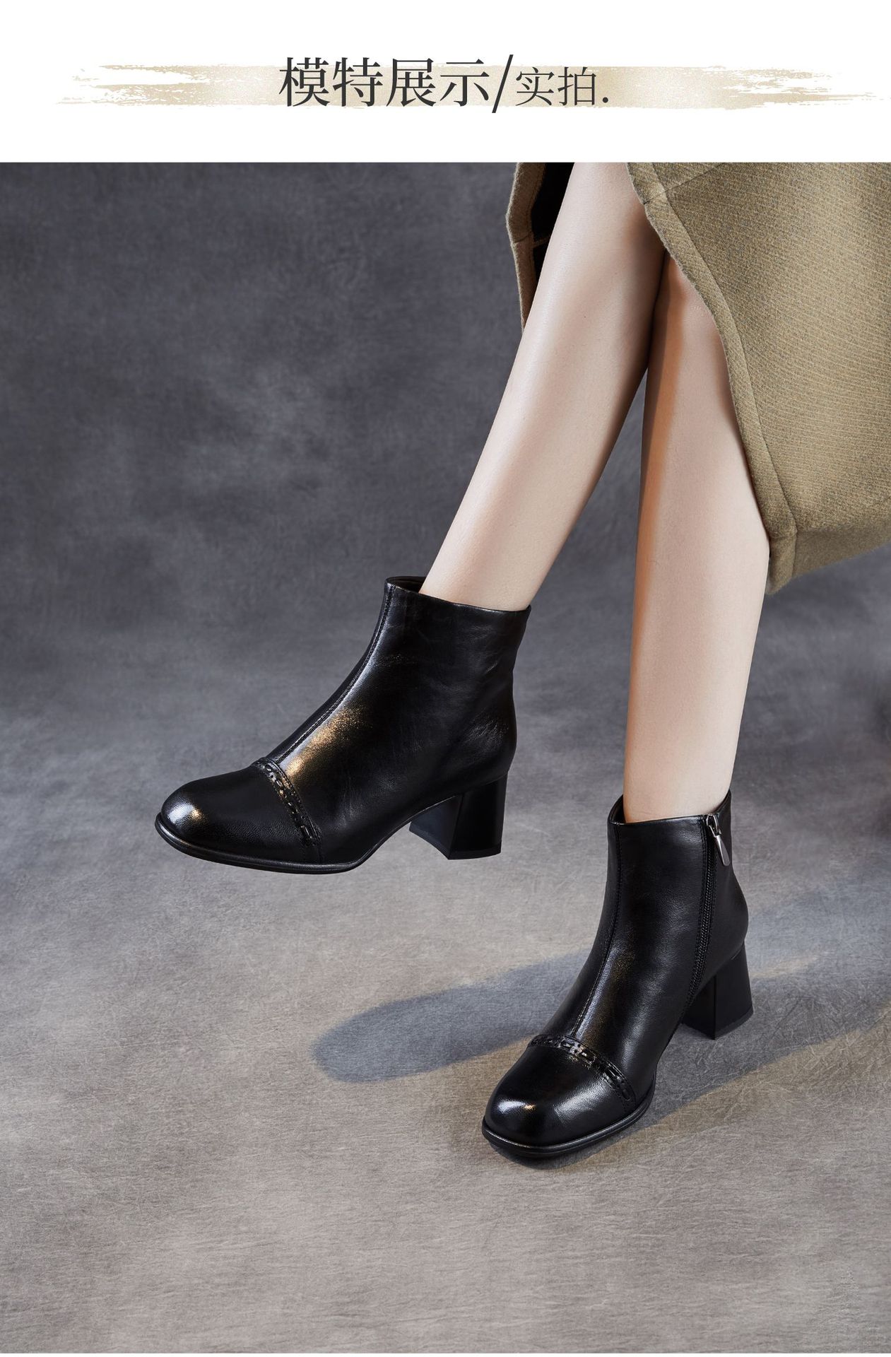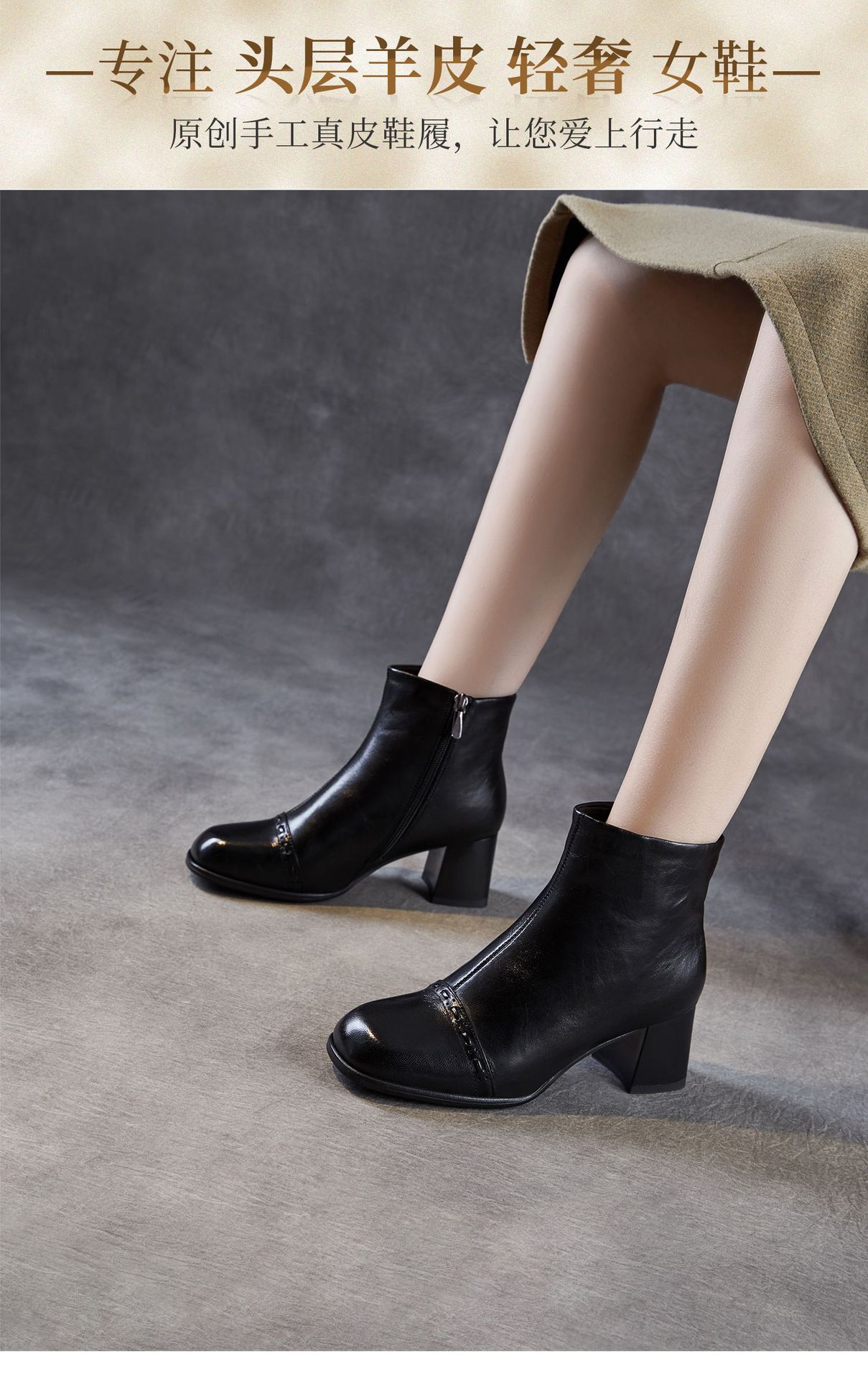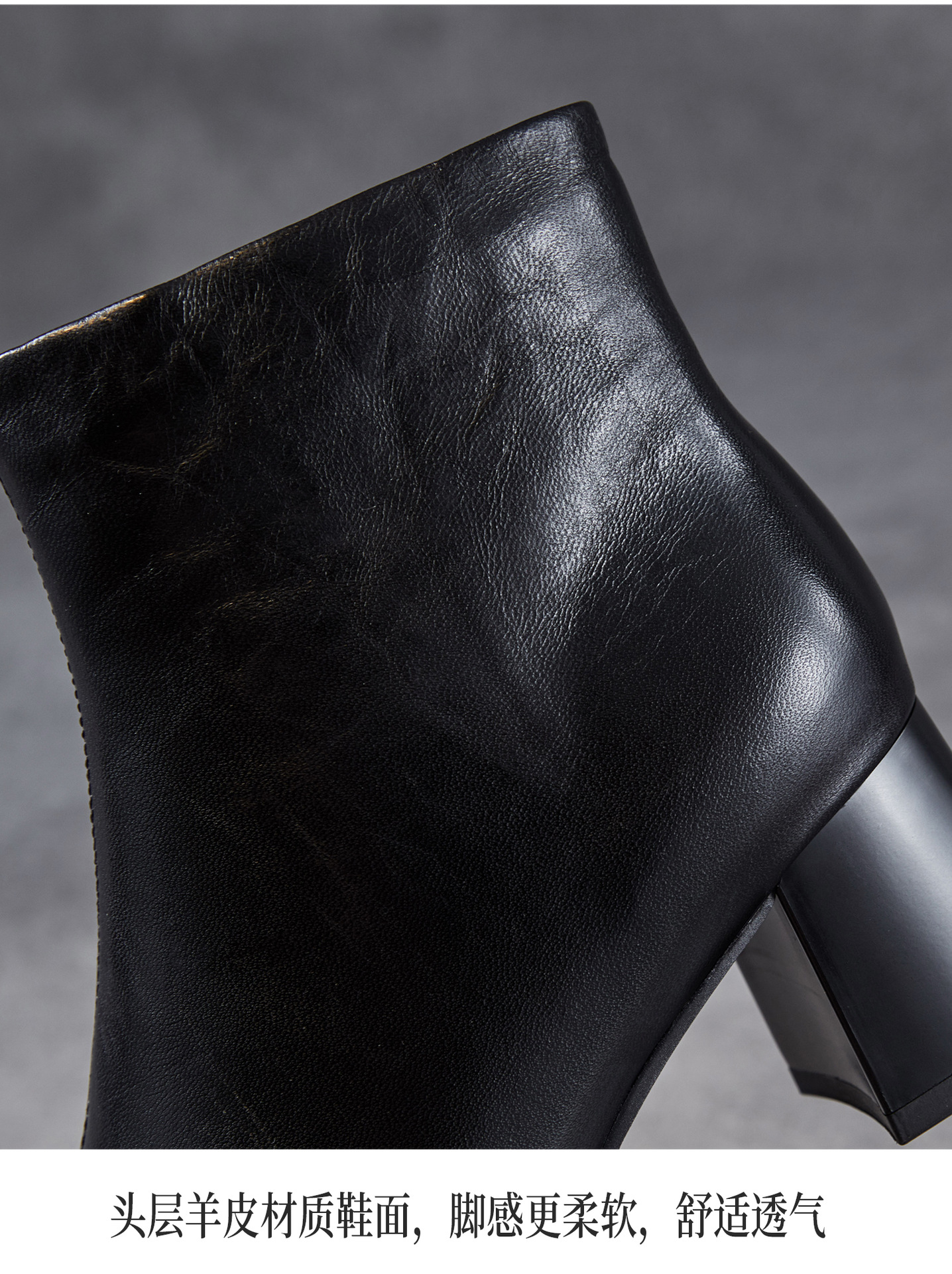 ZM 258688粗跟轻奢羊皮短靴软底真皮方头气质显瘦加绒靴