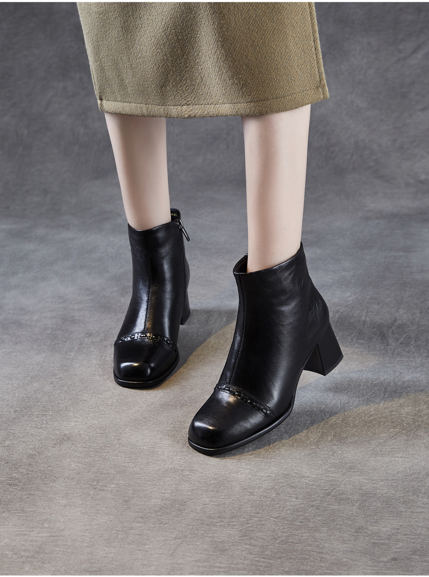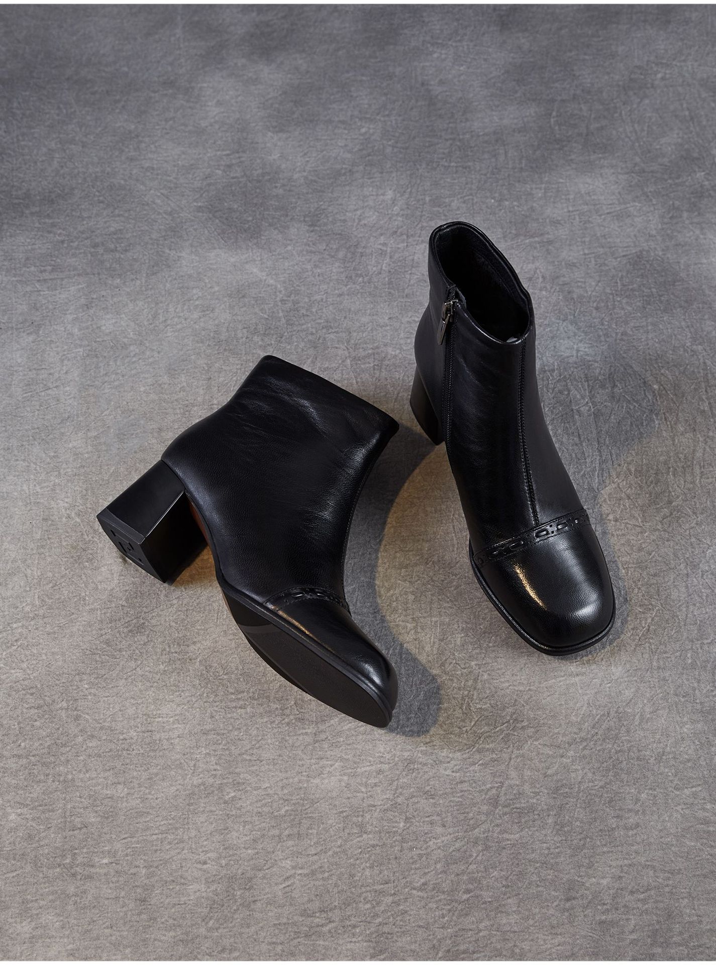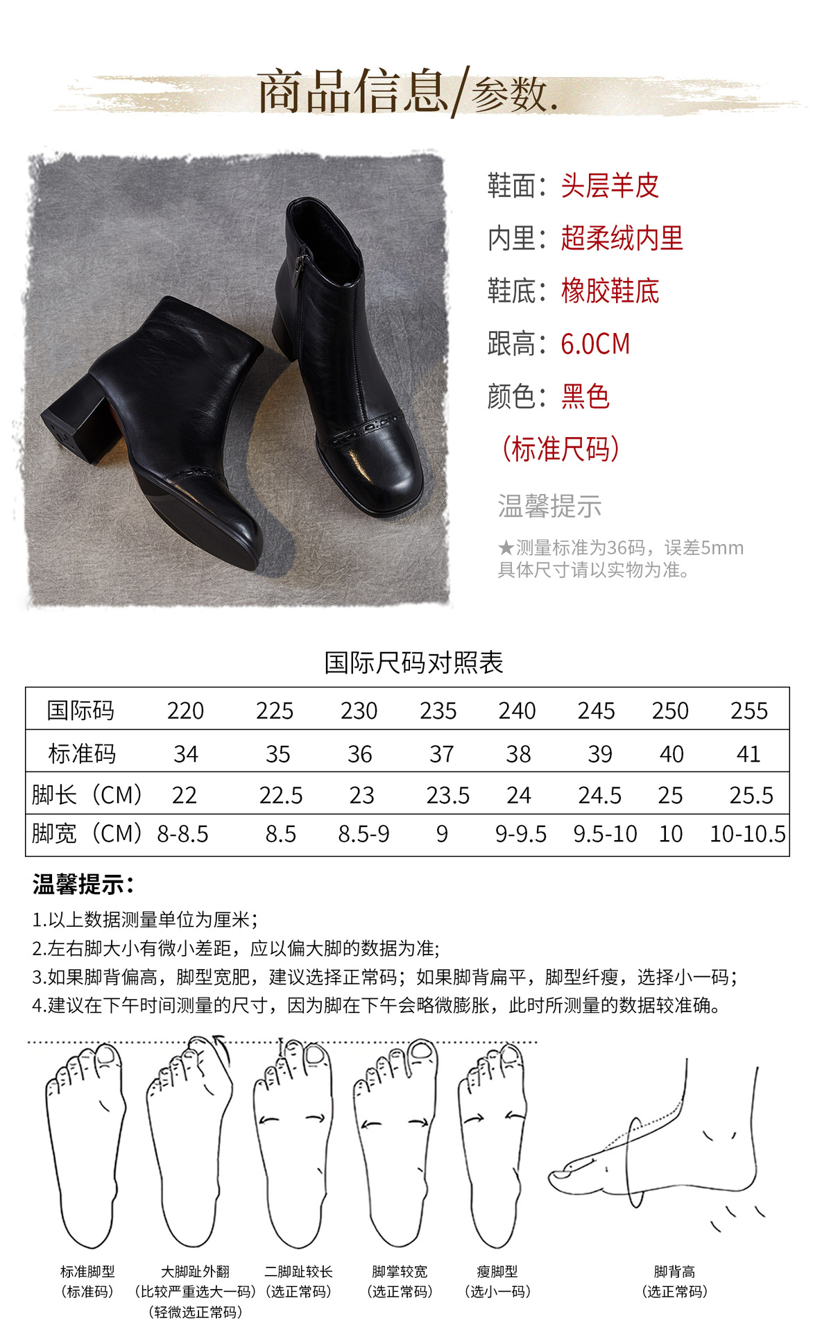 ZM 258688粗跟轻奢羊皮短靴软底真皮方头气质显瘦加绒靴
