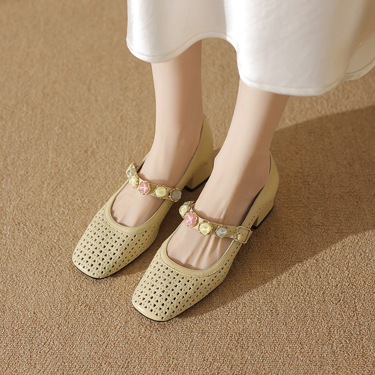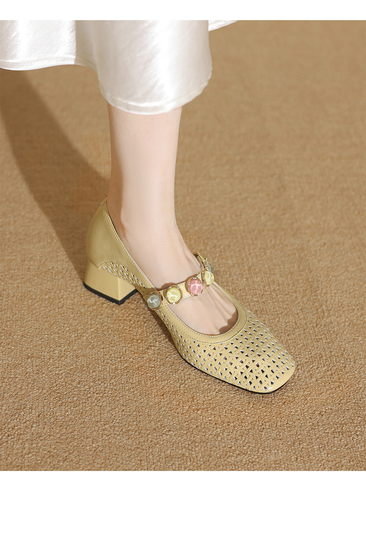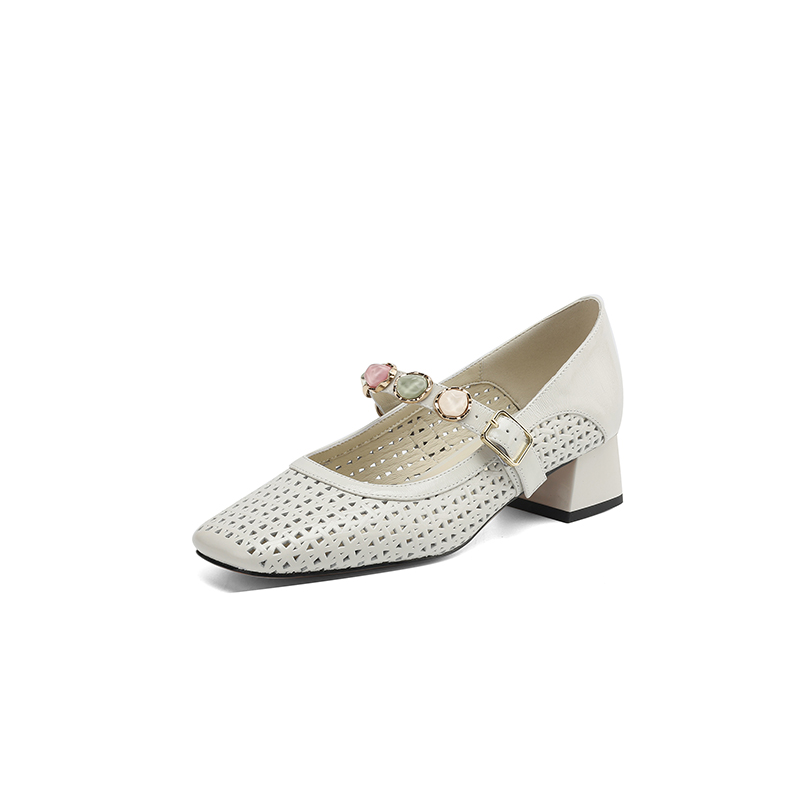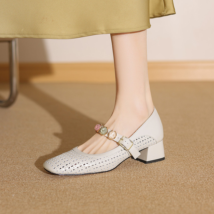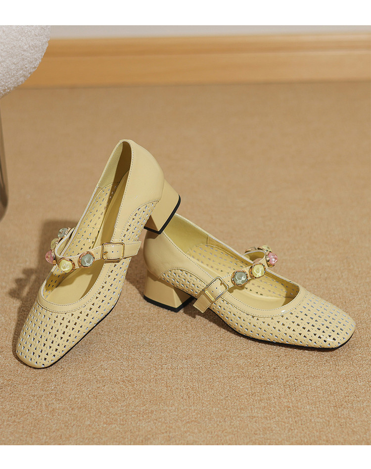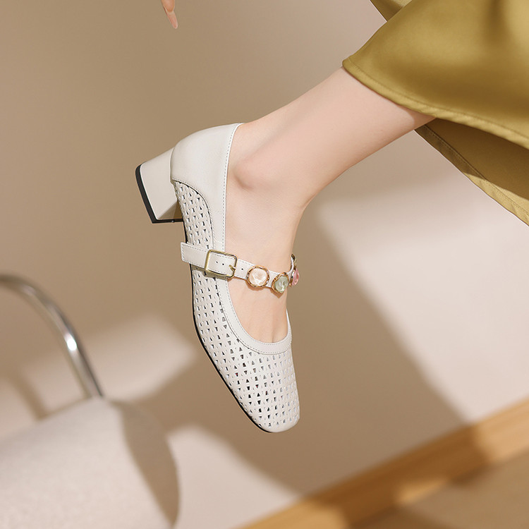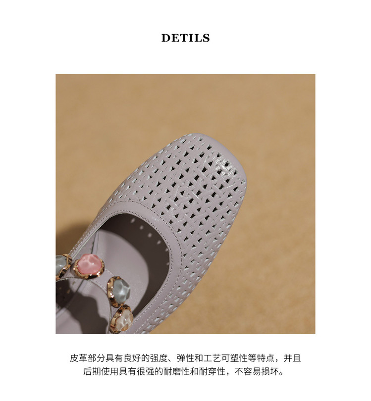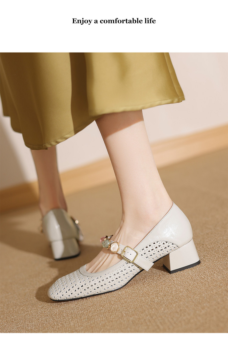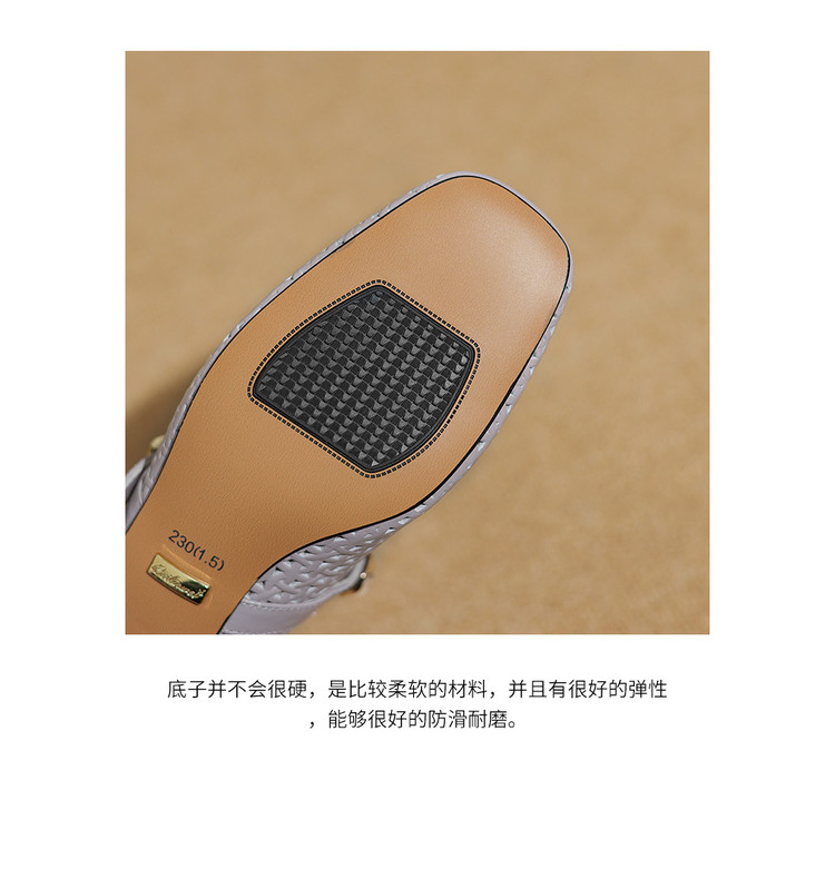 【预售5天】牛皮方头气质一字带单鞋春夏新款编织粗跟百搭休闲鞋女ZF&25098