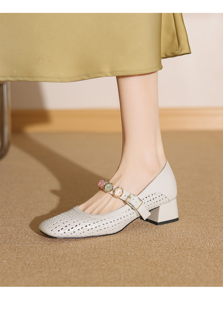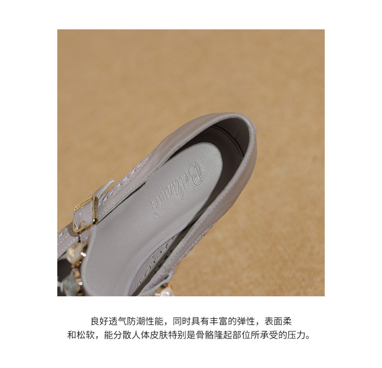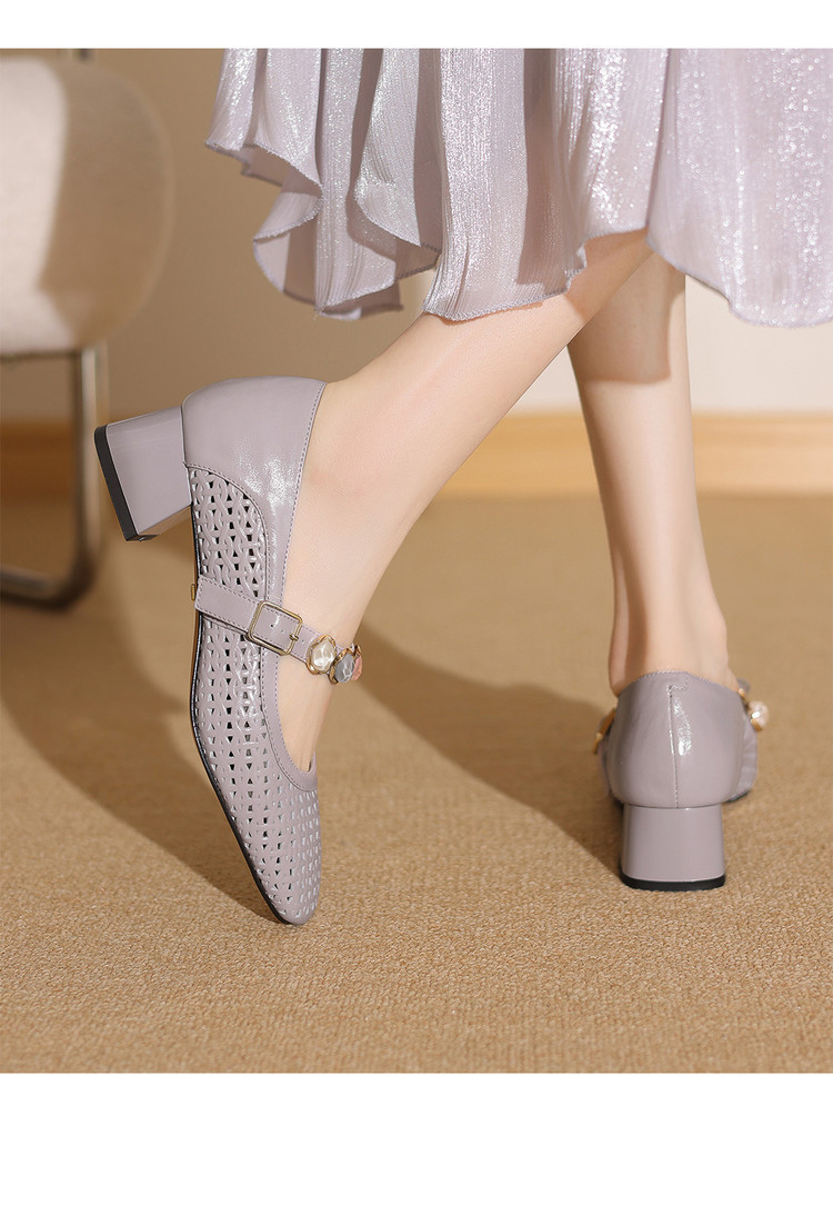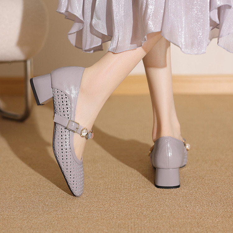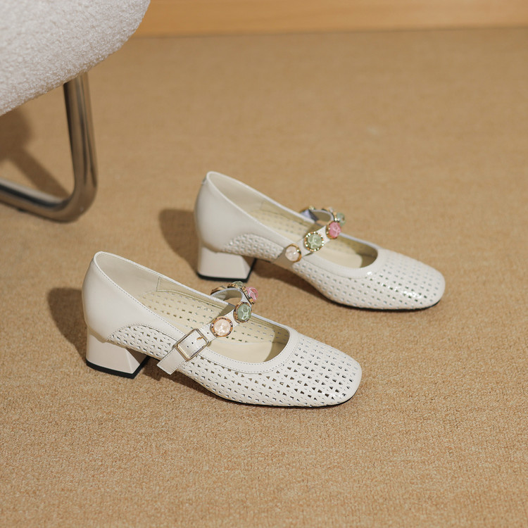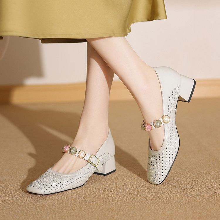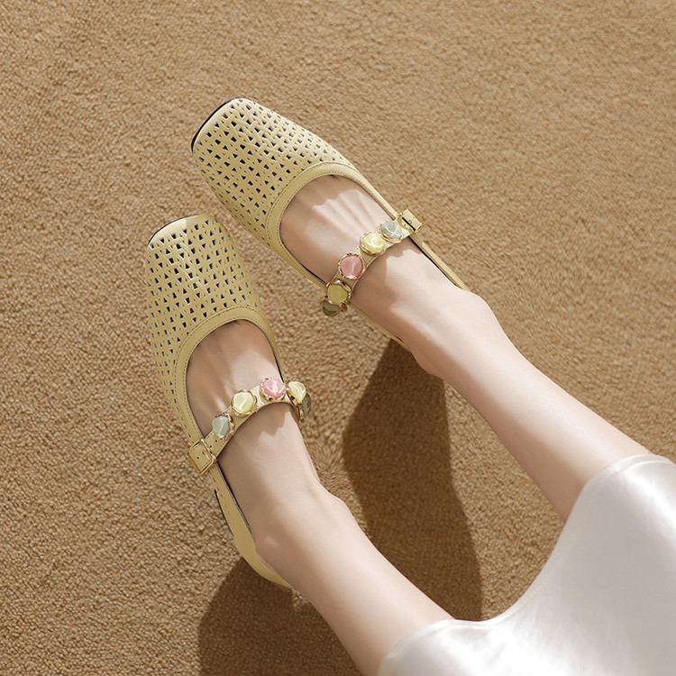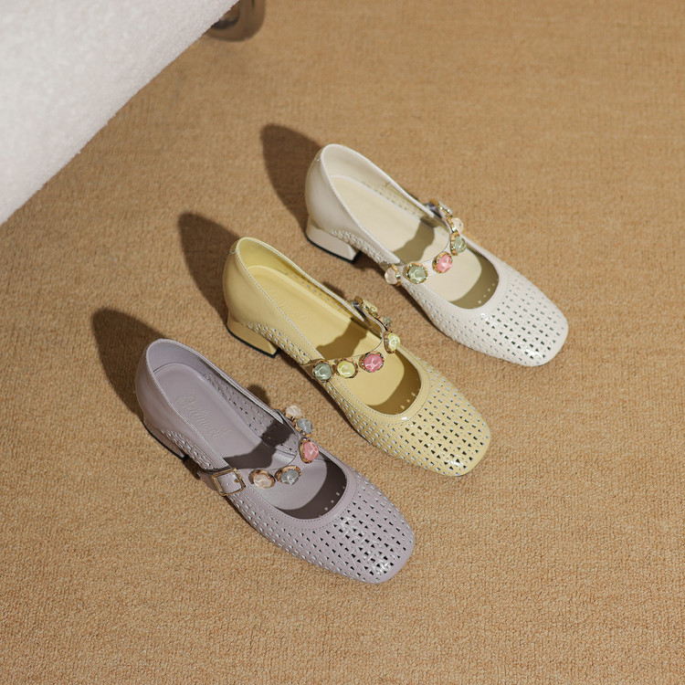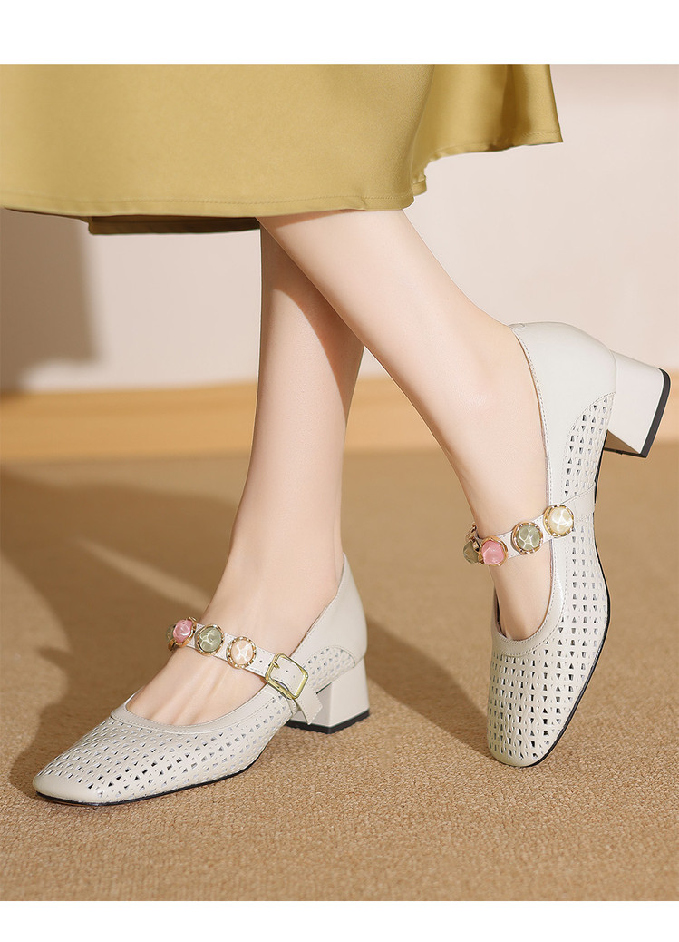 【预售5天】牛皮方头气质一字带单鞋春夏新款编织粗跟百搭休闲鞋女ZF&25098