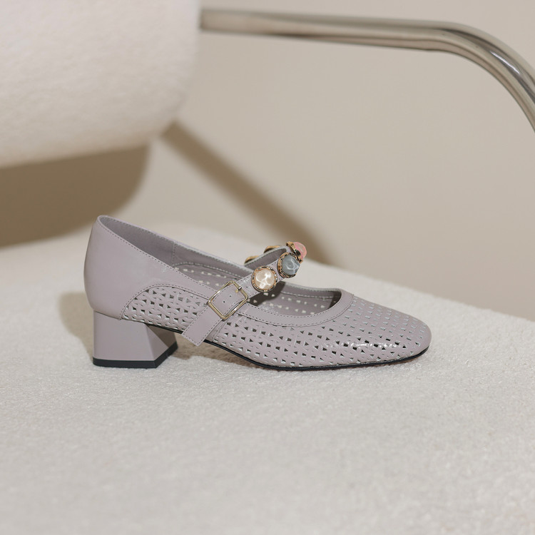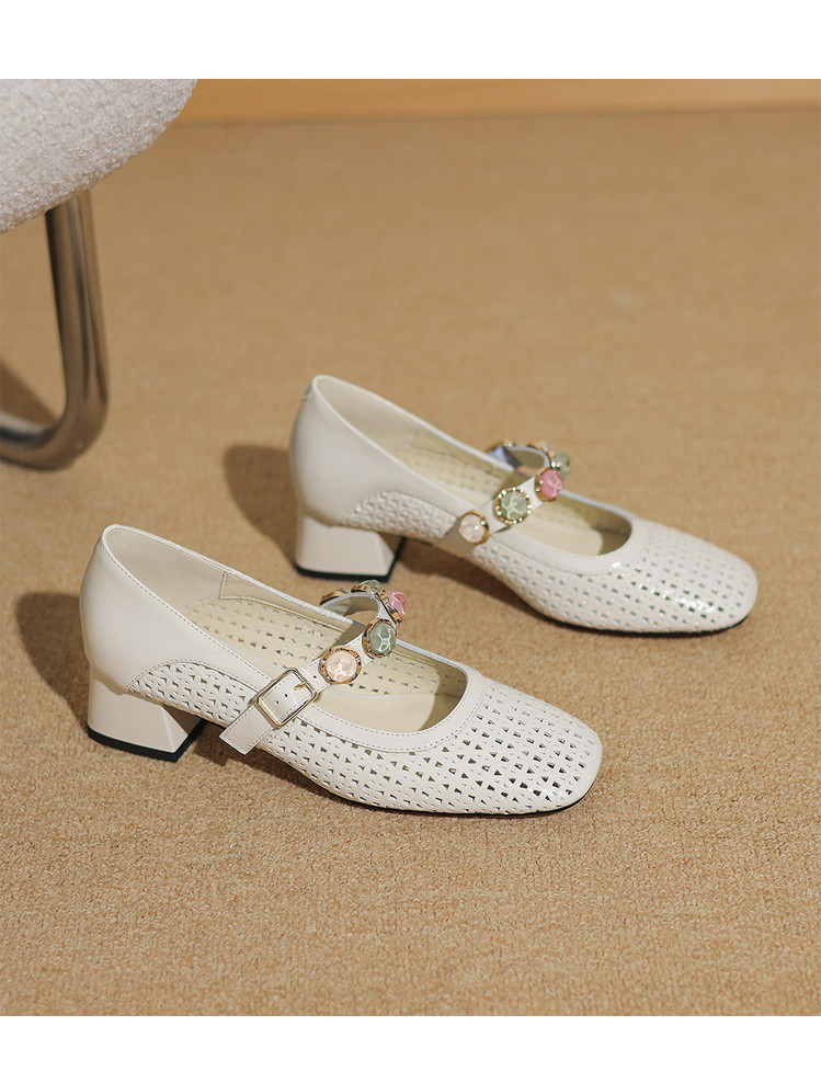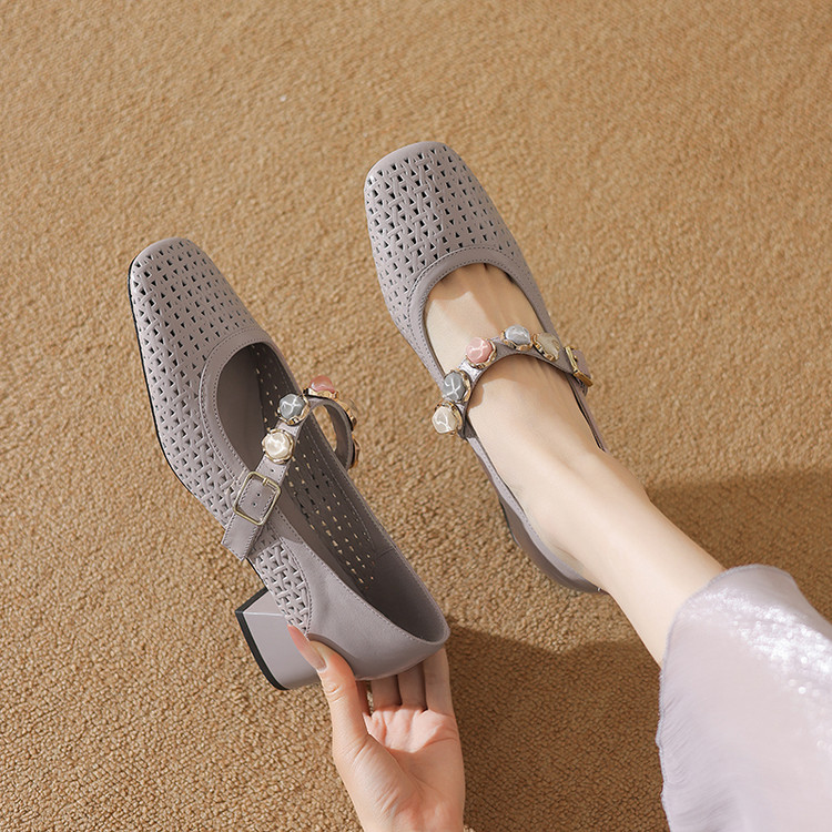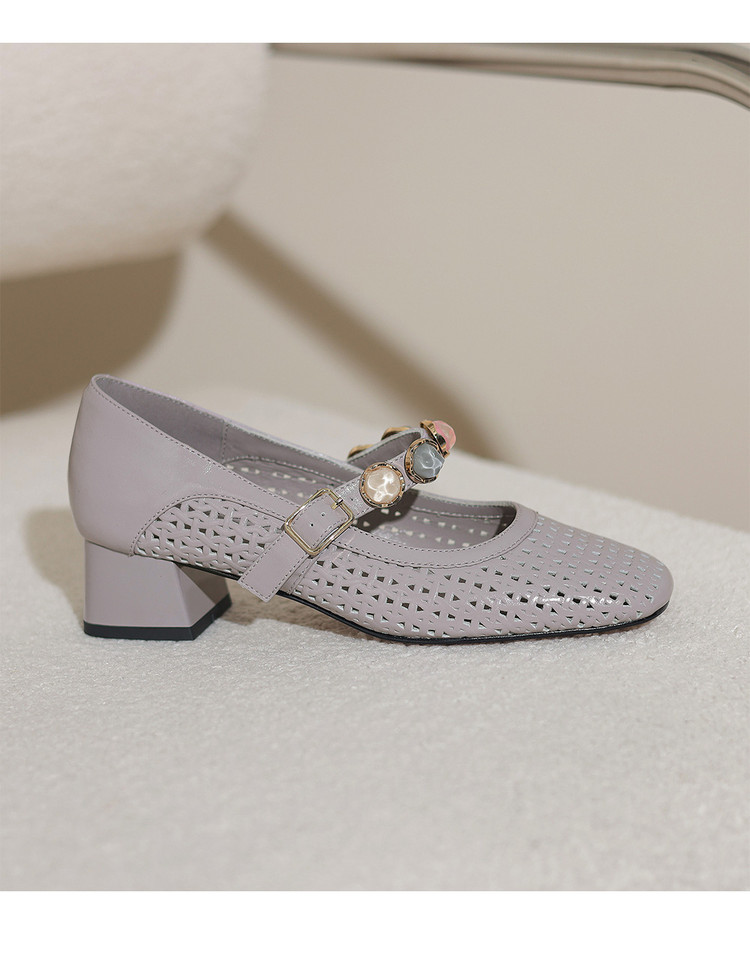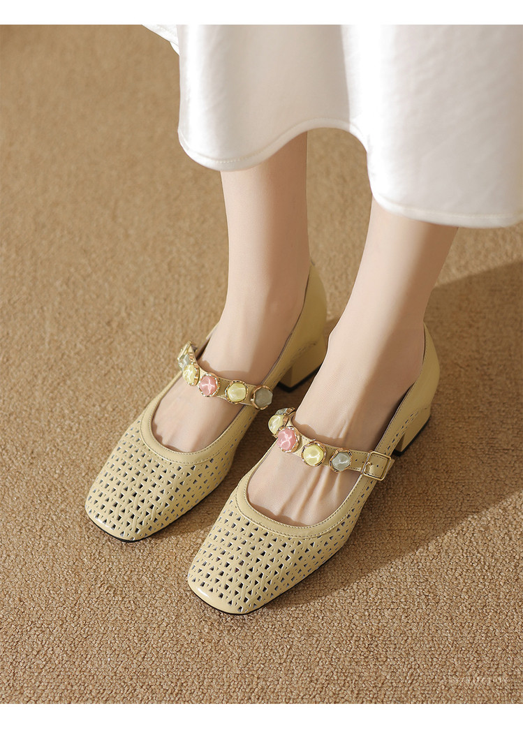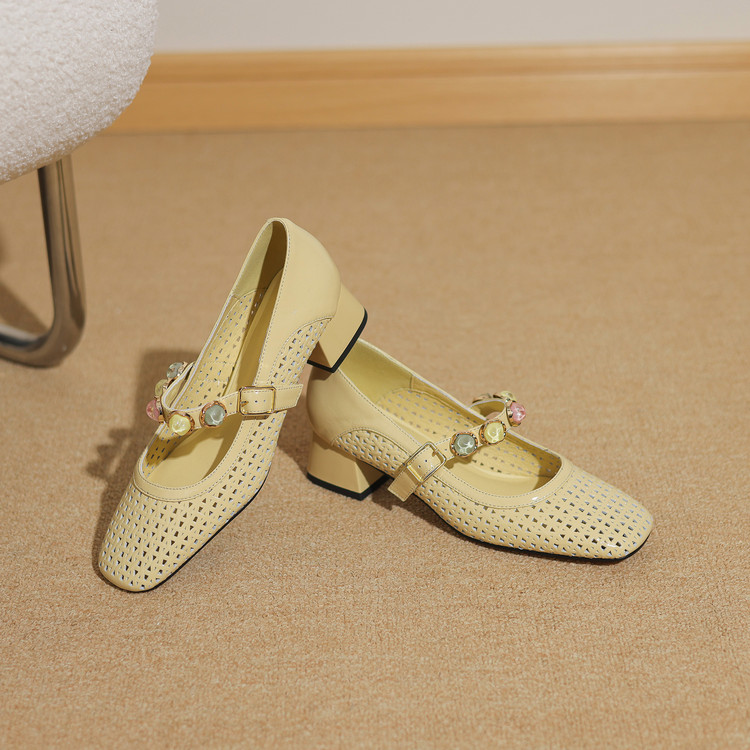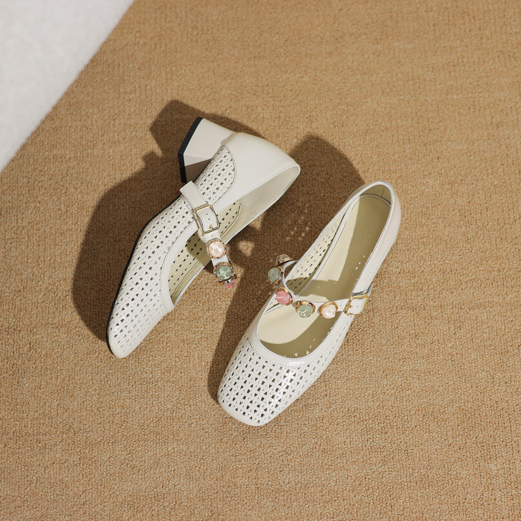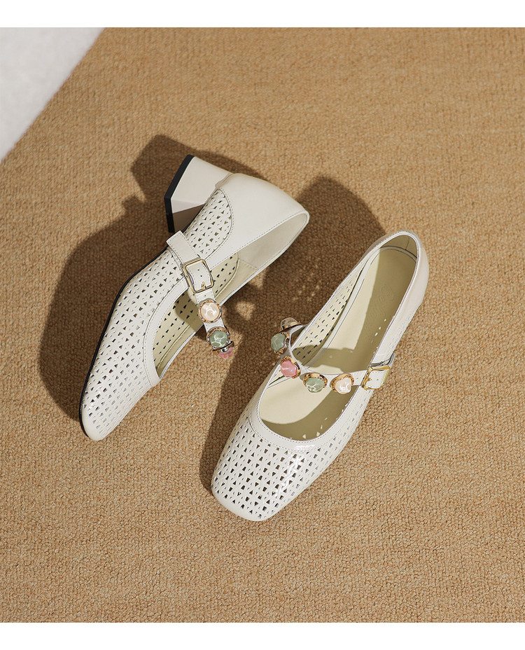 【预售5天】牛皮方头气质一字带单鞋春夏新款编织粗跟百搭休闲鞋女ZF&25098