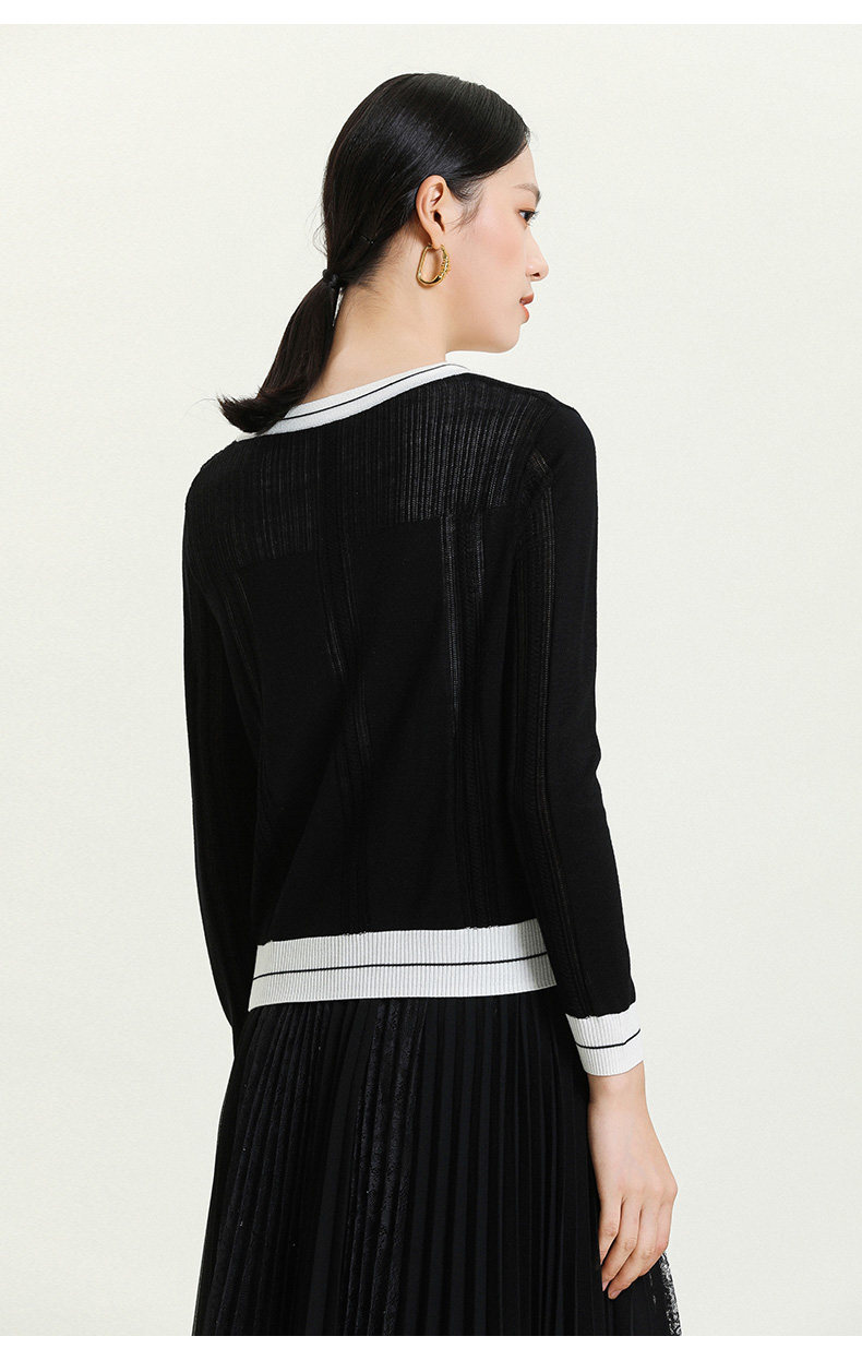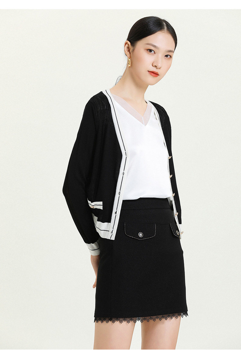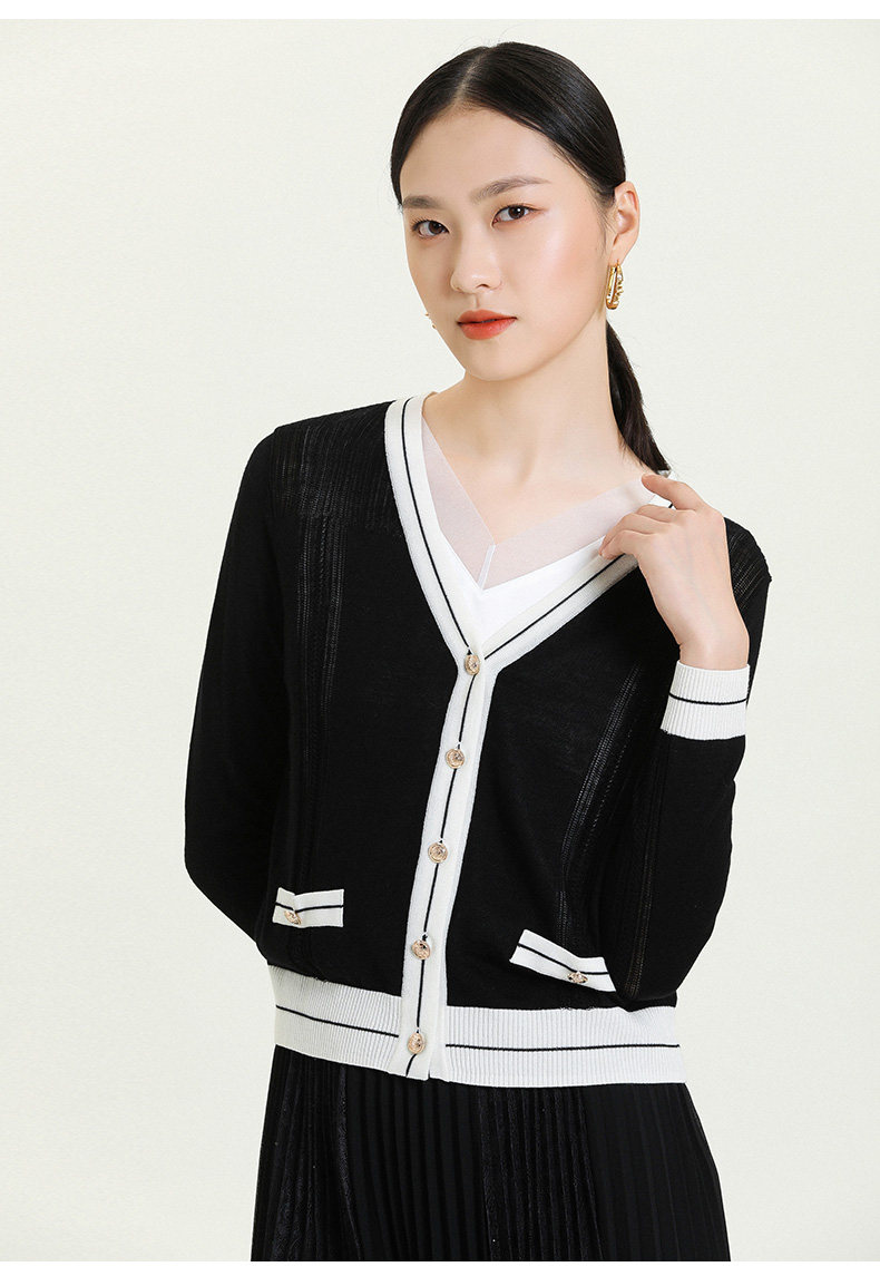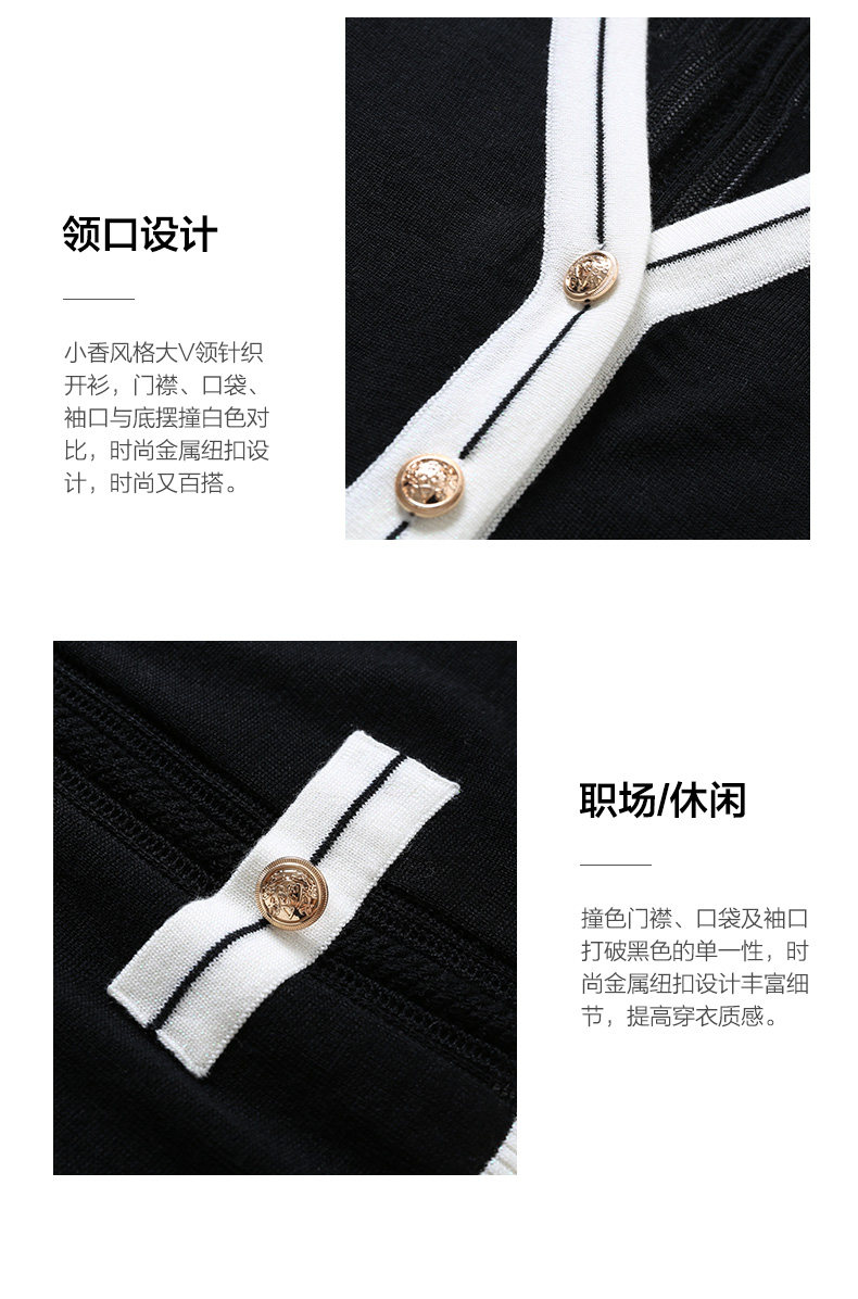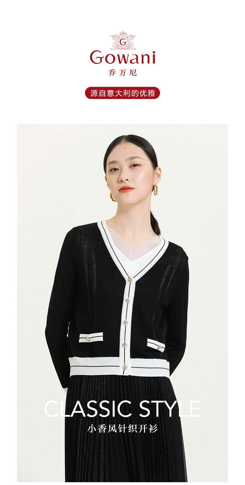 乔万尼秋季新款小香风气质V领针织开衫拼接色百搭设计感外套ES3M589