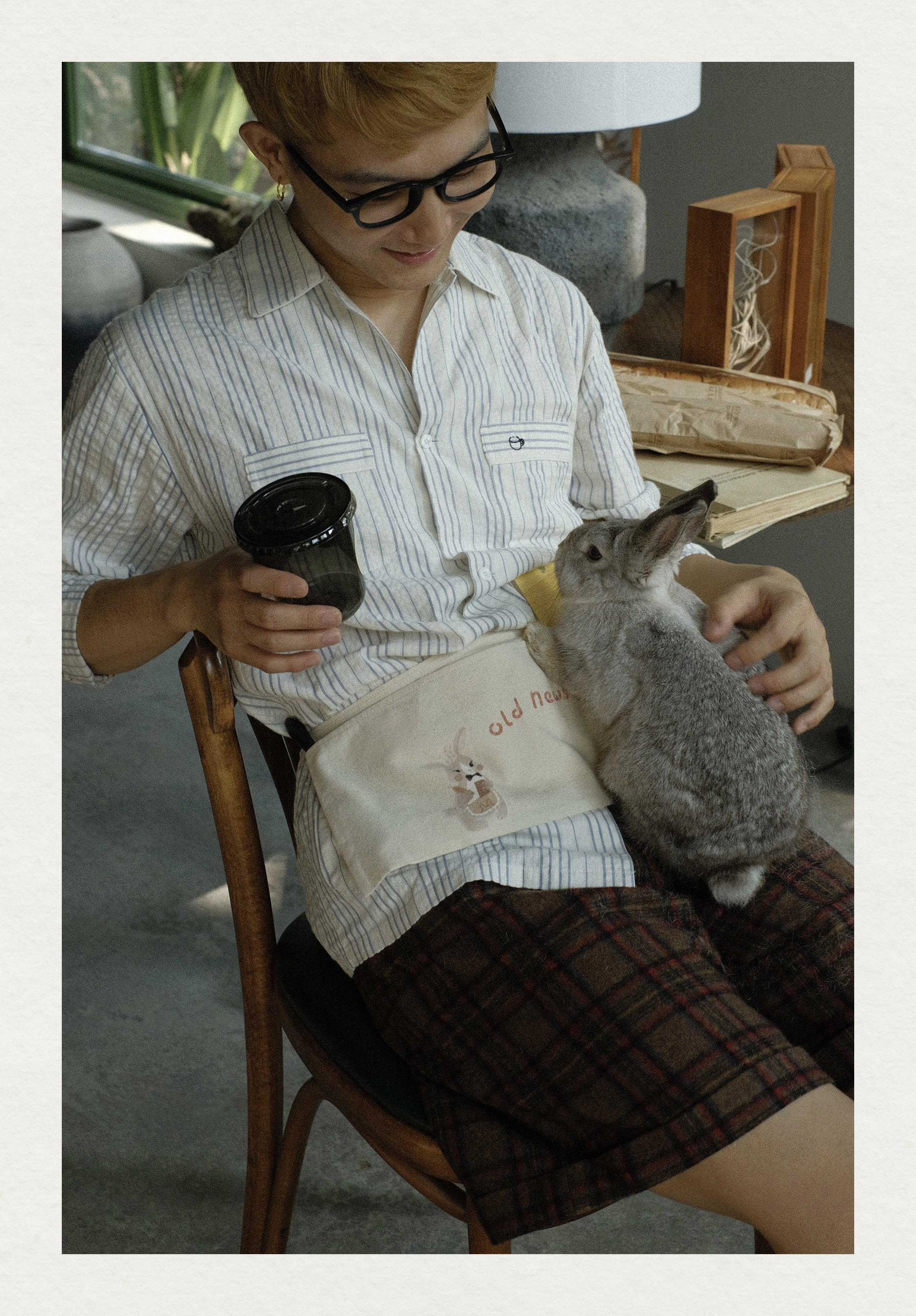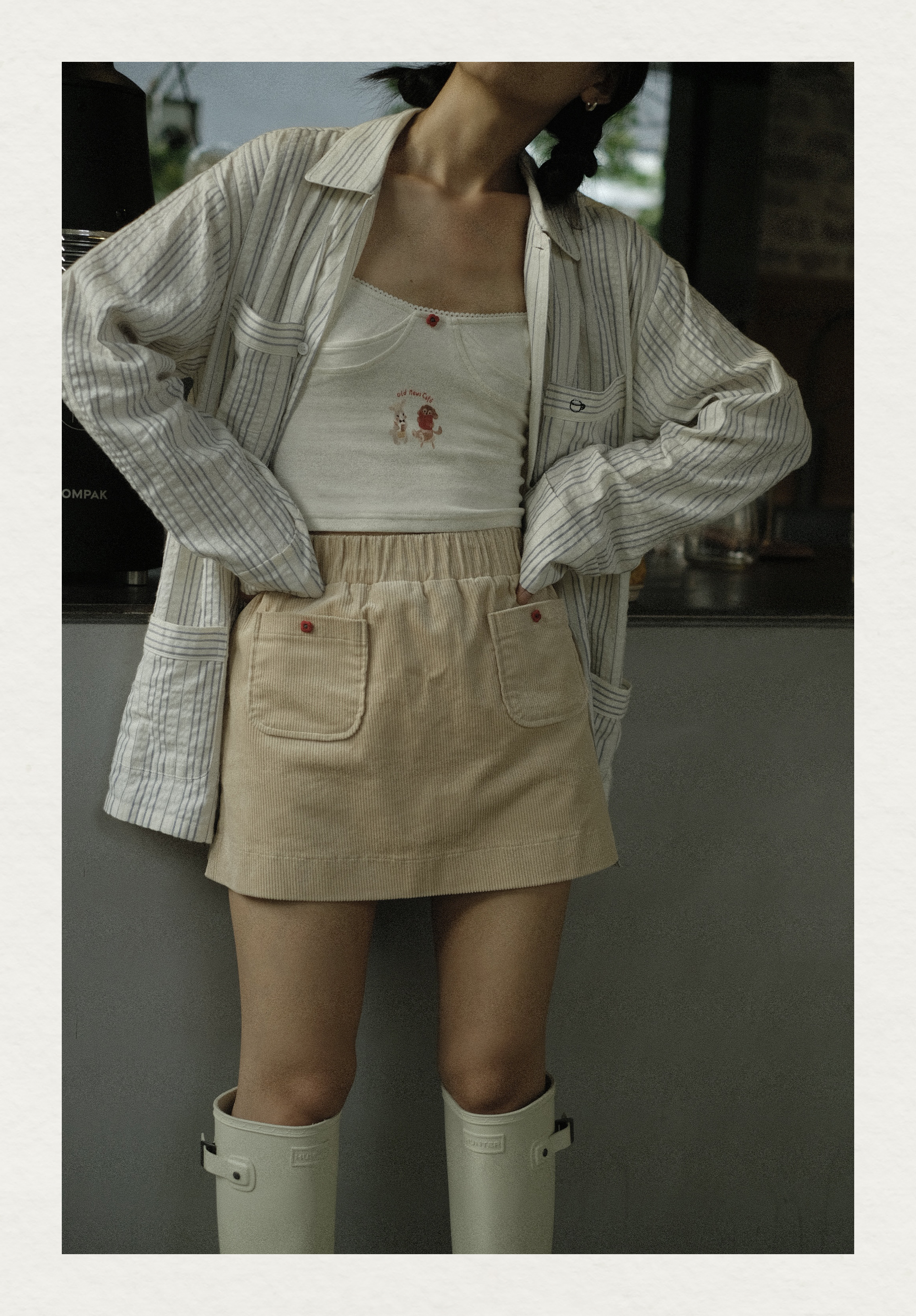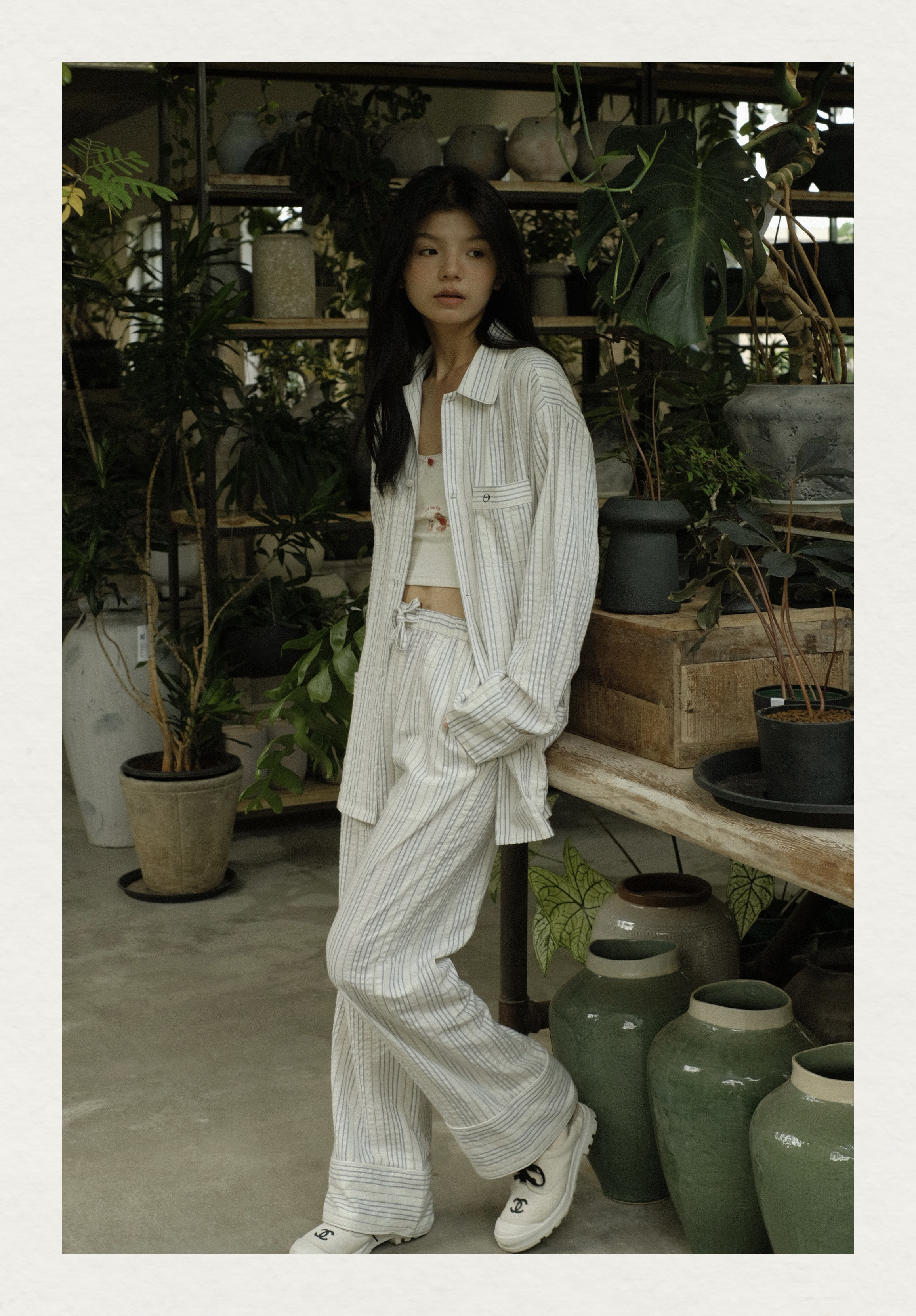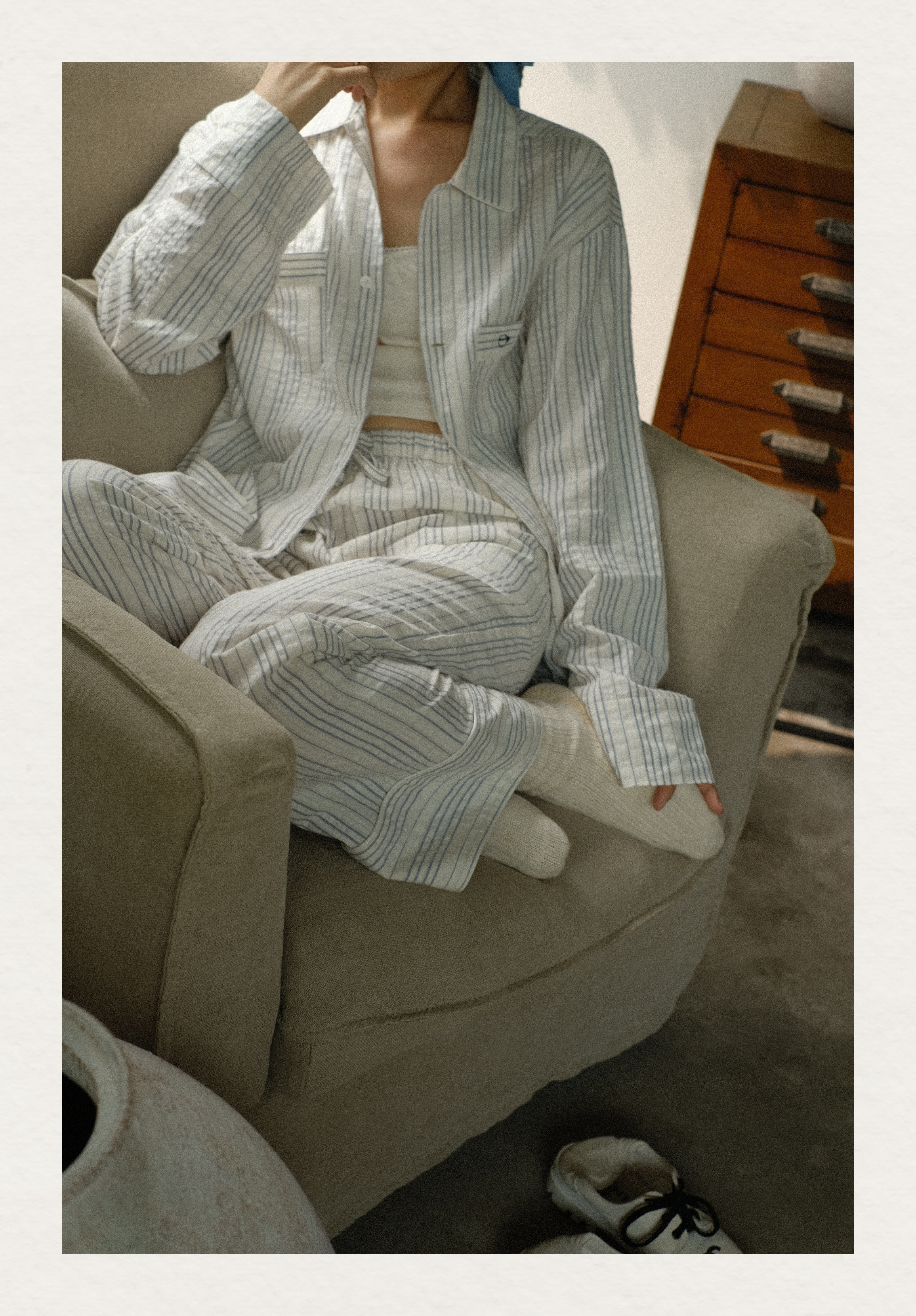 「Espresso Chic」蓝色条纹咖啡杯刺绣衬衫套装