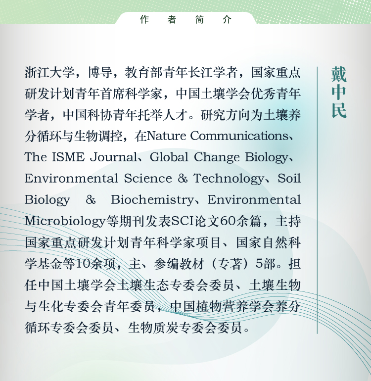 戴中民,浙江大学,博导,教yu部青年长江学者,国家重点研发计划青年shou席科学家,中国土壤学会优秀青年学者,中国科协青年托举人才。研究方向为土壤养分循环与生物调控,在Nature Communications、The ISME Journal、Global Change Biology、Environmental Science & Technology、Soil Biology & Biochemistry、Environmental Microbiology等期刊发表SCI论文60余篇,主持国家重点研发计划青年科学家项目、国家自然科学基金等10余项,主、参编教材(专著)5部。担任中国土壤学会土壤生态专委会委员、土壤生物与生化专委会青年委员,中国植物营养学会养分循环专委会委员、生物质炭专委会委员。