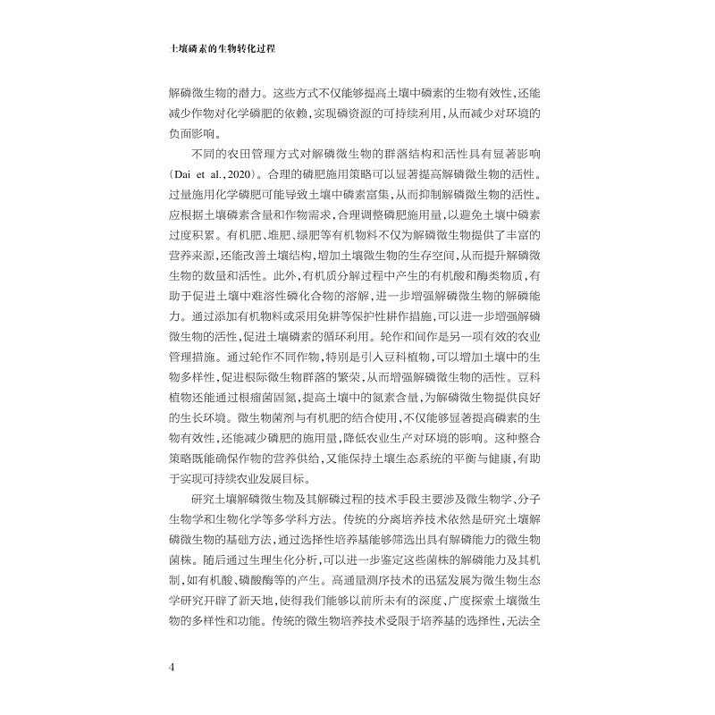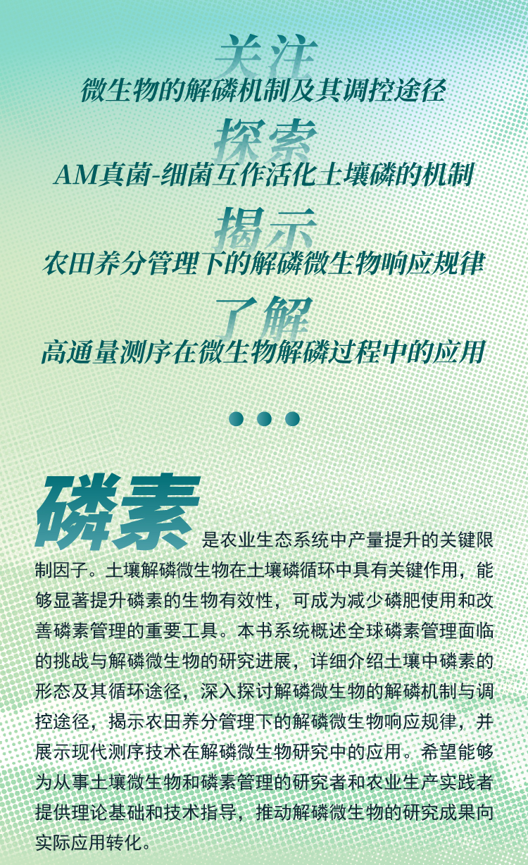 磷素是农业生态系统中产量提升的关键限制因子。土壤解磷微生物在土壤磷循环中具有关键作用,能够显著提升磷素的生物有效性,可成为减少磷肥使用和改善磷素管理的重要工具。本书系统概述全球磷素管理面临的挑战与解磷微生物的研究进展,详细介绍土壤中磷素的形态及其循环途径,深入探讨解磷微生物的解磷机制与调控途径,揭示农田养分管理下的解磷微生物响应规律,并展示现代测序技术在解磷微生物研究中的应用。希望能够为从事土壤微生物和磷素管理的研究者和农业生产实践者提供理论基础和技术指导,推动解磷微生物的研究成果向实际应用转化。