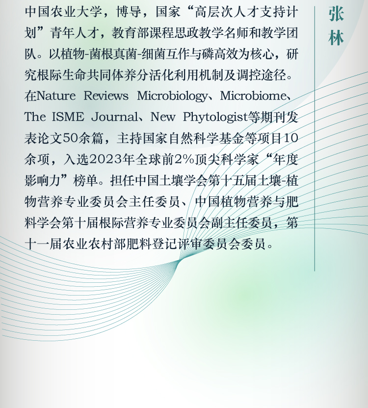 张林,中国农业大学,博导,国家“高ceng次人才支持计划”青年人才,教yu部课程思政教学名师和教学团队。以植物-菌根真菌-细菌互作与磷高效为核心,研究根际生命共同体养分活化利用机制及调控途径。在Nature Reviews Microbiology、Microbiome、The ISME Journal、New Phytologist等期刊发表论文50余篇,主持国家自然科学基金等项目10余项,入选2023年全球前2%dingjian科学家“年度影响力”榜单。担任中国土壤学会第十五届土壤-植物营养专业委员会主任委员、中国植物营养与肥料学会第十届根际营养专业委员会副主任委员,第十一届农业农村部肥料登记评审委员会委员。