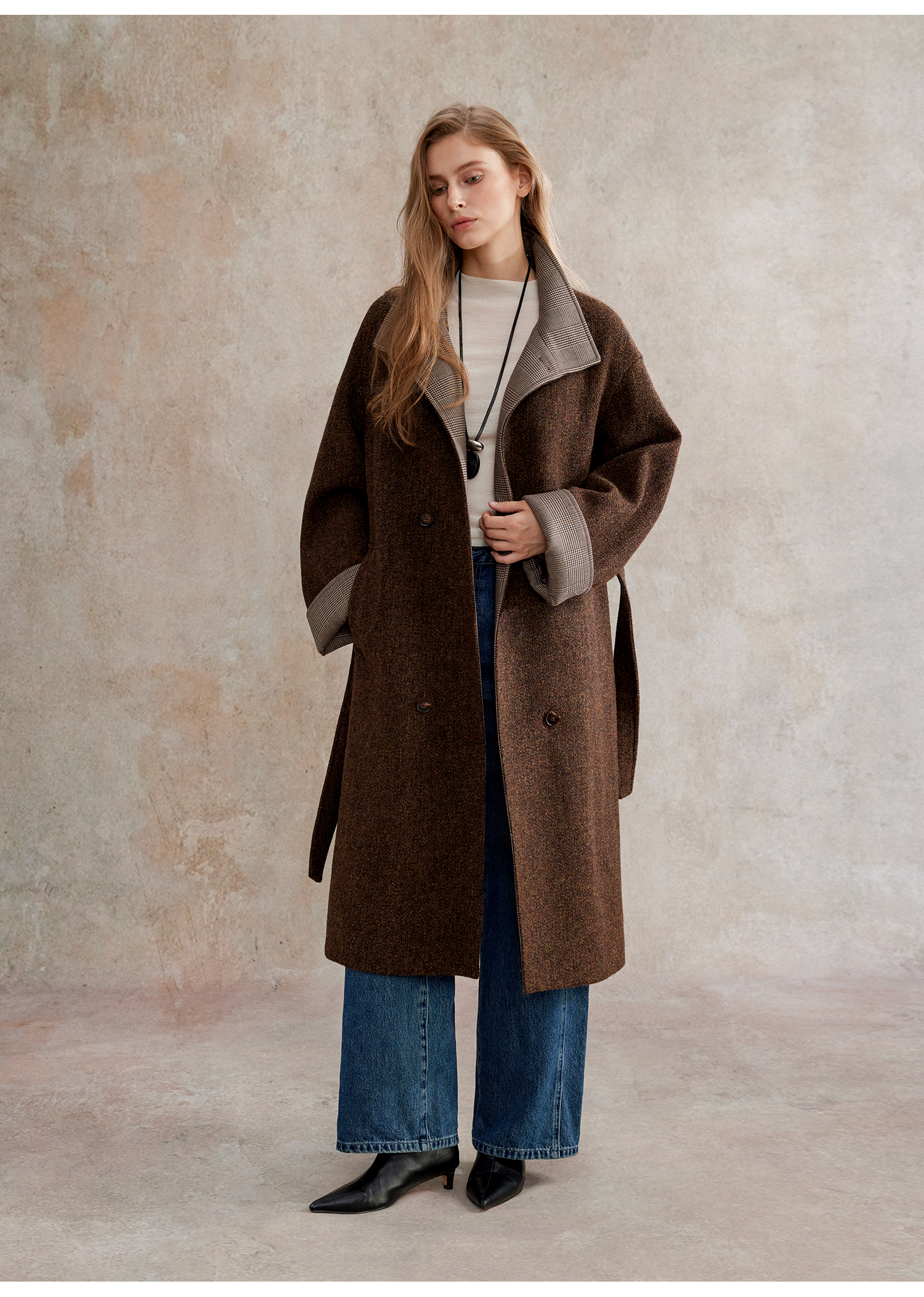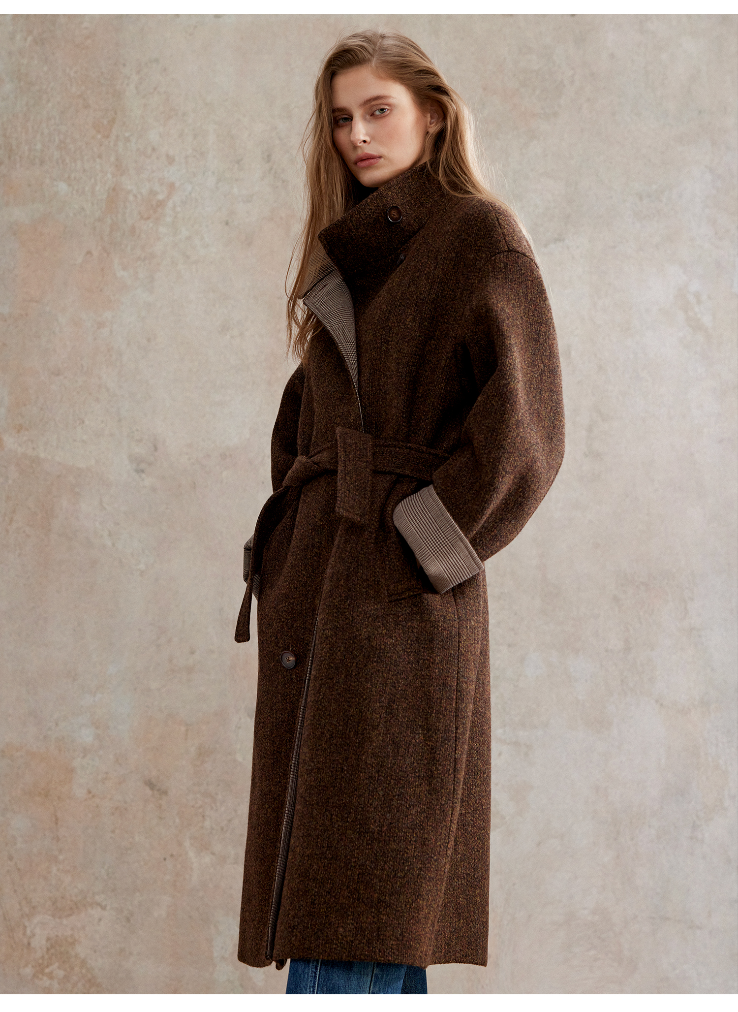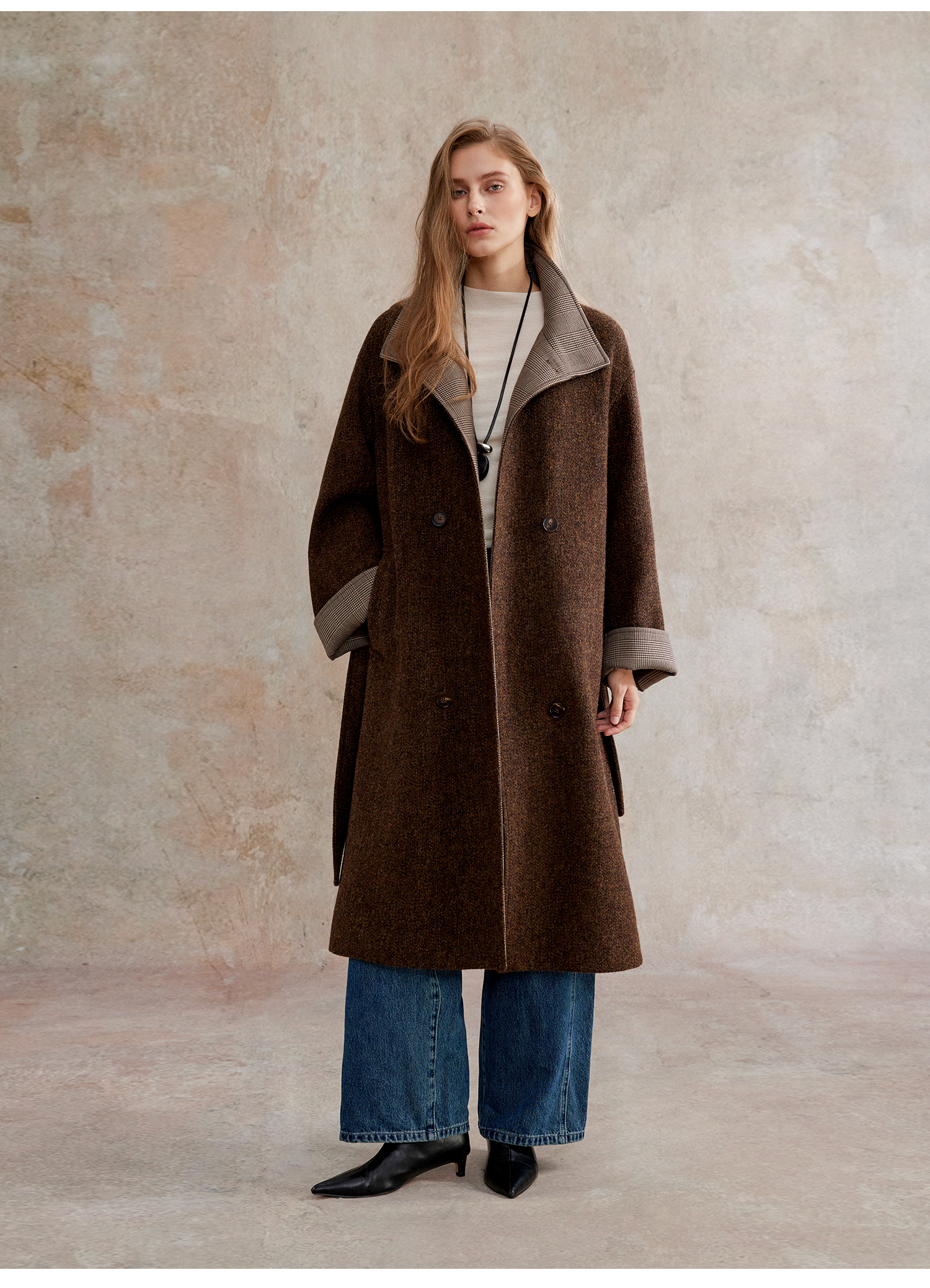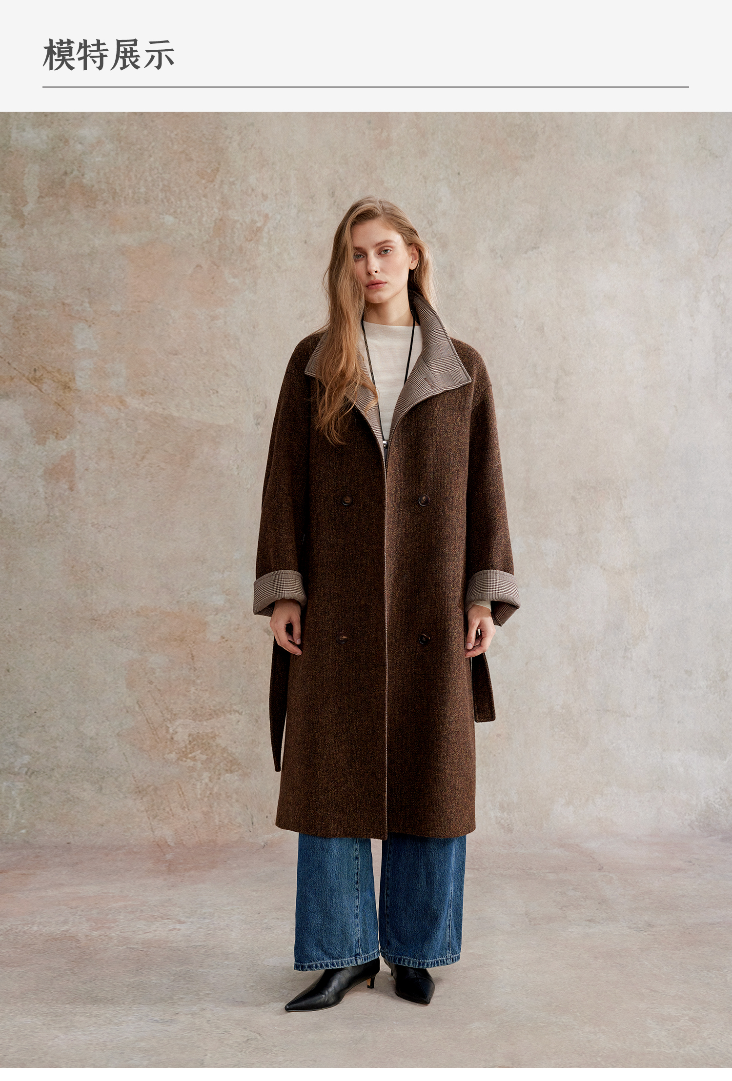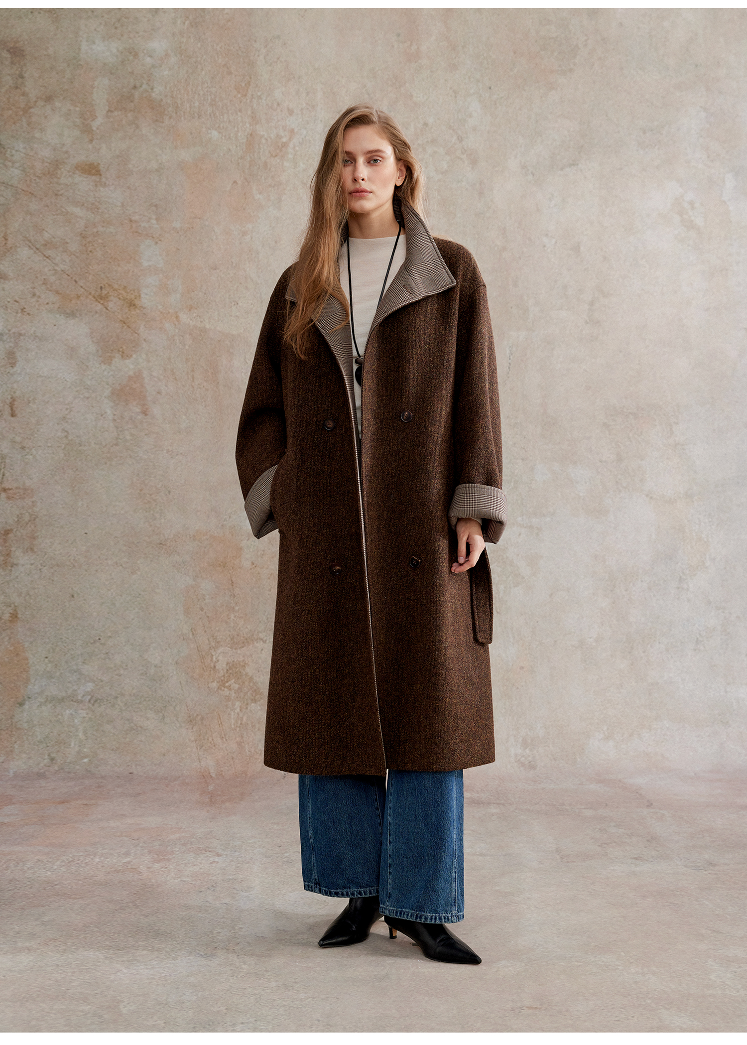 花纱羊毛撞色拼接双排扣长款复古单面毛呢大衣