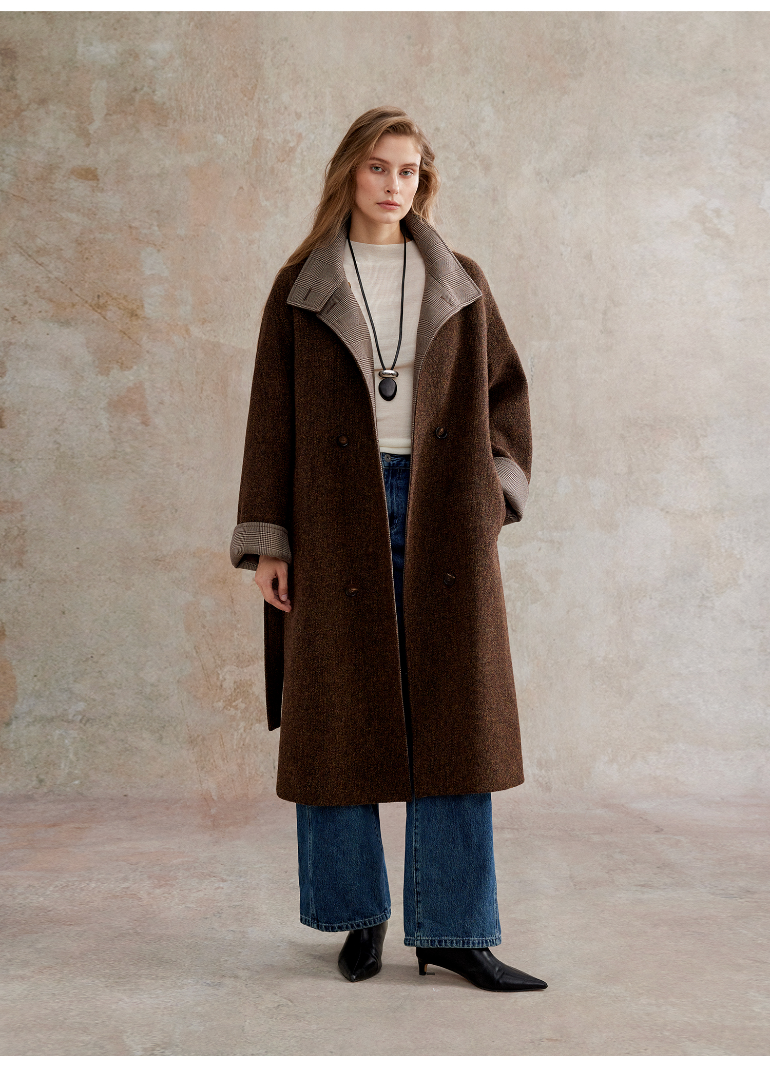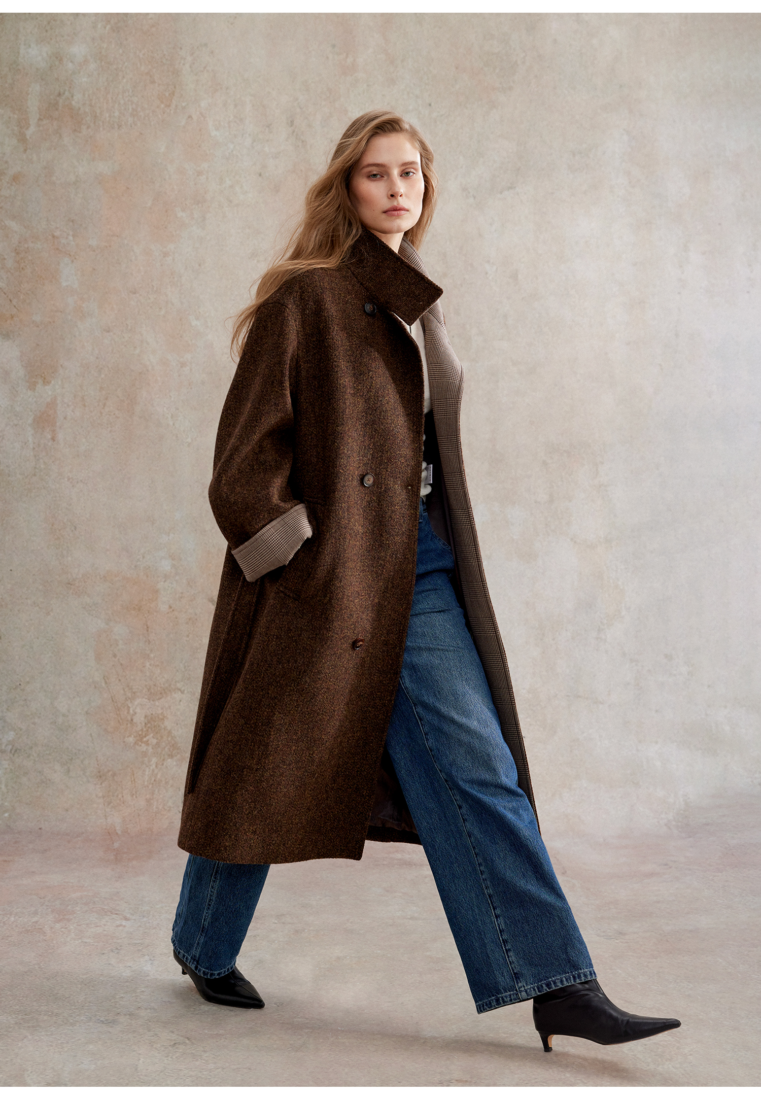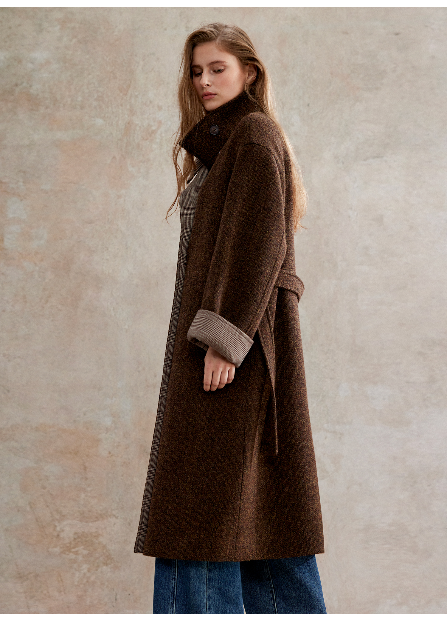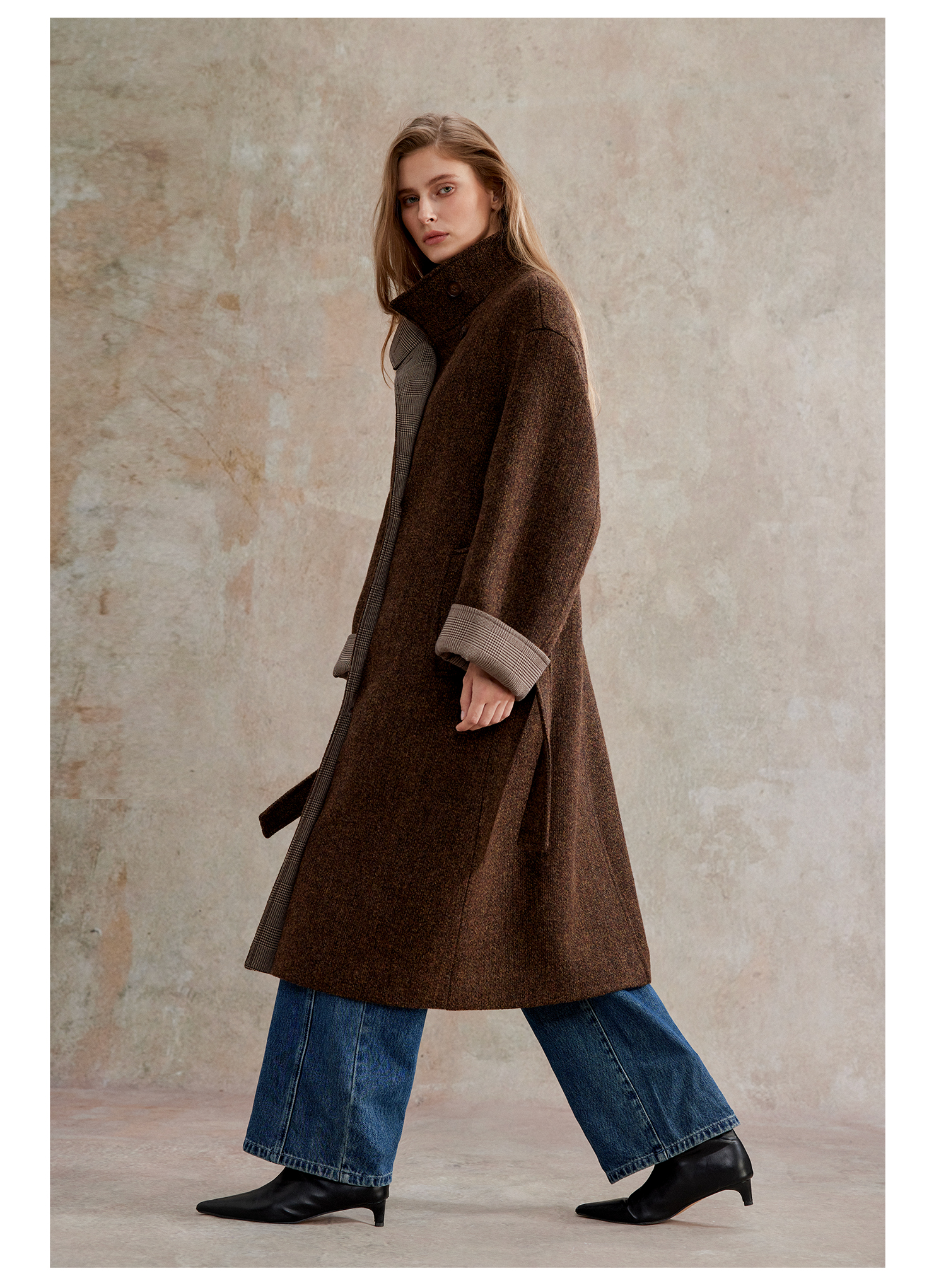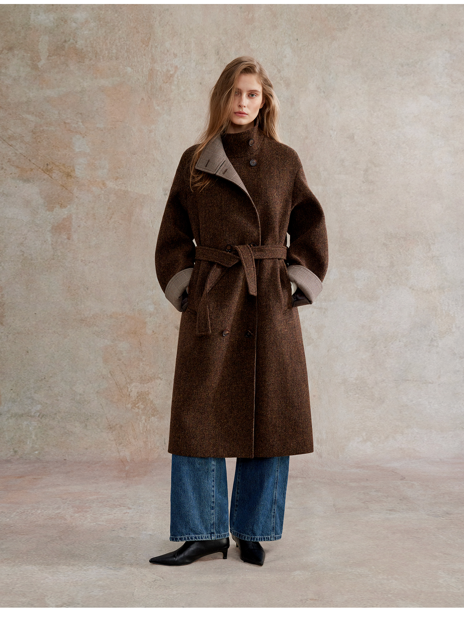 花纱羊毛撞色拼接双排扣长款复古单面毛呢大衣